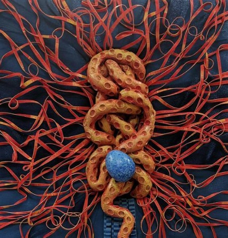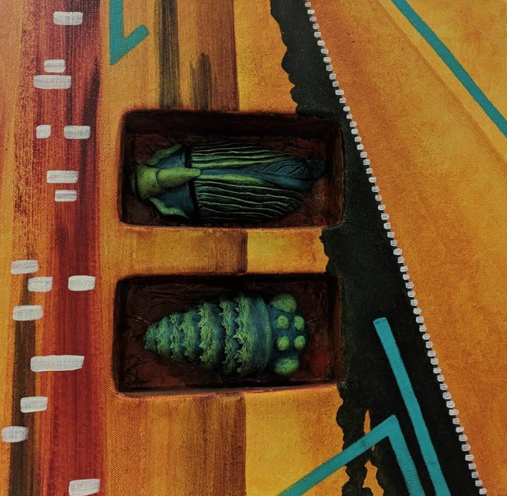Frankie Wolf is a self-taught artist who has been practicing for over 50 years. She considers her work to be narrative and symbolic in nature, with an appreciation for abstraction and distortion. She looks for ways to capture the beauty of the strange. Her work often explores her fascination with global mythology and guising which includes influences from folk art, horned deities, petroglyphs and wild man/woman representations. She also finds interest in the gritty imperfections of life, the gaps that are often overlooked and subjects that are not normally highlighted in the mainstream. She was the featured artist at The Cellar in 1994 with Palooza People, which included a permanent mural and installation. Her solo show First Folk was held at the Koger Center for the Arts Donor Room in 1996. Between 1985 and 1998 she was invited to create numerous illustrations for local businesses and publications including a comic zine and various pieces for Columbia's famed Rockafellas. More recently she exhibited her Tokens series at Cool Beans in 2016 and was the featured artist for USC's Southern Exposure in 2018 with Duo Cortona. She has just been accepted into the National Art Center, Tokyo for the second year in a row at the 25th Annual Salon Blanc International Exhibition of Contemporary Art, 2021. She is also in the process of establishing a personal collection called 'Final Howl' which will begin debuting its first pieces in 2021.