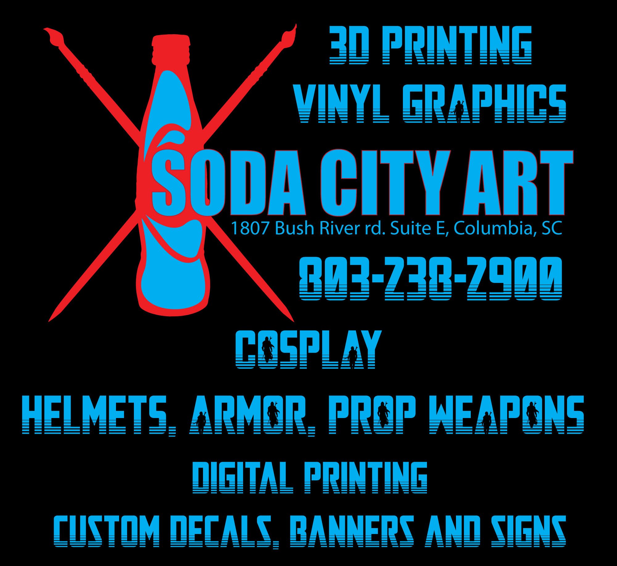 Soda City Art provides a unique blend of graphic design services and digital printing. From 3d printing and more traditional 2d digital printing, vinyl decals and stickers, dtg t-shirts, art prints, vehicle graphics and wrap design, window graphics, signage and banners, business cards...if it can be printed, Soda City Art can probably make it. We have converted our studio on Bush River Road into the ultimate maker space, where we create amazing 3d printed props for cosplay and beyond. We get a lot of comments on the level of detail and artistry that goes into our helmets, armor, prop weapons, and even reproductions and functional 3d printed parts. If you need a custom-made helmet or armor for cosplay, this is the place to go. Getting a custom-made item from Soda City Art is like an epic loot drop in real life.