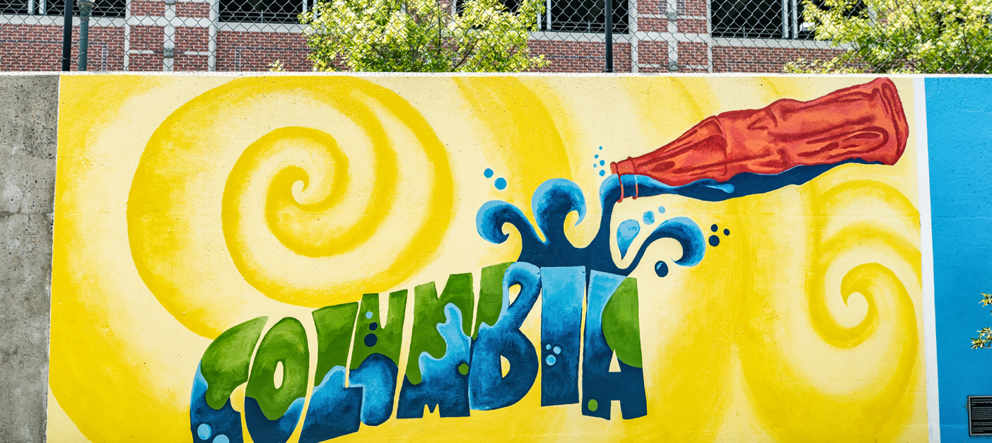 “A Watermarked Soda City,” captures a message of compassion and love for our community. Anchored in light, the fusion between water and sun in this mural pays tribute to our city’s ability to unite and overcome the tragic flood of 2015. Water flowing from the soda bottle represents both the natural disaster that overtook our lands, and the spirit and passion that poured into the city’s rebuild effort. We are Columbia, strong above water and below it.