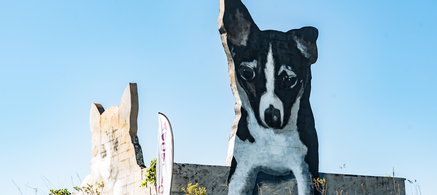 Completed in February 1999, the mural/sculptural piece features a gray and white cat and a black puppy. The mural was completed in conjunction with the ground-breaking of the new City of Columbia pet adoption center.