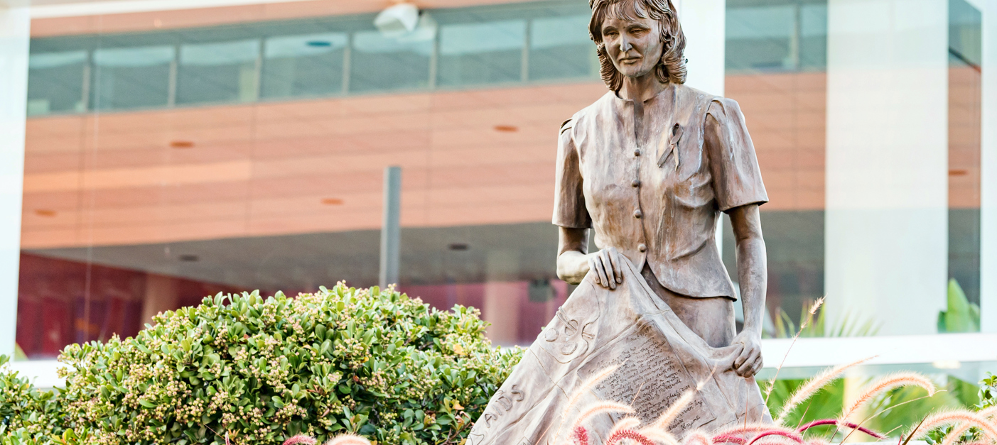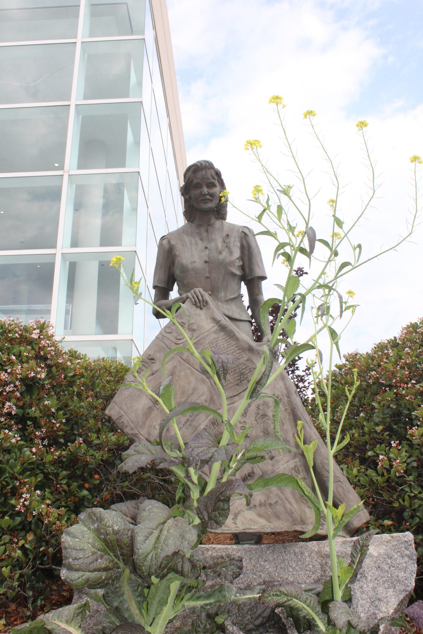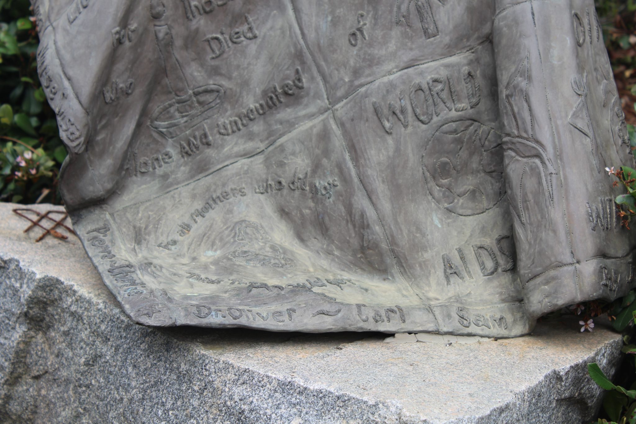 This bronze sculpture depicts a 5’2″ woman holding an unfurled quilt emblazoned with inspirational panels and the seal of the AIDS Benefit Foundation of South Carolina. The piece was installed at the Koger Center for the Arts in 2003 as a tribute to the University of South Carolina’s commitment to AIDS research and education.