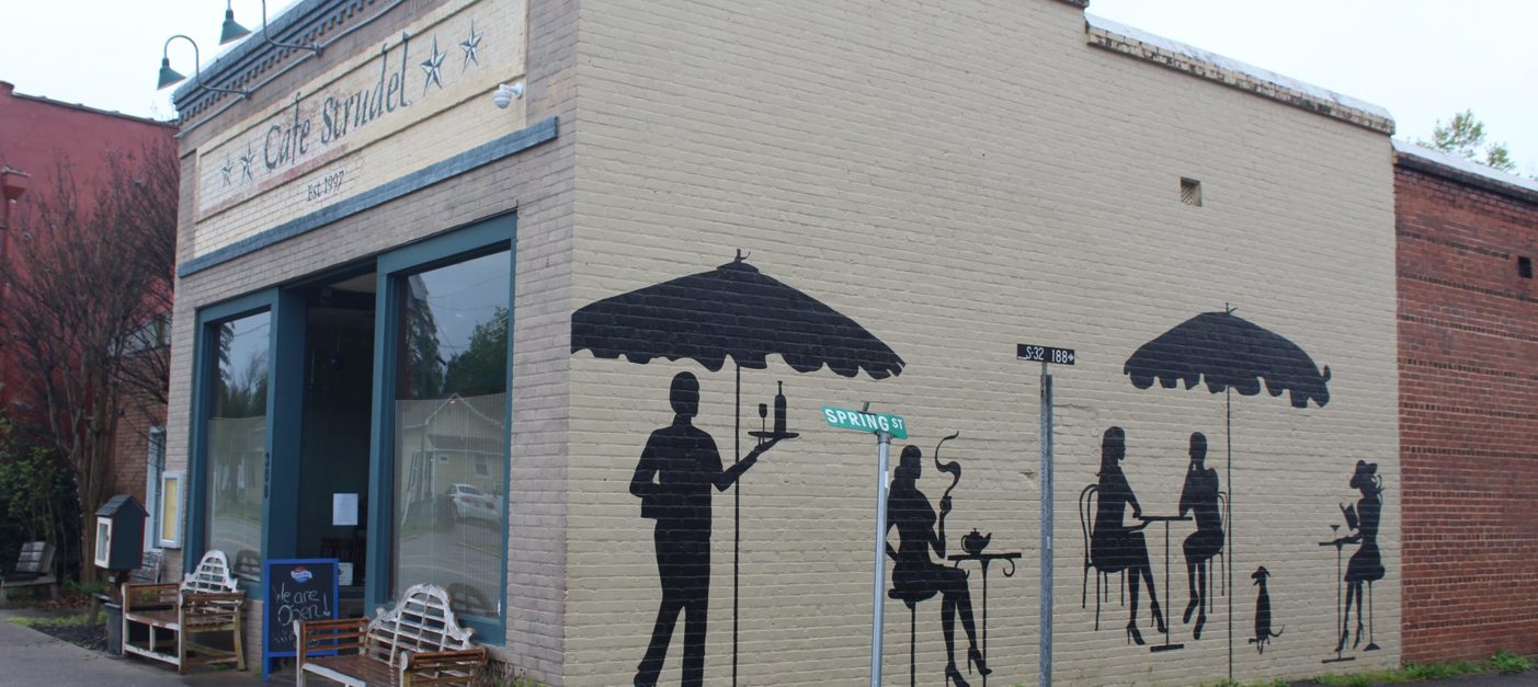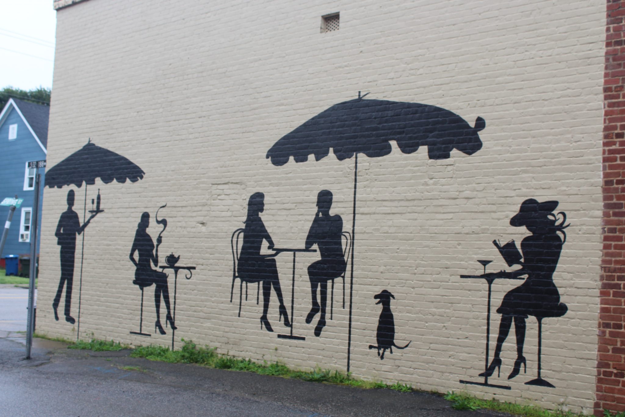 This mural was a collaboration of talented artists, Pam Collins and Sergio Braga. They depict individuals of silhouettes dining and enjoying a good time just like they would inside Cafe Strudel. Cafe Strudel is a buzzy cafe & espresso bar known for their hangover hash browns serves all-day eats plus beer & wine.