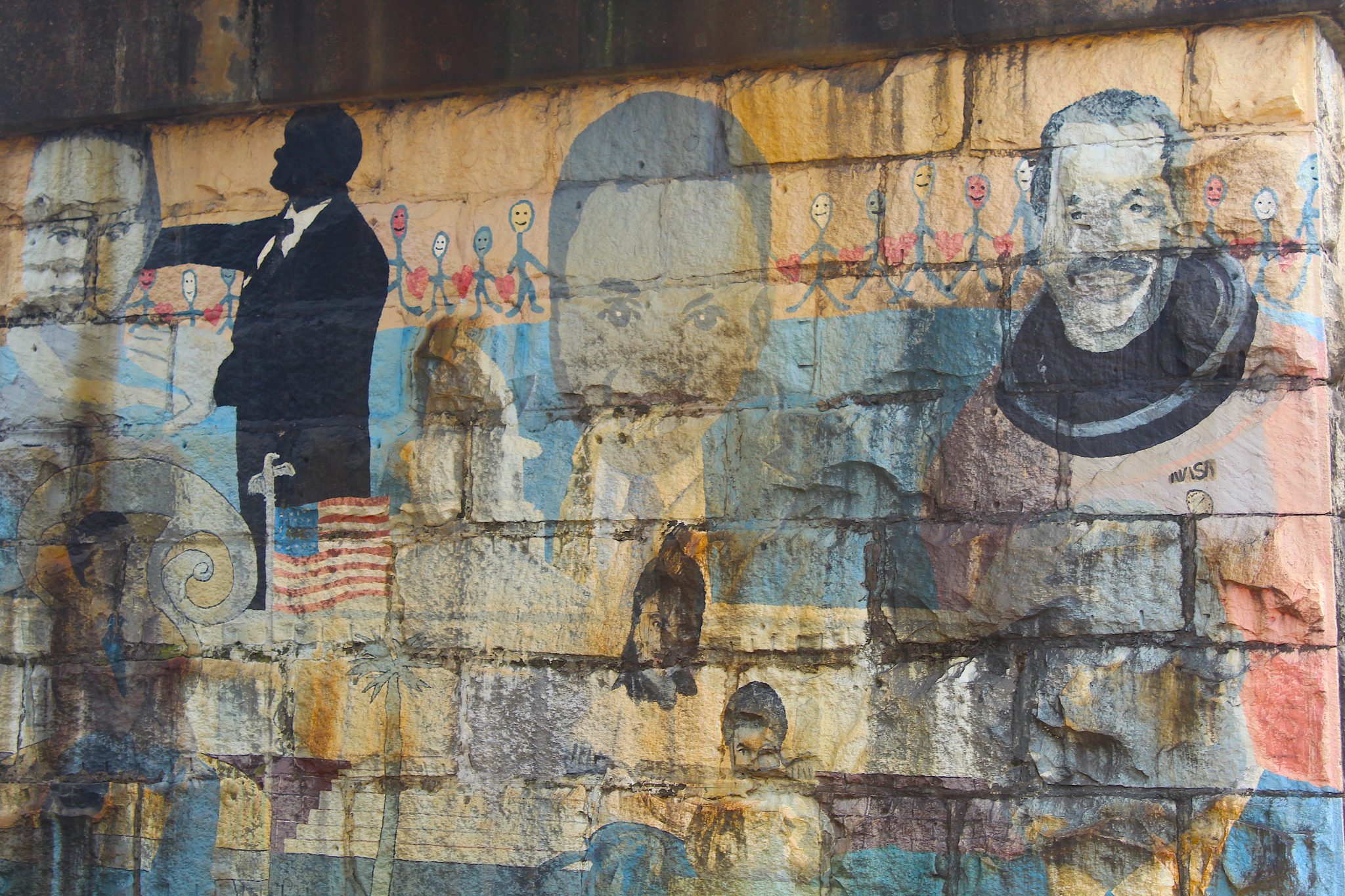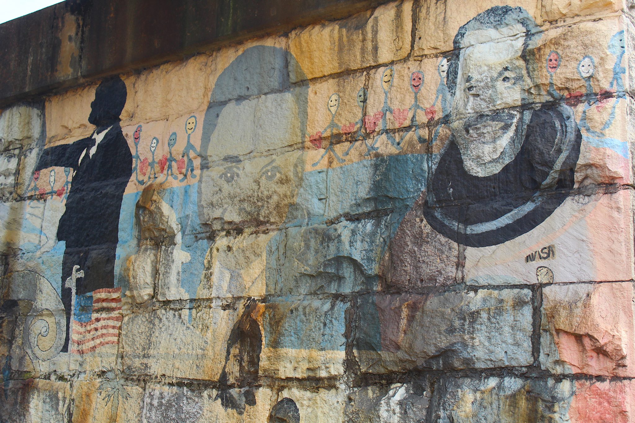 Judi Battiste coordinated the project with 24 Alcorn Middle School students, and it was supposed to be painted only on one wall. By the time it was completed in 1995, it was so large it had to be spread to both walls of the railroad trestle.