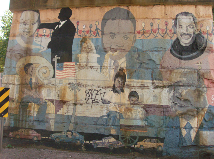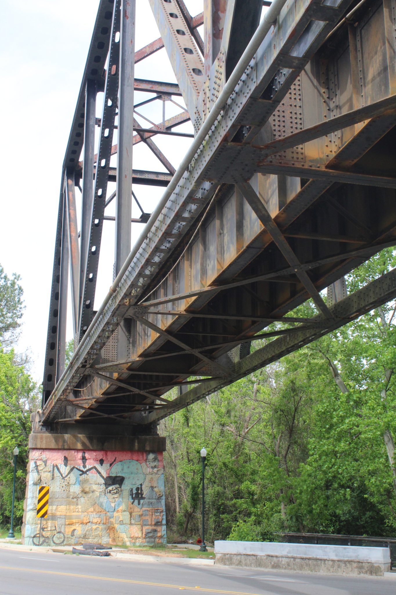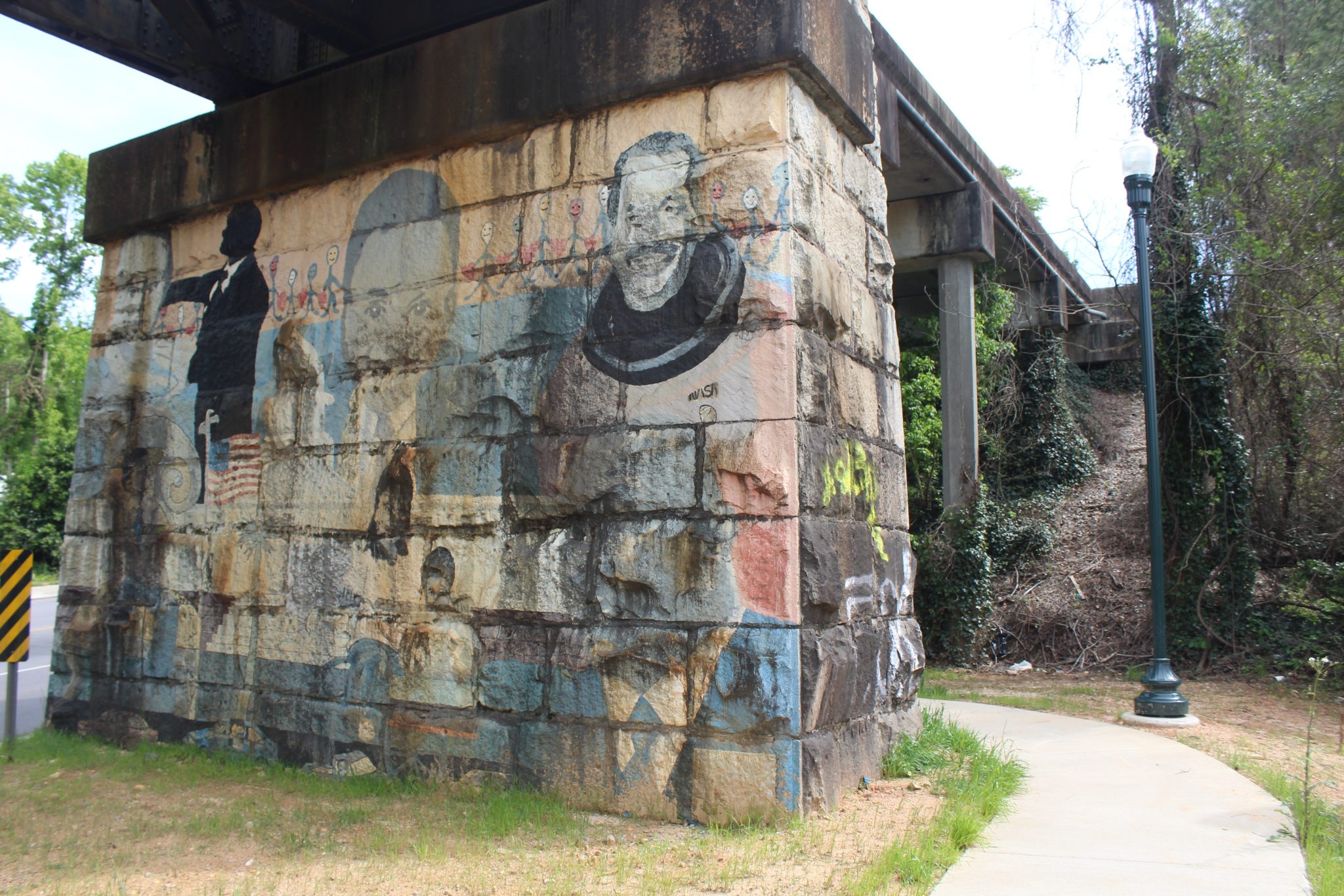 Ralph Waldrop also has done several murals around town, one of which is passed by thousands of motorists each day. Formally called “Capital City Times” but more commonly known as “The Black Mural,” it is painted on both supports of the North Main Street railroad trestle at the entrance to Earlewood Park.