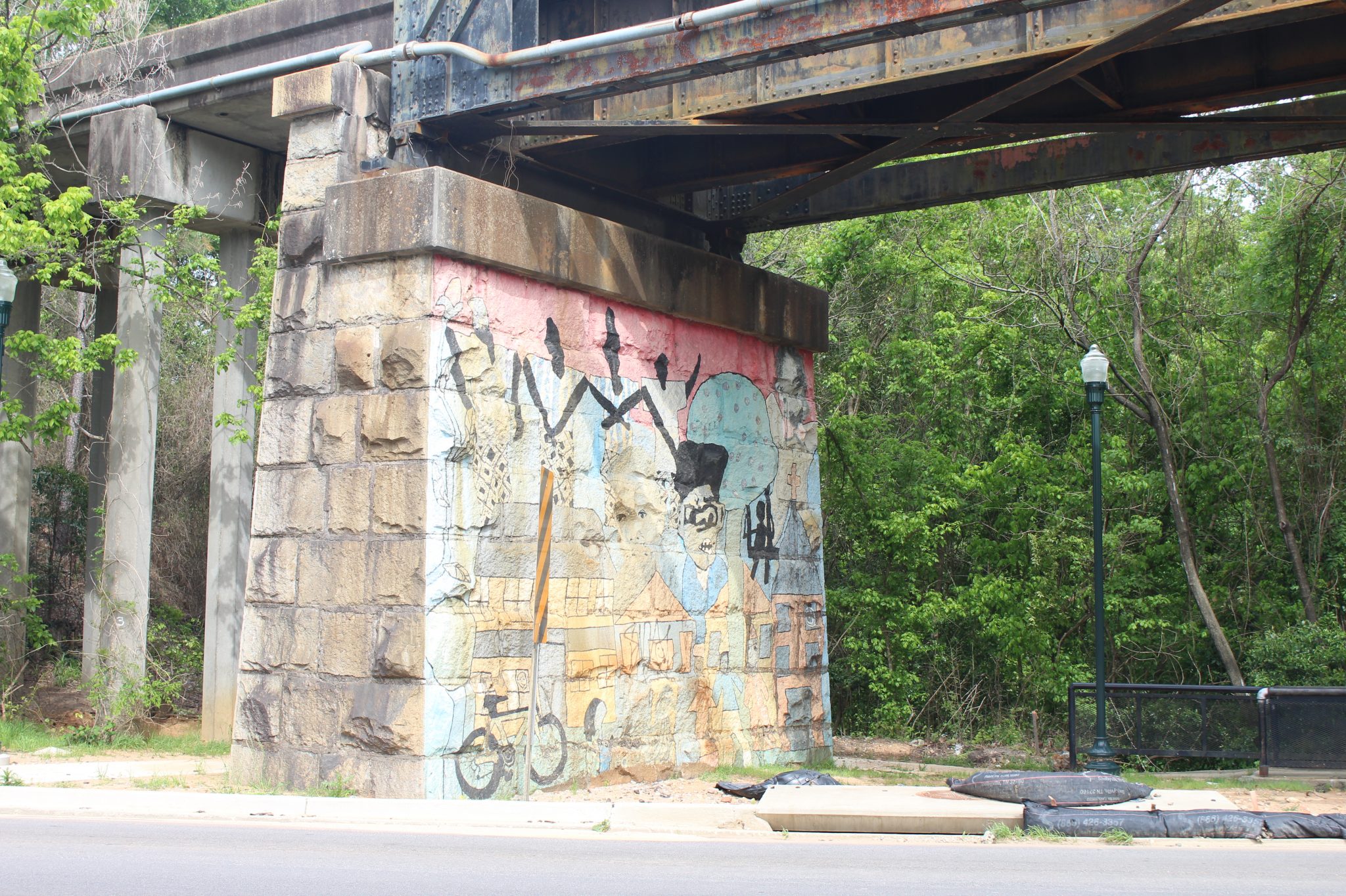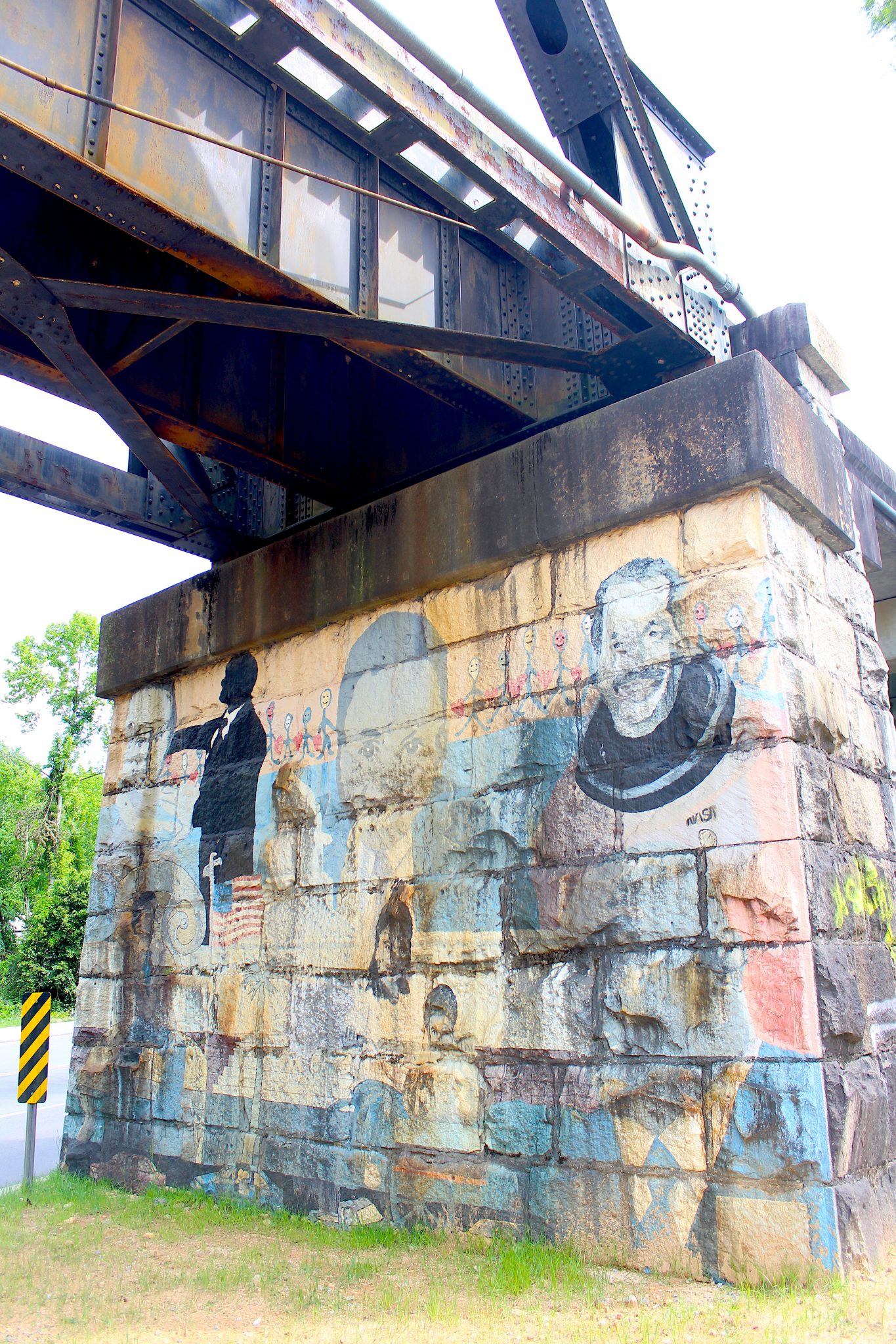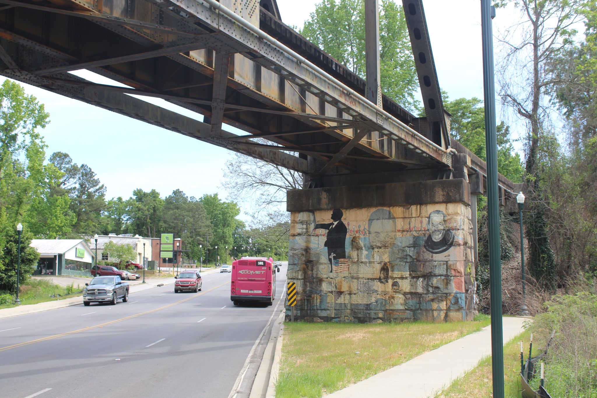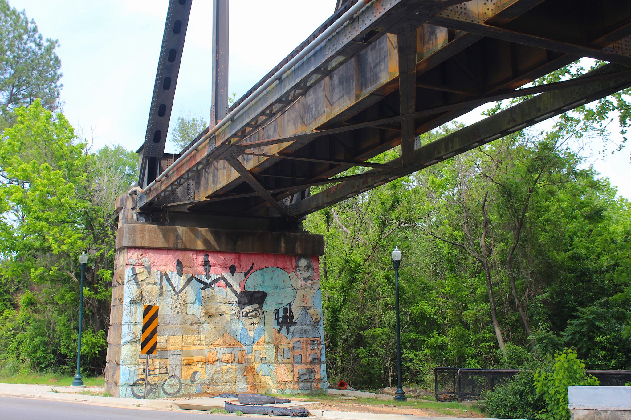 It’s painted on both supports of a North Main Street railroad trestle at the entrance to Earlewood Park. Waldrop had help with this mural from artist Vanessa Ashford– Bussy.