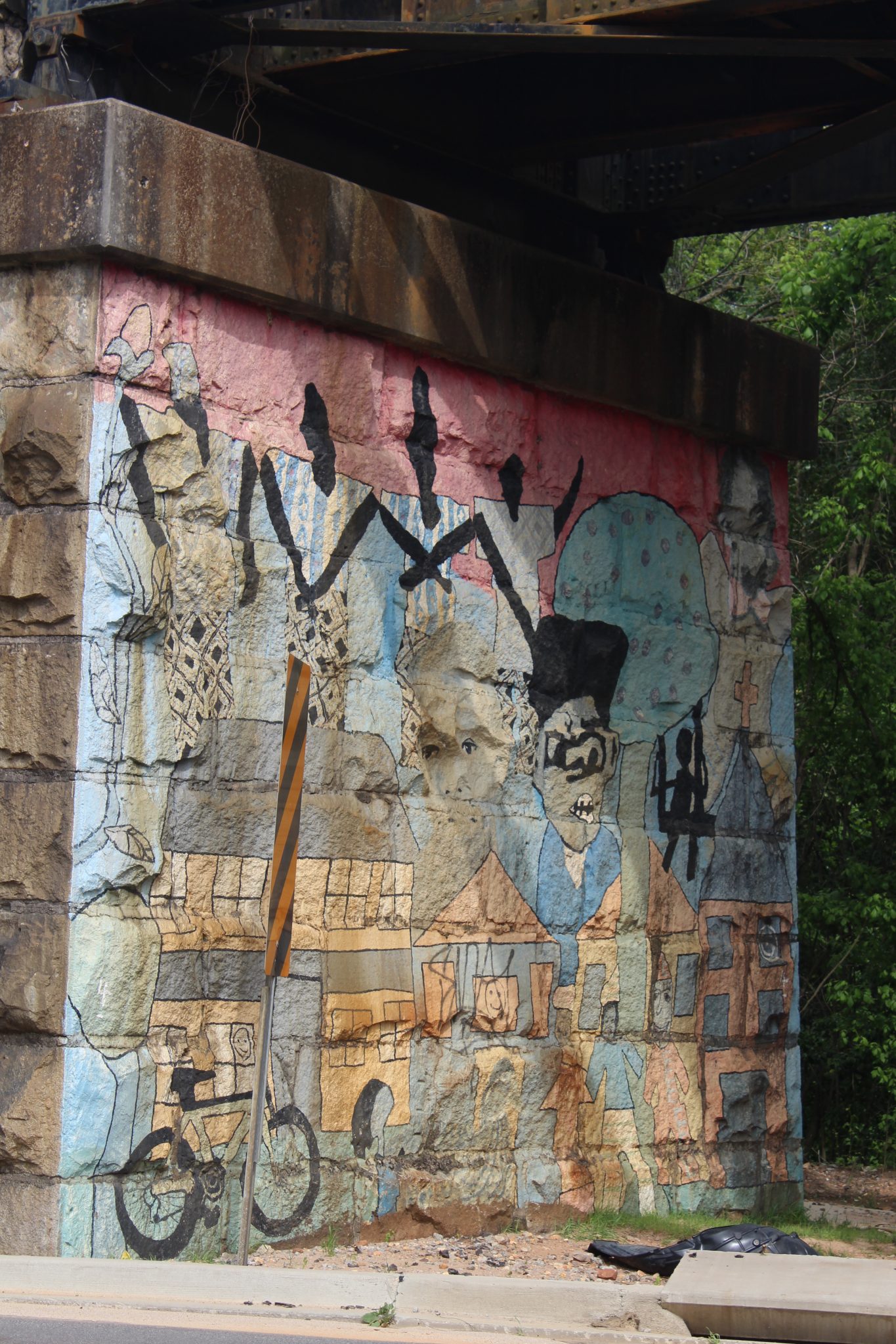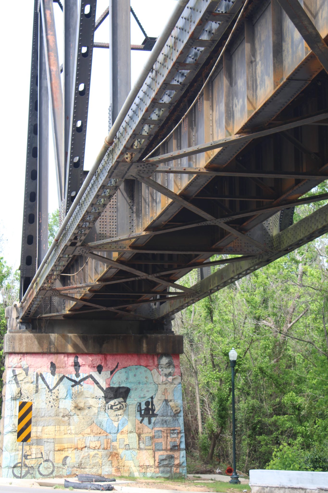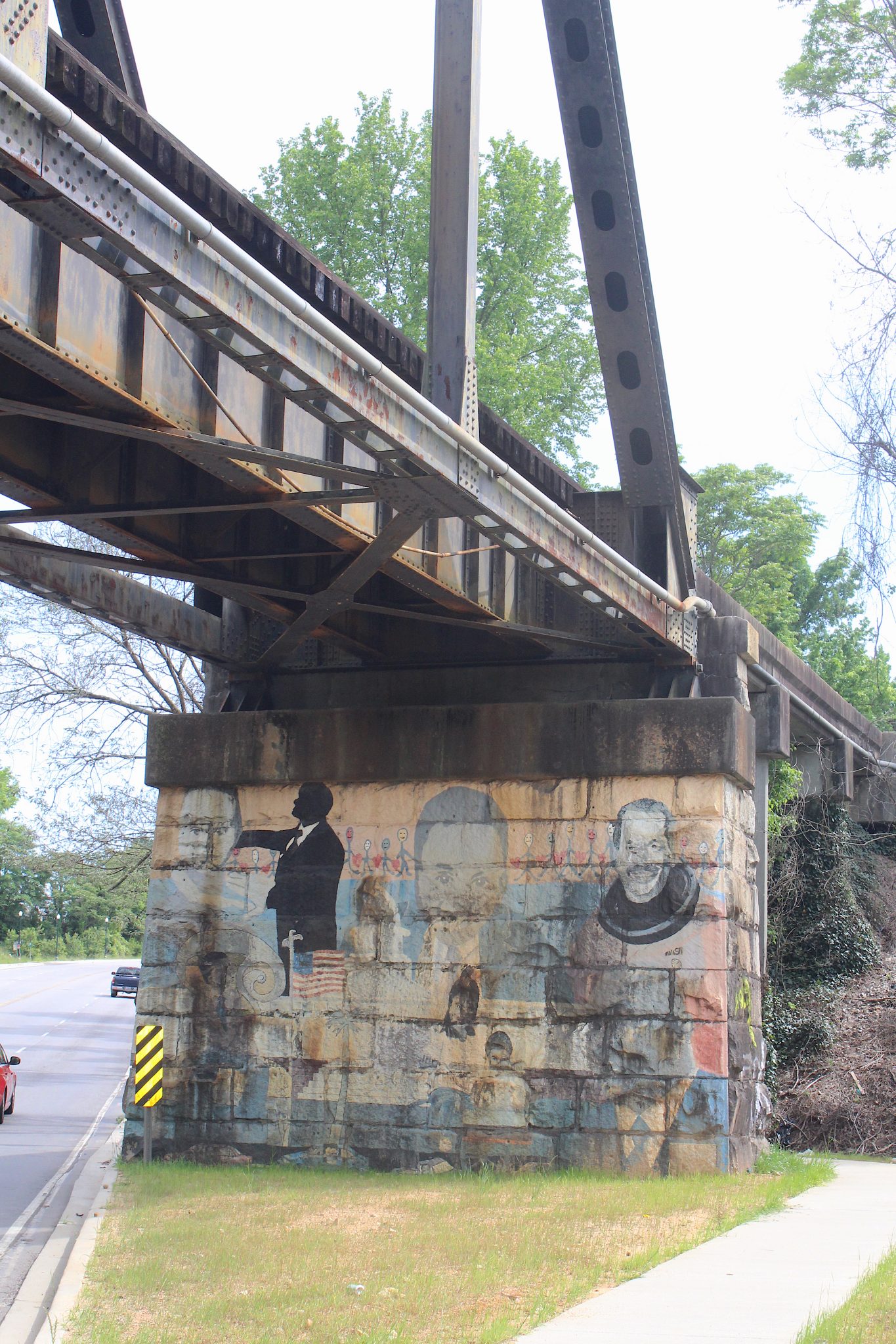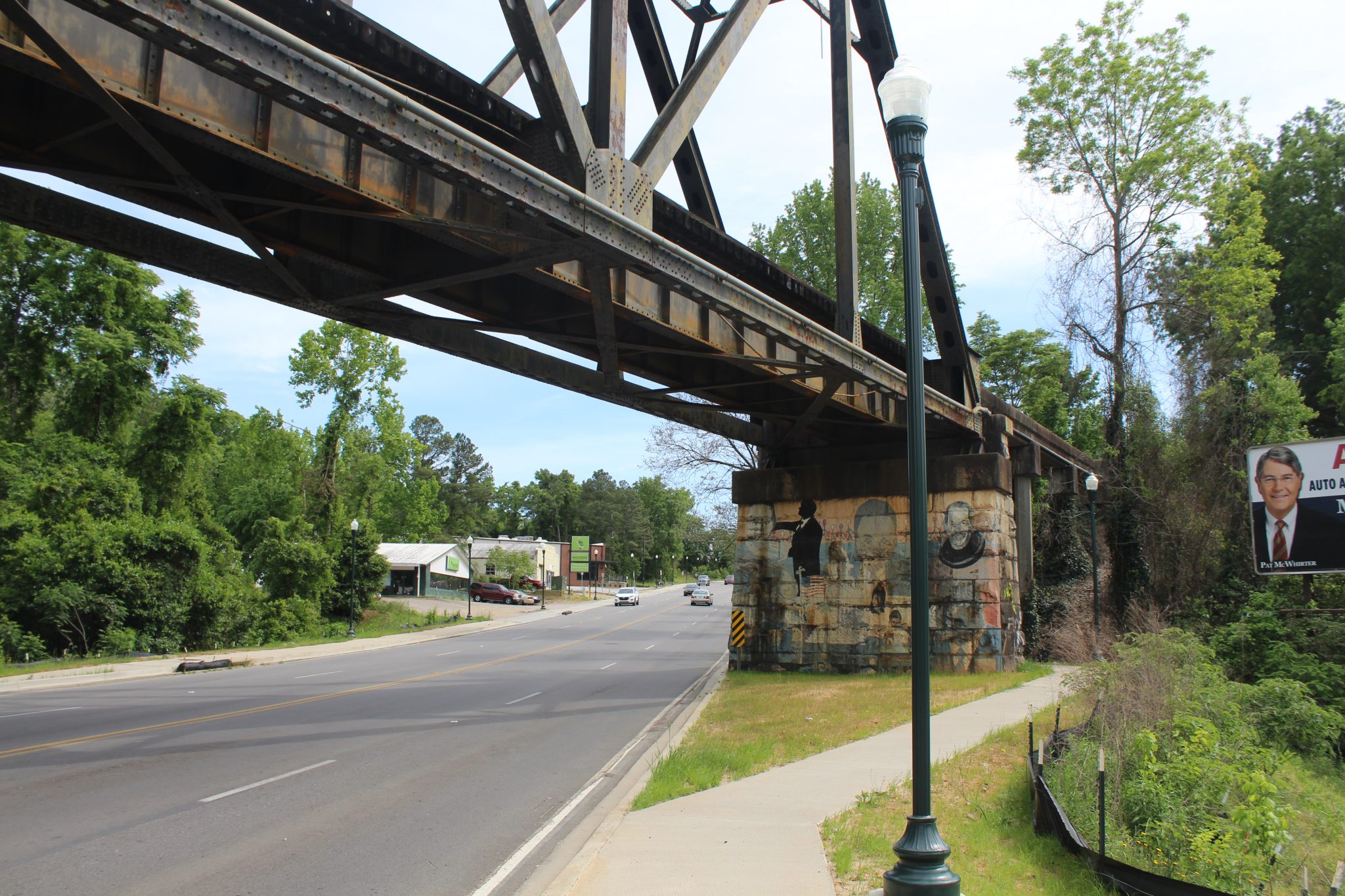 It’s painted on both supports of a North Main Street railroad trestle at the entrance to Earlewood Park. Waldrop had help with this mural from artist Vanessa Ashford– Bussy.