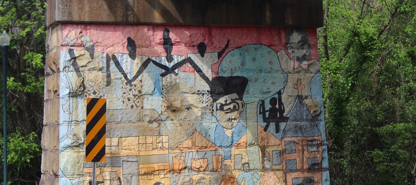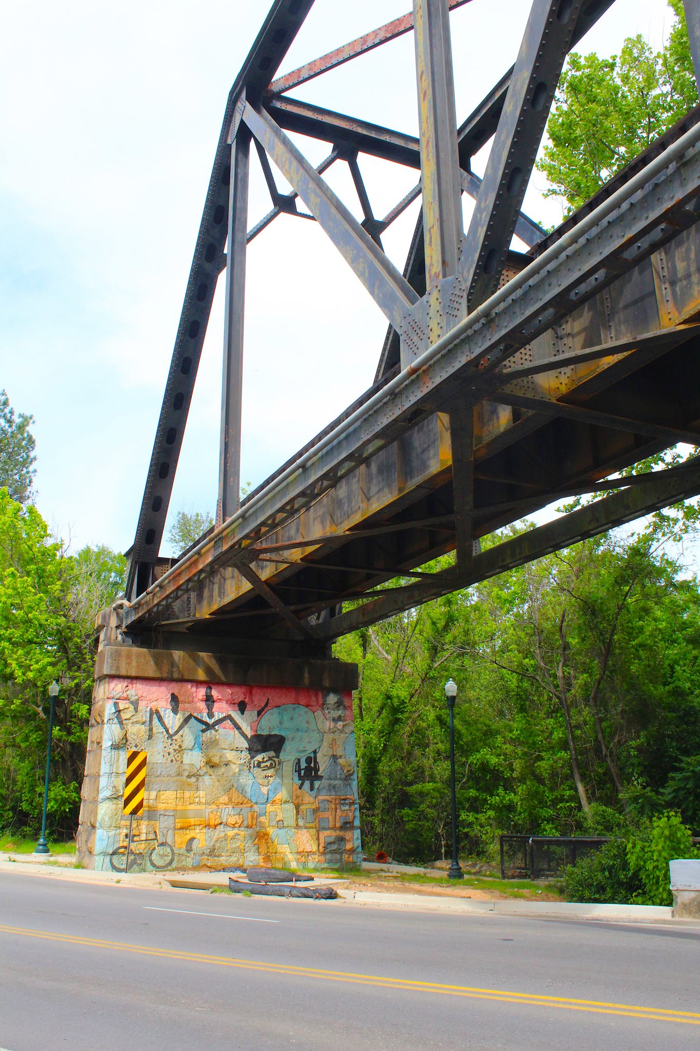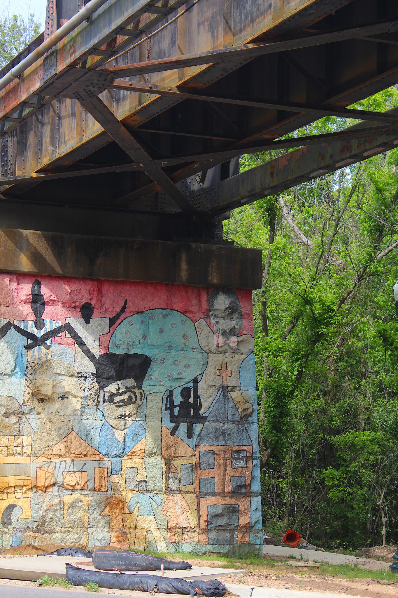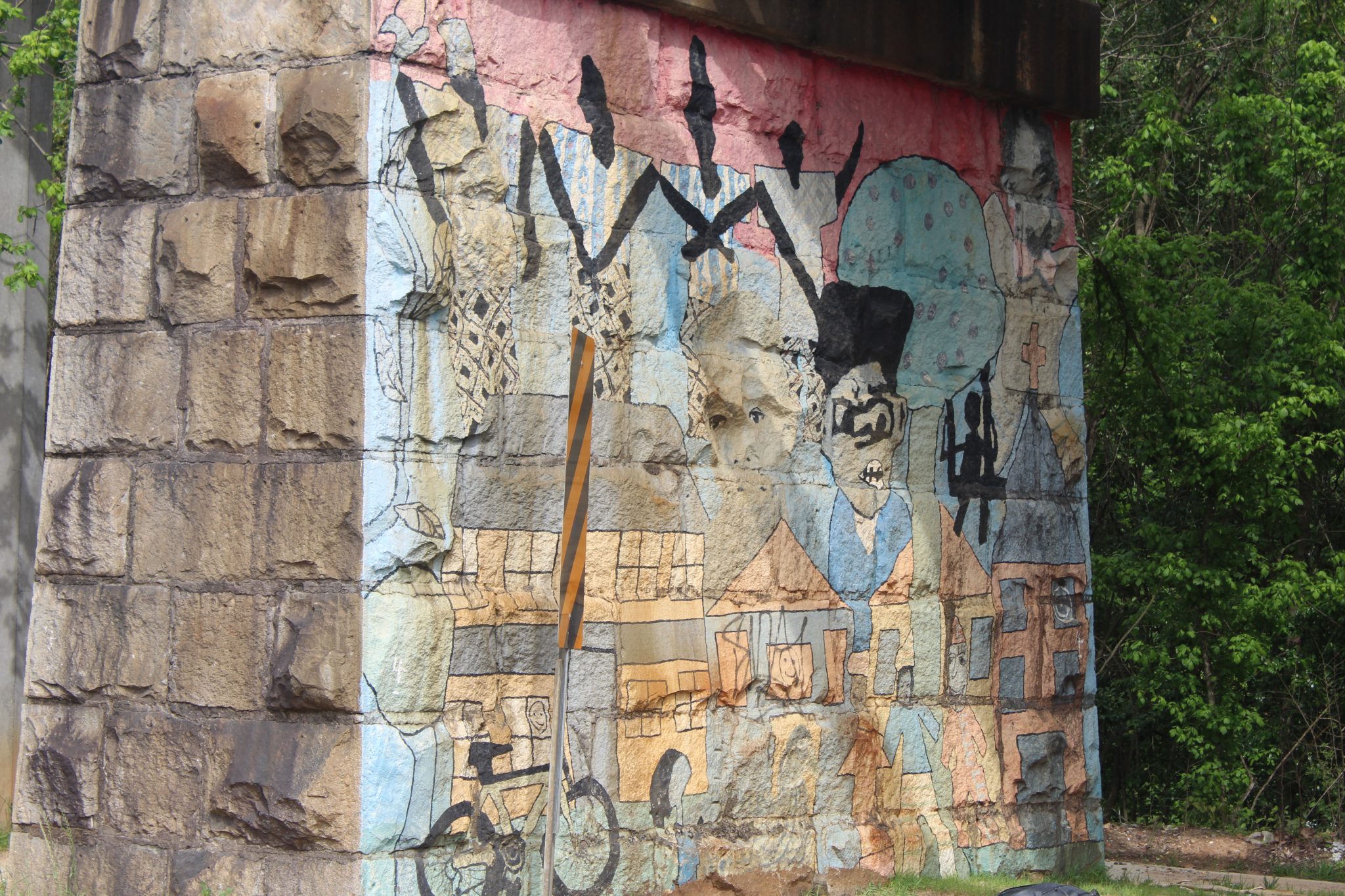 It’s painted on both supports of a North Main Street railroad trestle at the entrance to Earlewood Park. Waldrop had help with this mural from artist Vanessa Ashford– Bussy.