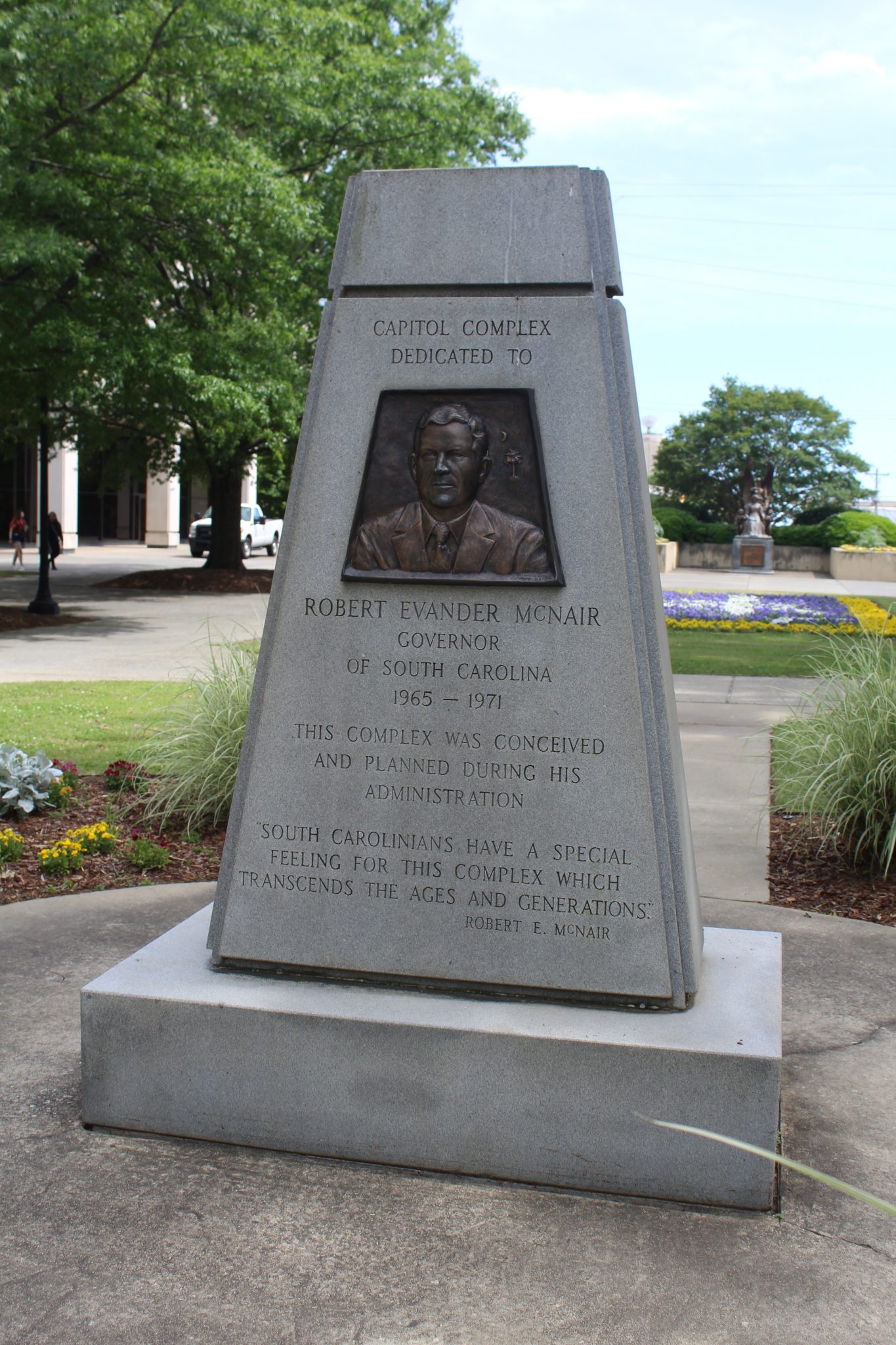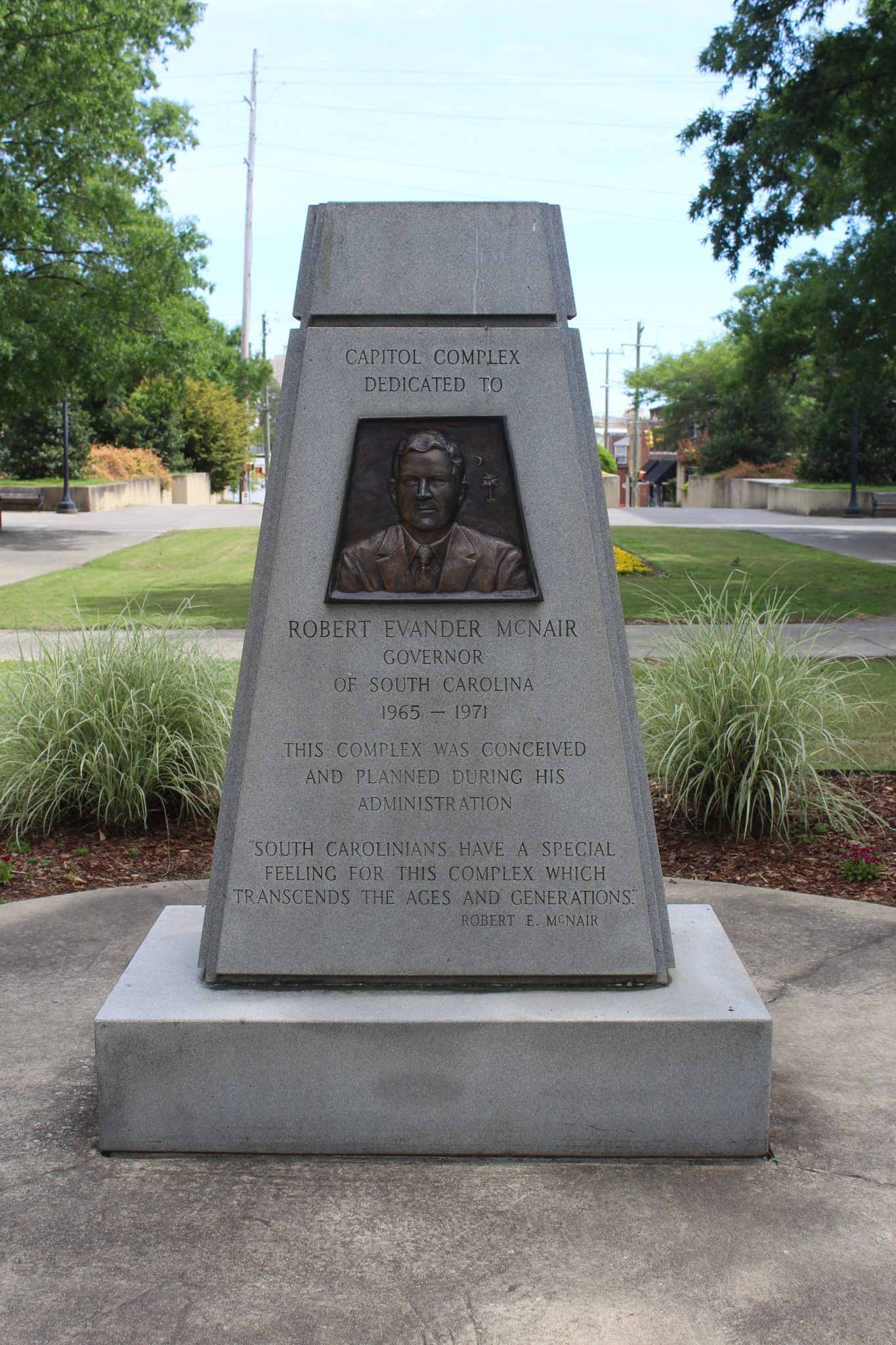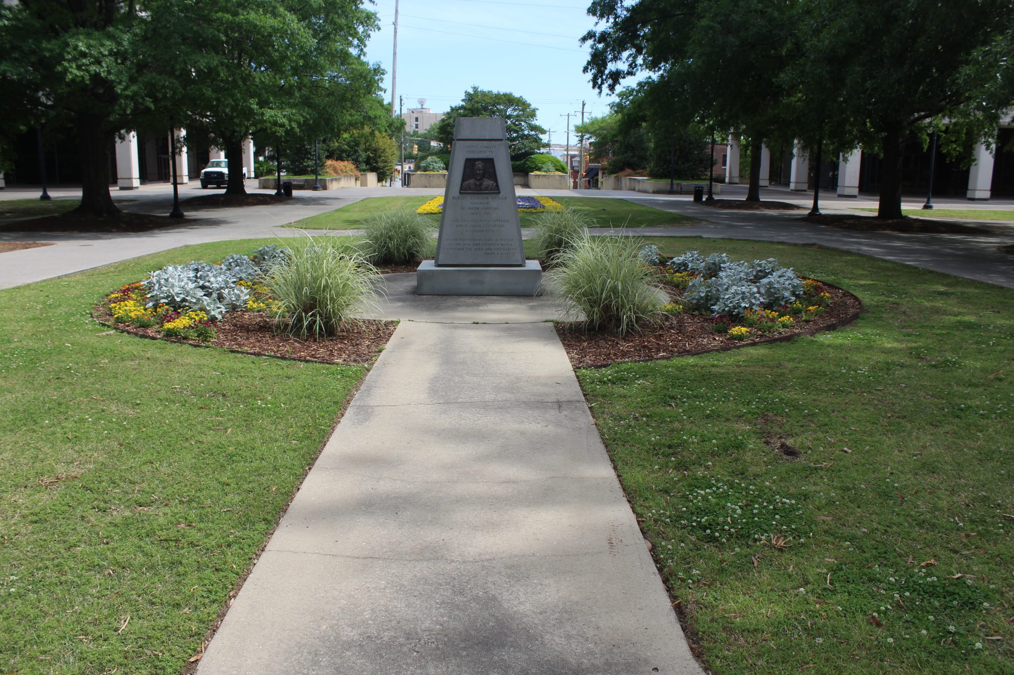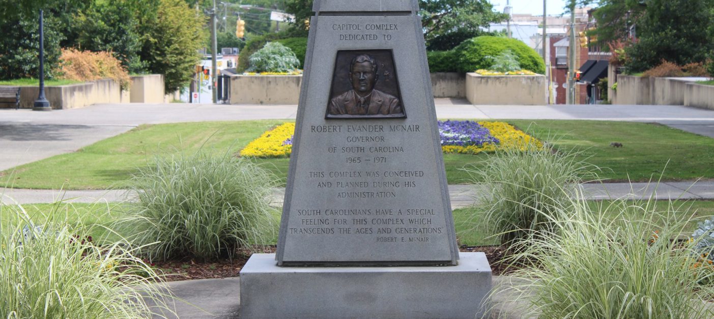 This monument dedicates the southern half of the State House grounds to South Carolina Governor Robert Evander McNair. McNair was in office during the 1969-1981 expansion of the grounds, which added much-needed office and parking space for state agencies and officials. Local modern architecture firm Lyles, Bissett, Carlisle & Wolff designed the matching Brutalist style buildings and worked with Wilbur Smith and Associates on the site’s plan, including the underground parking facility and the closing of Main and Senate streets to traffic. Landscape architect Robert E. Marvin created a cohesive design that incorporated the new buildings with the existing monuments, plants, and walkways around the State House north of Senate Street.