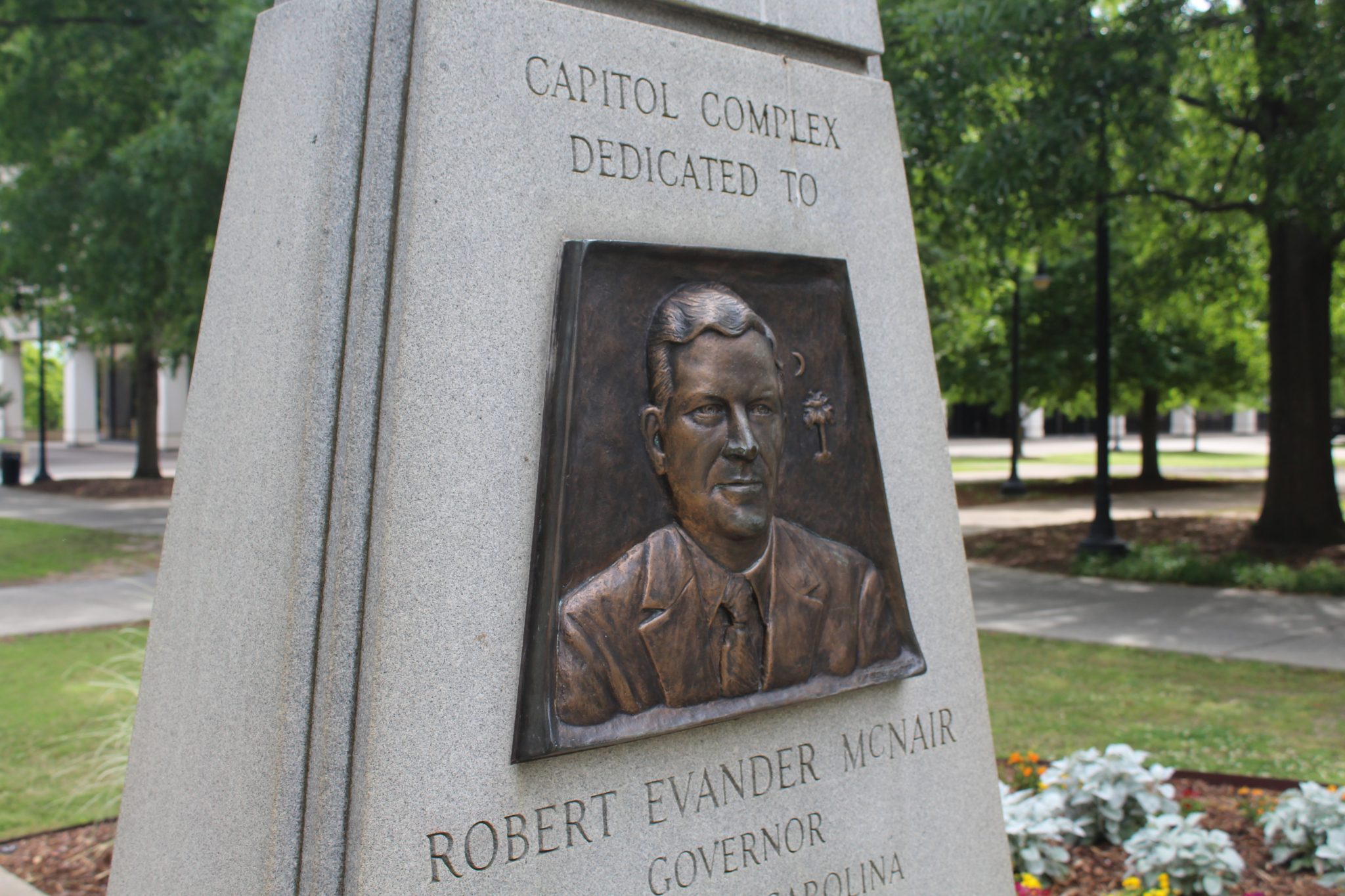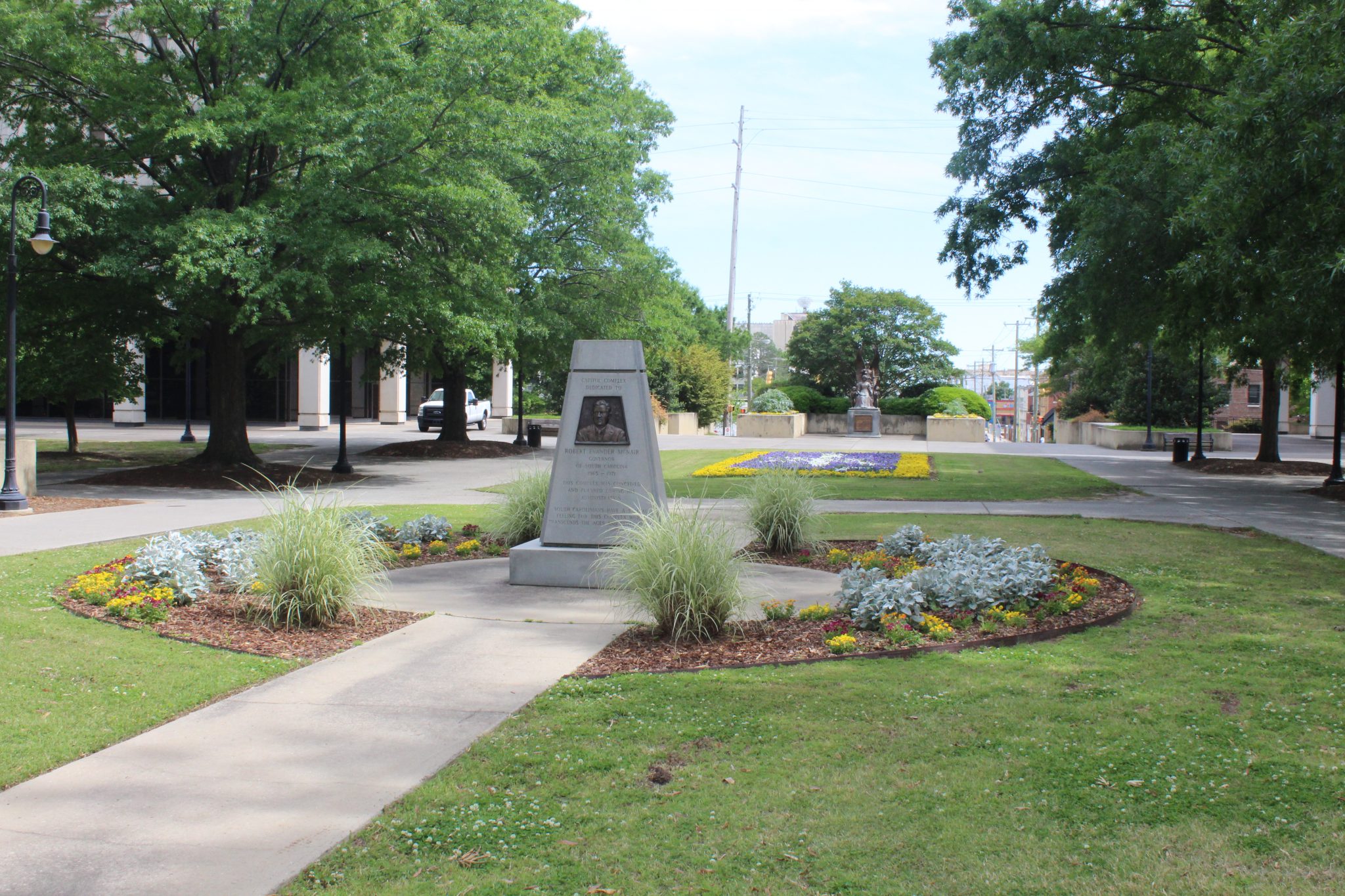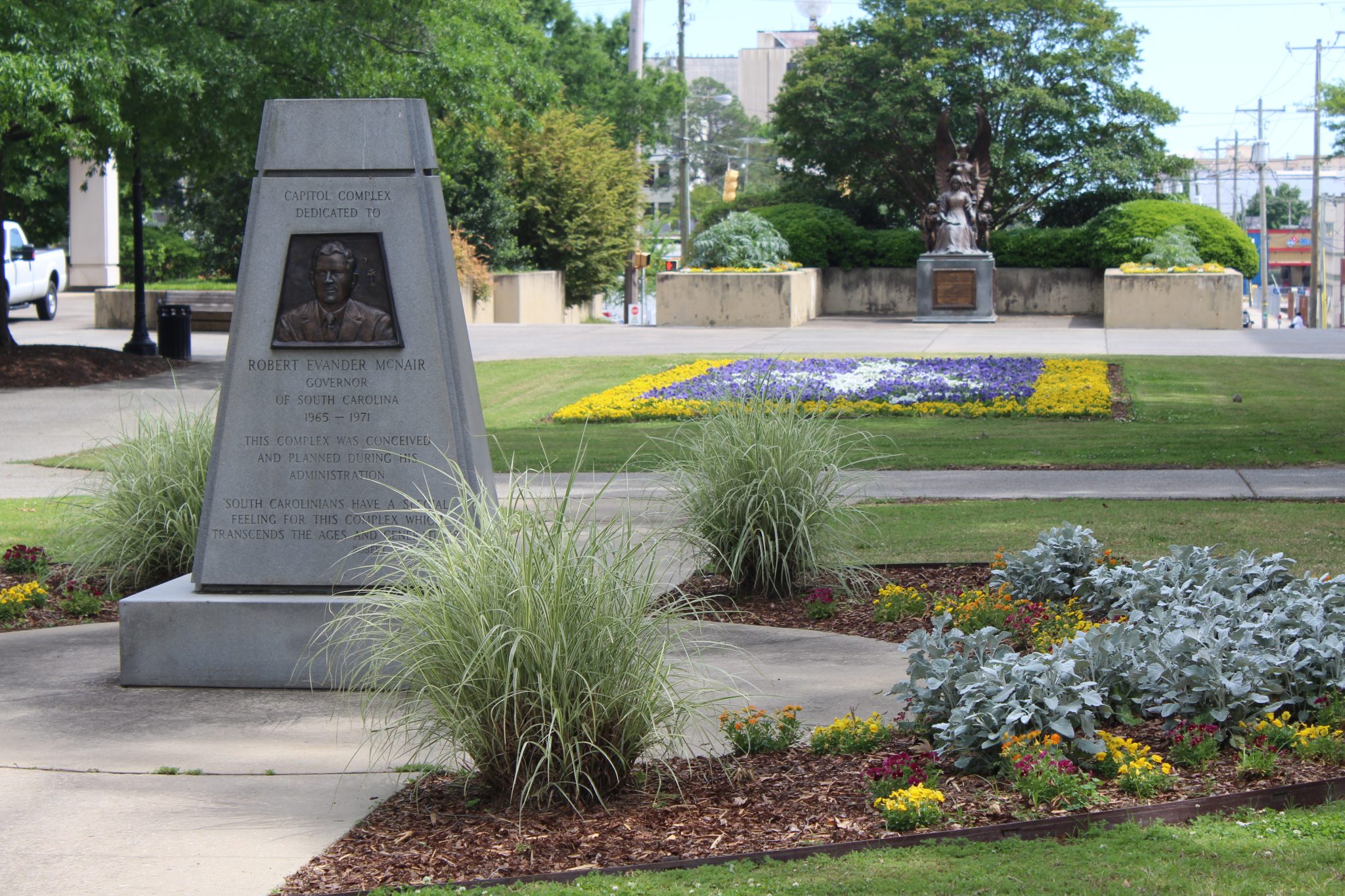 This monument dedicates the southern half of the State House grounds to South Carolina Governor Robert Evander McNair. McNair was in office during the 1969-1981 expansion of the grounds, which added much-needed office and parking space for state agencies and officials. Local modern architecture firm Lyles, Bissett, Carlisle & Wolff designed the matching Brutalist style buildings and worked with Wilbur Smith and Associates on the site’s plan, including the underground parking facility and the closing of Main and Senate streets to traffic. Landscape architect Robert E. Marvin created a cohesive design that incorporated the new buildings with the existing monuments, plants, and walkways around the State House north of Senate Street.