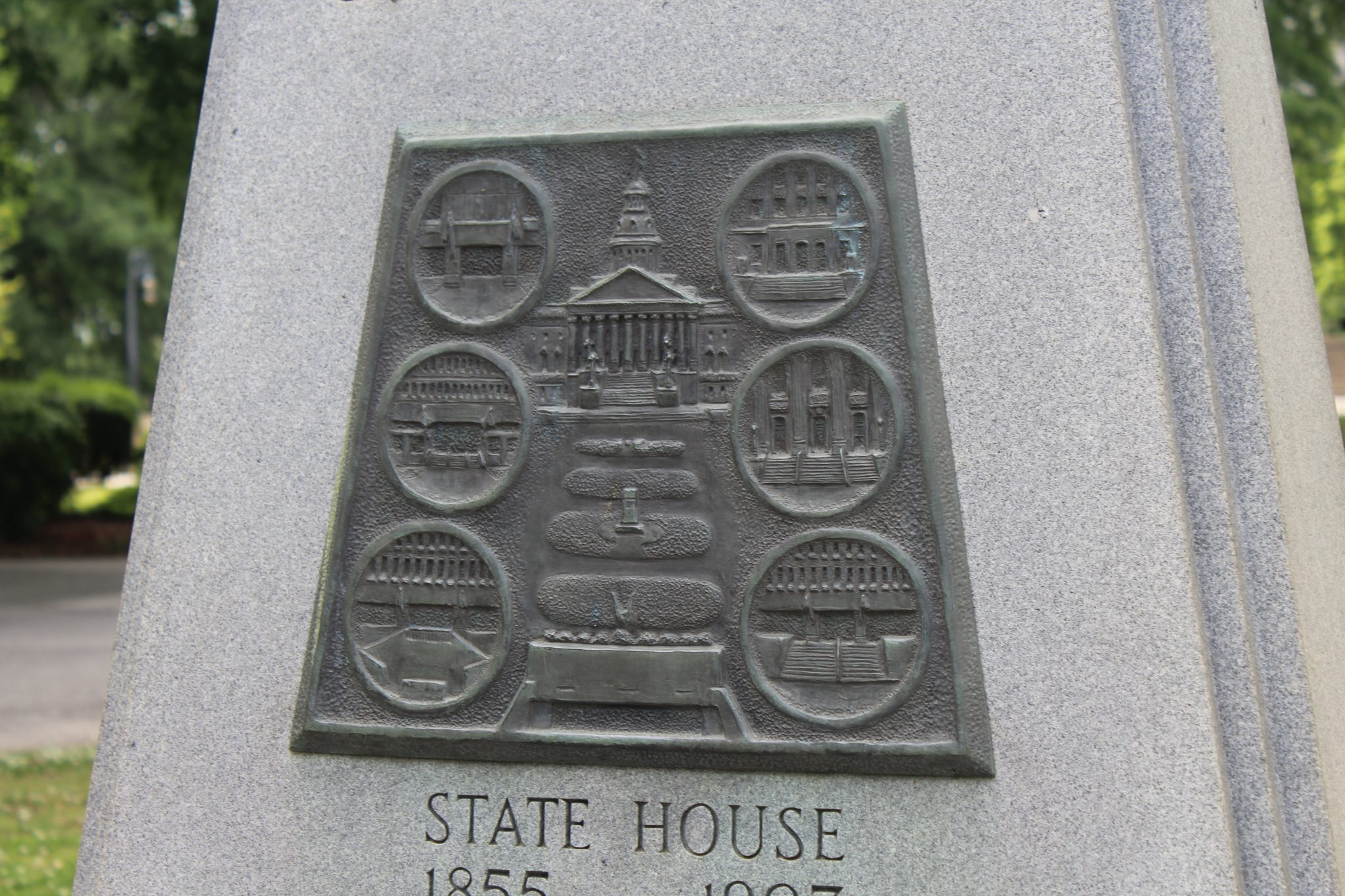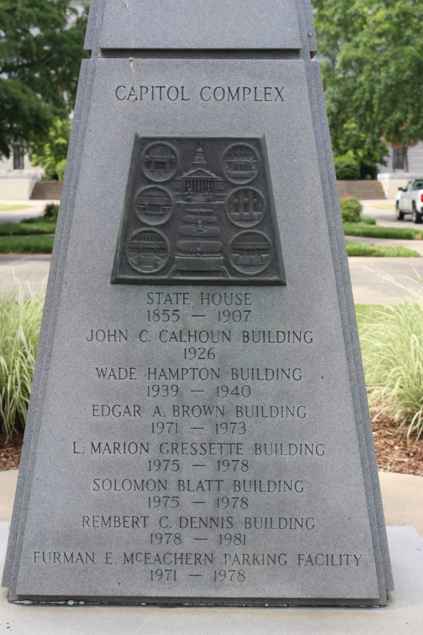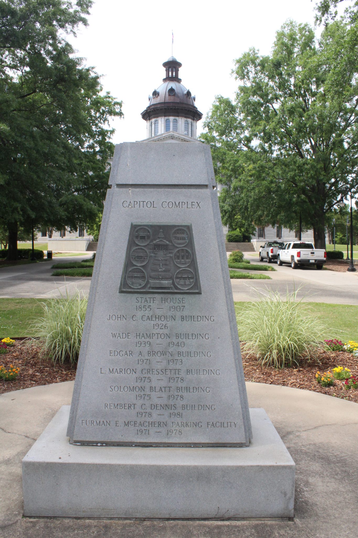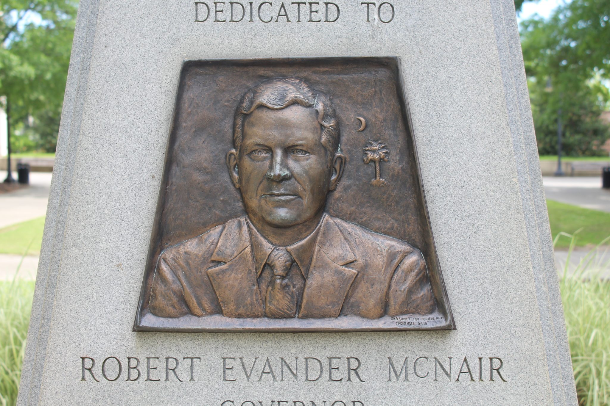 This monument dedicates the southern half of the State House grounds to South Carolina Governor Robert Evander McNair. McNair was in office during the 1969-1981 expansion of the grounds, which added much-needed office and parking space for state agencies and officials. Local modern architecture firm Lyles, Bissett, Carlisle & Wolff designed the matching Brutalist style buildings and worked with Wilbur Smith and Associates on the site’s plan, including the underground parking facility and the closing of Main and Senate streets to traffic. Landscape architect Robert E. Marvin created a cohesive design that incorporated the new buildings with the existing monuments, plants, and walkways around the State House north of Senate Street.