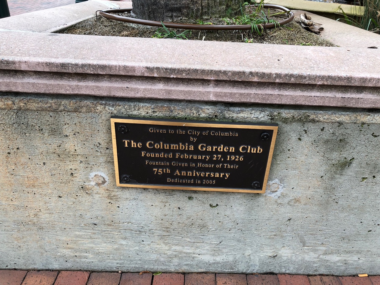 Given to the City of Columbia by The Columbia Garden Club, which was founded on February 27, 1926. This fountain was given to the city to honor the 75th anniversary of the Garden Club and was dedicated in 2005.