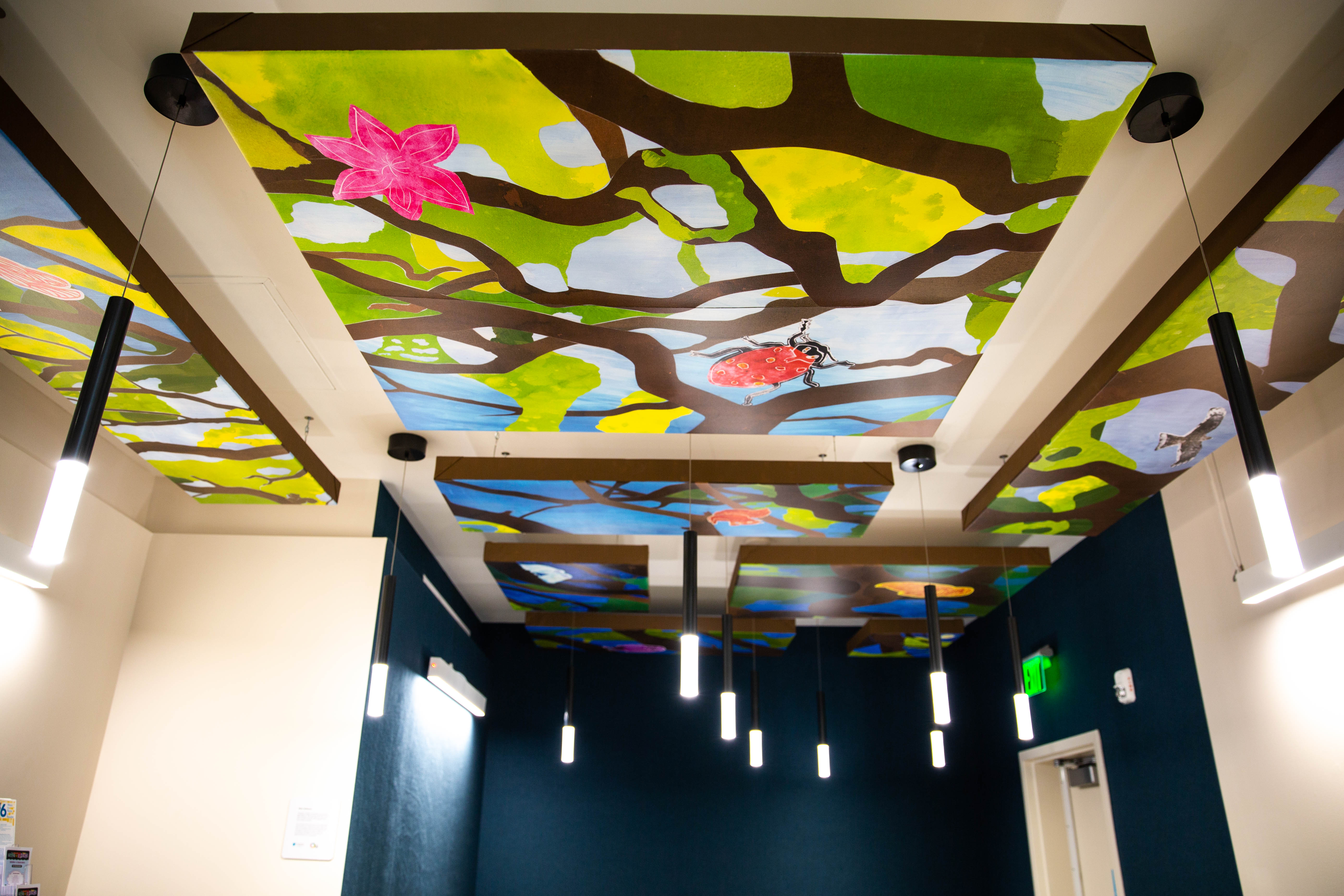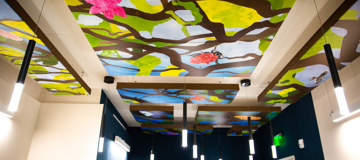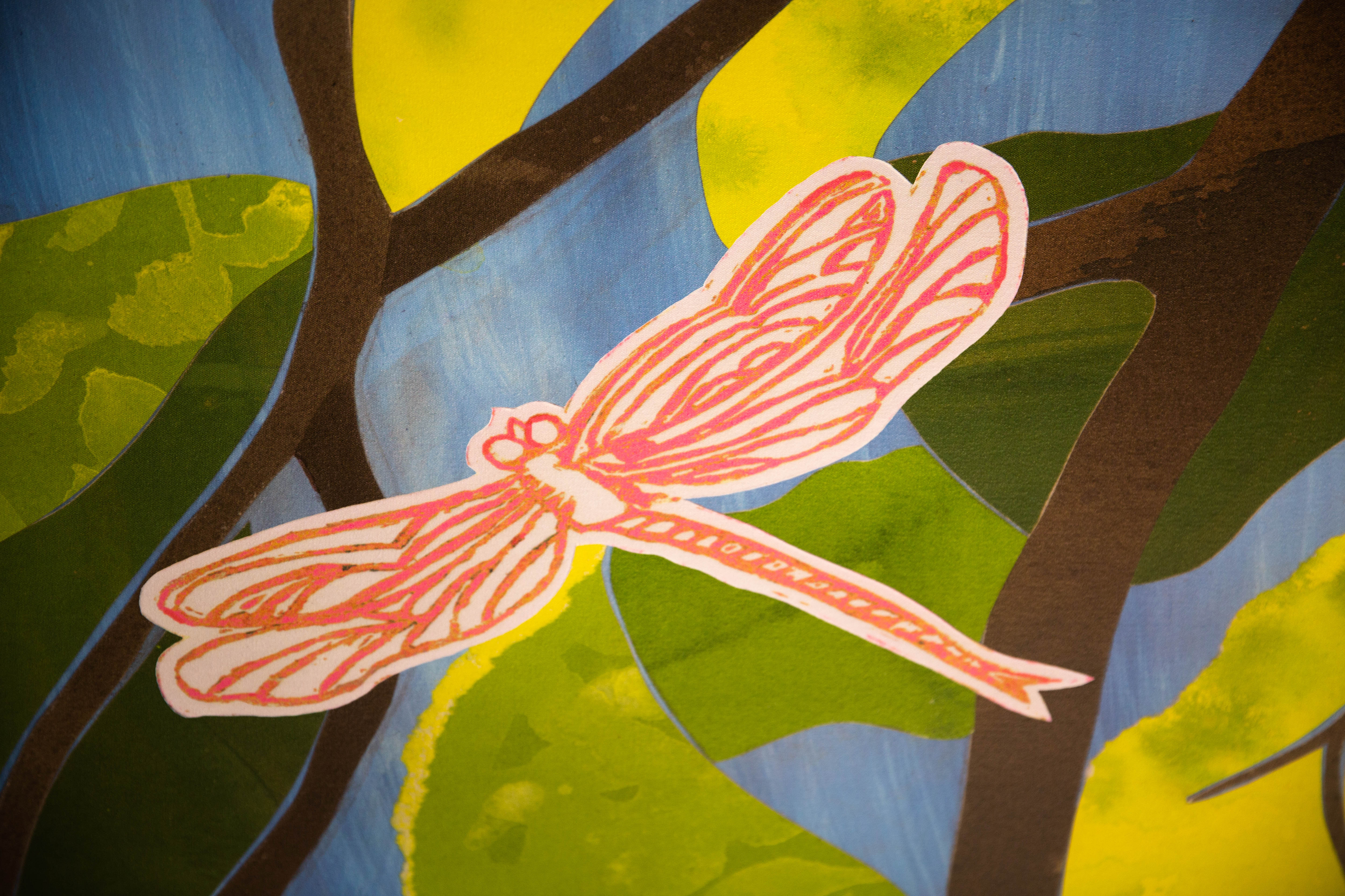 Artist Mary Robinson hosted a public print-making workshop with community members. Finding inspiration from nature and the conversations with the participants, Robinson created this piece to be featured in the Wheatley location's children's area. The piece features insects, birds and animals that might be found in the sky or upper branches of South Carolina trees.
