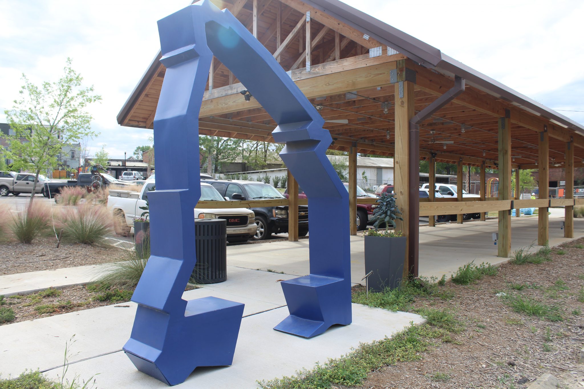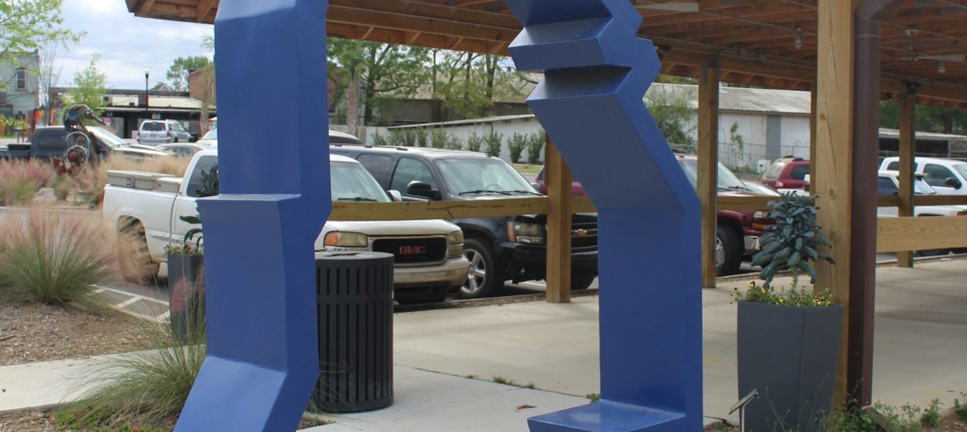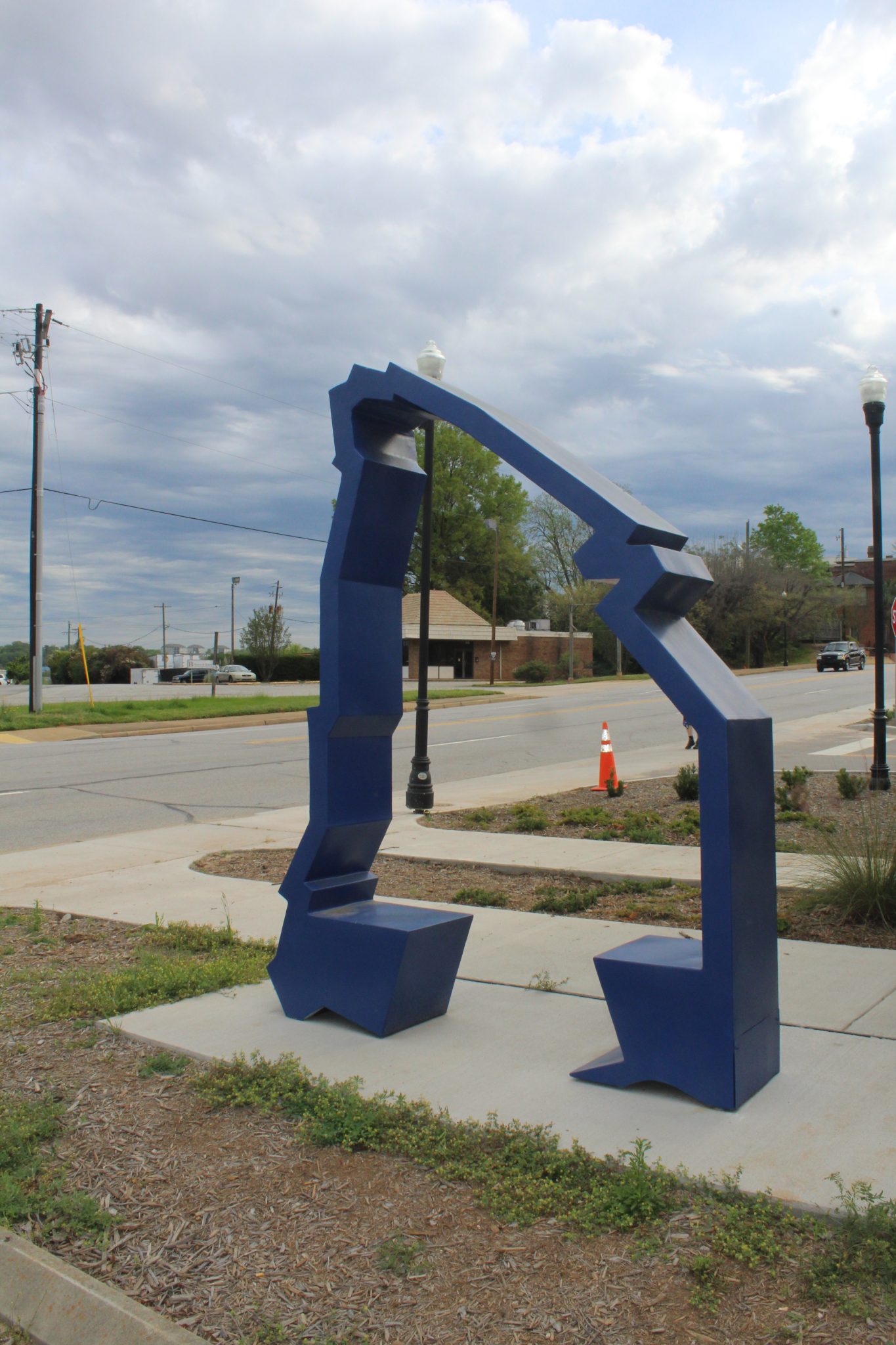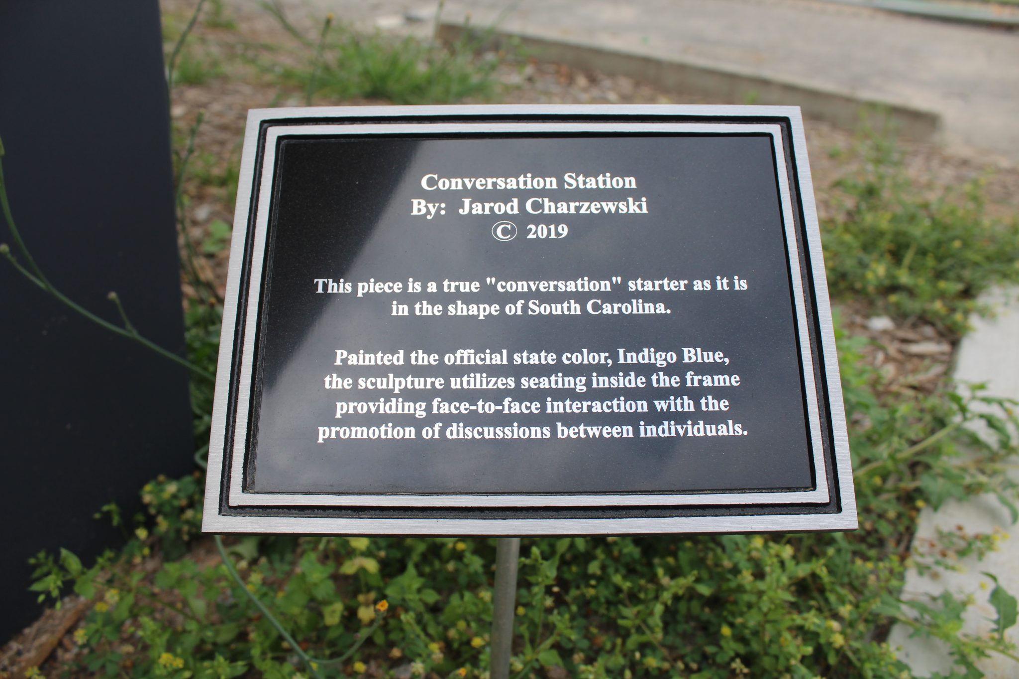This piece is a true "conversation" starter as it is in the shape of South Carolina. Painted the official state color, Indigo blue, the sculpture utilizes seating inside the frame by providing face-to-face interaction with the promotion of discussions between individuals.