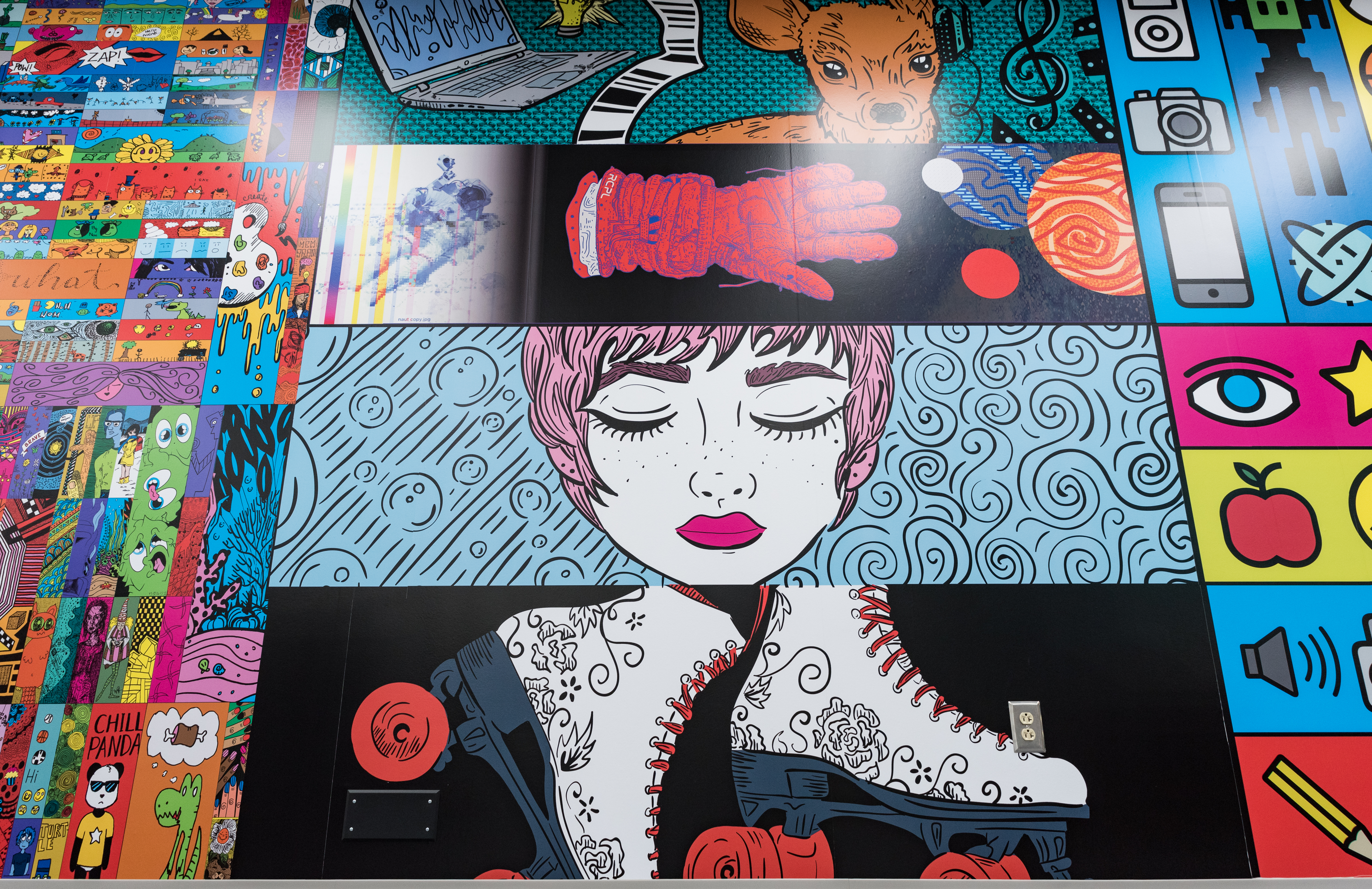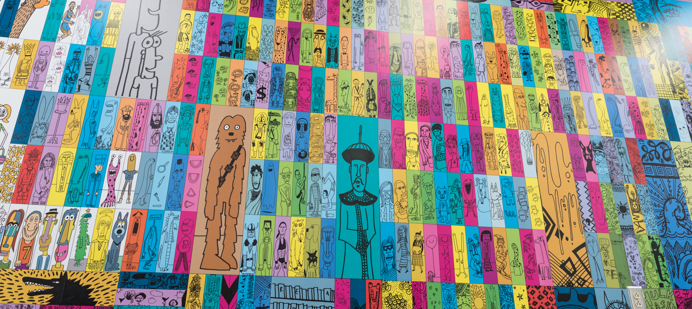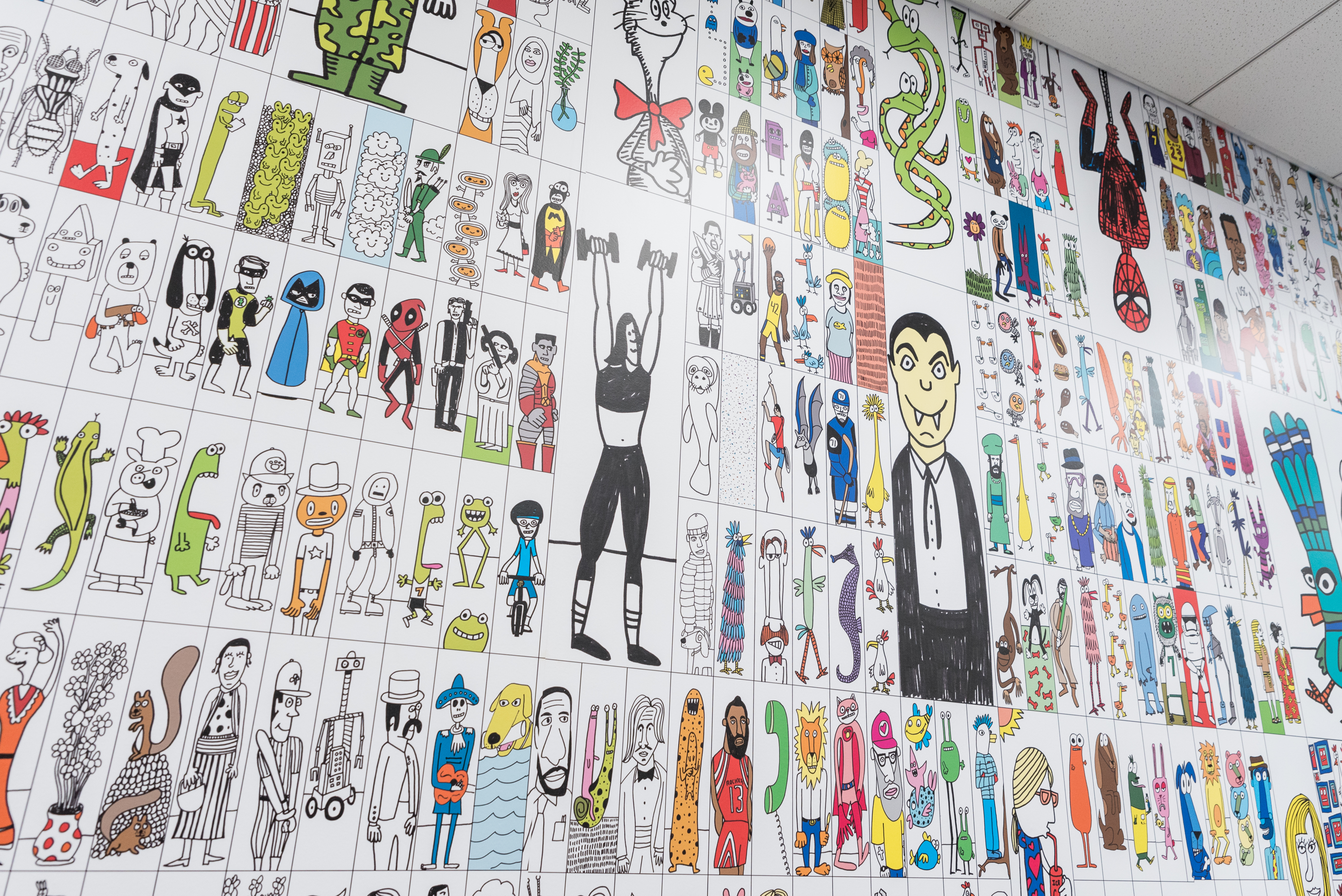 The Richland Library commissioned Marius Valdes to create a permanent art installation made from over 1,500 hand drawn bookmarks on a 50 x 9 foot entrance wall for the newly renovated Teen area at Richland Library Main. Many of the bookmarks were created by Valdes with help from the community using Doodle Freely bookmark kits.