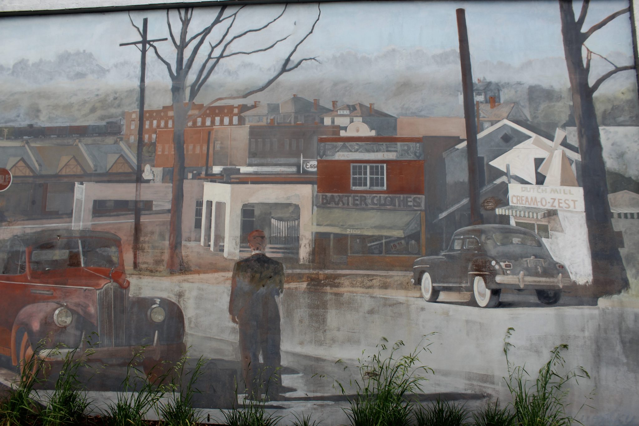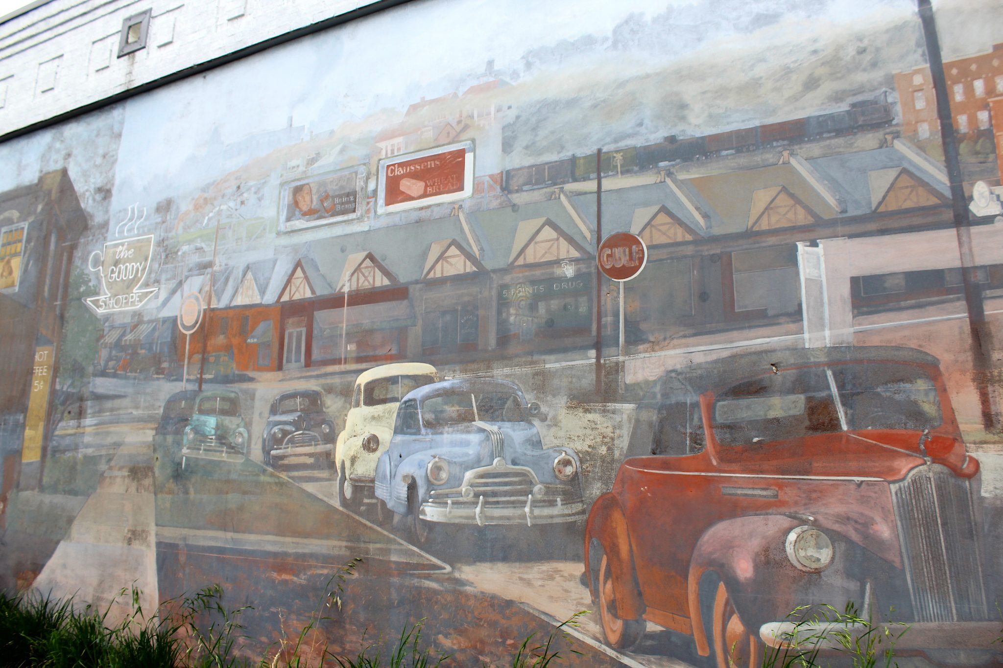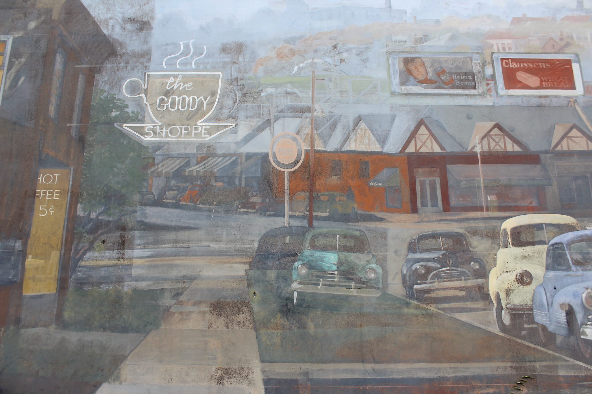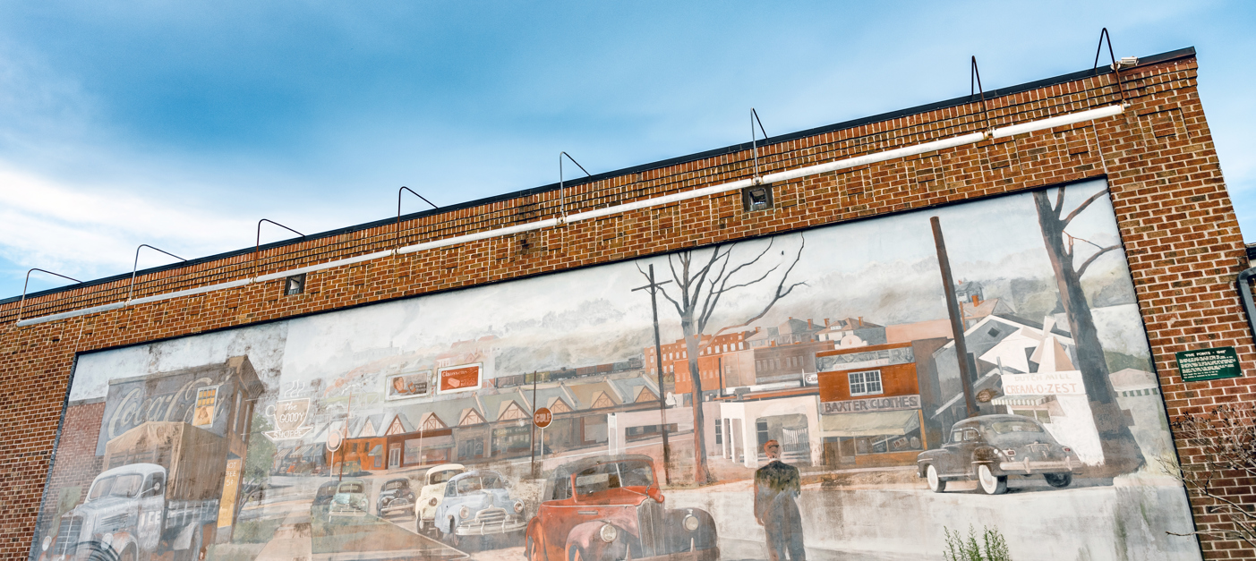 The mural on the north side of this building was commissioned by Harper's Restaurant in 1990. The artist Blue Sky completed the 14x60 foot mural in the summer of 1991.