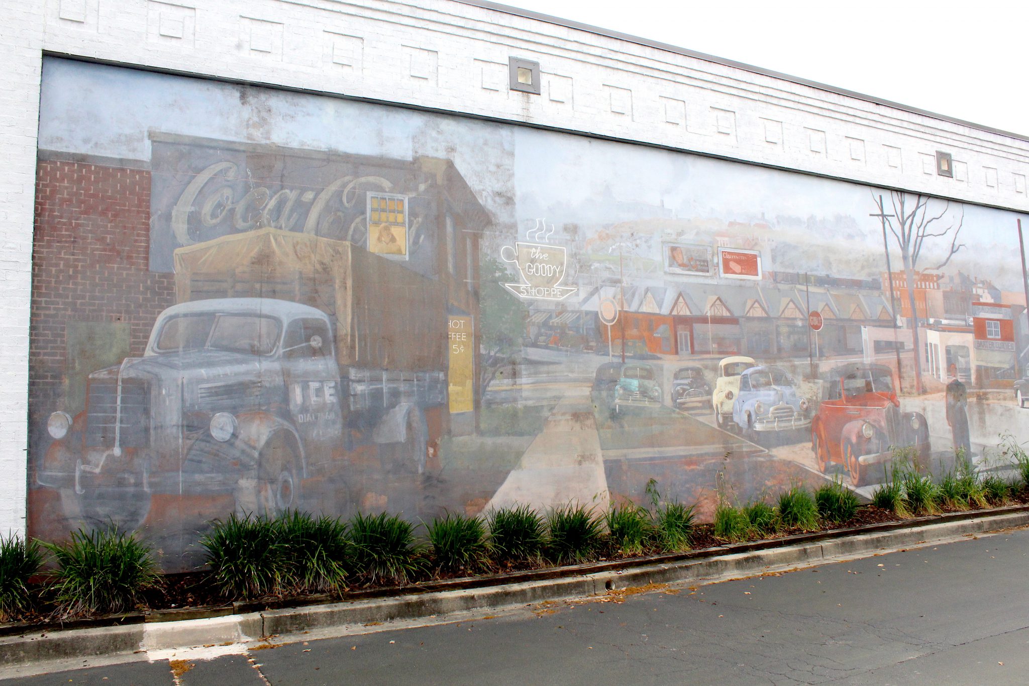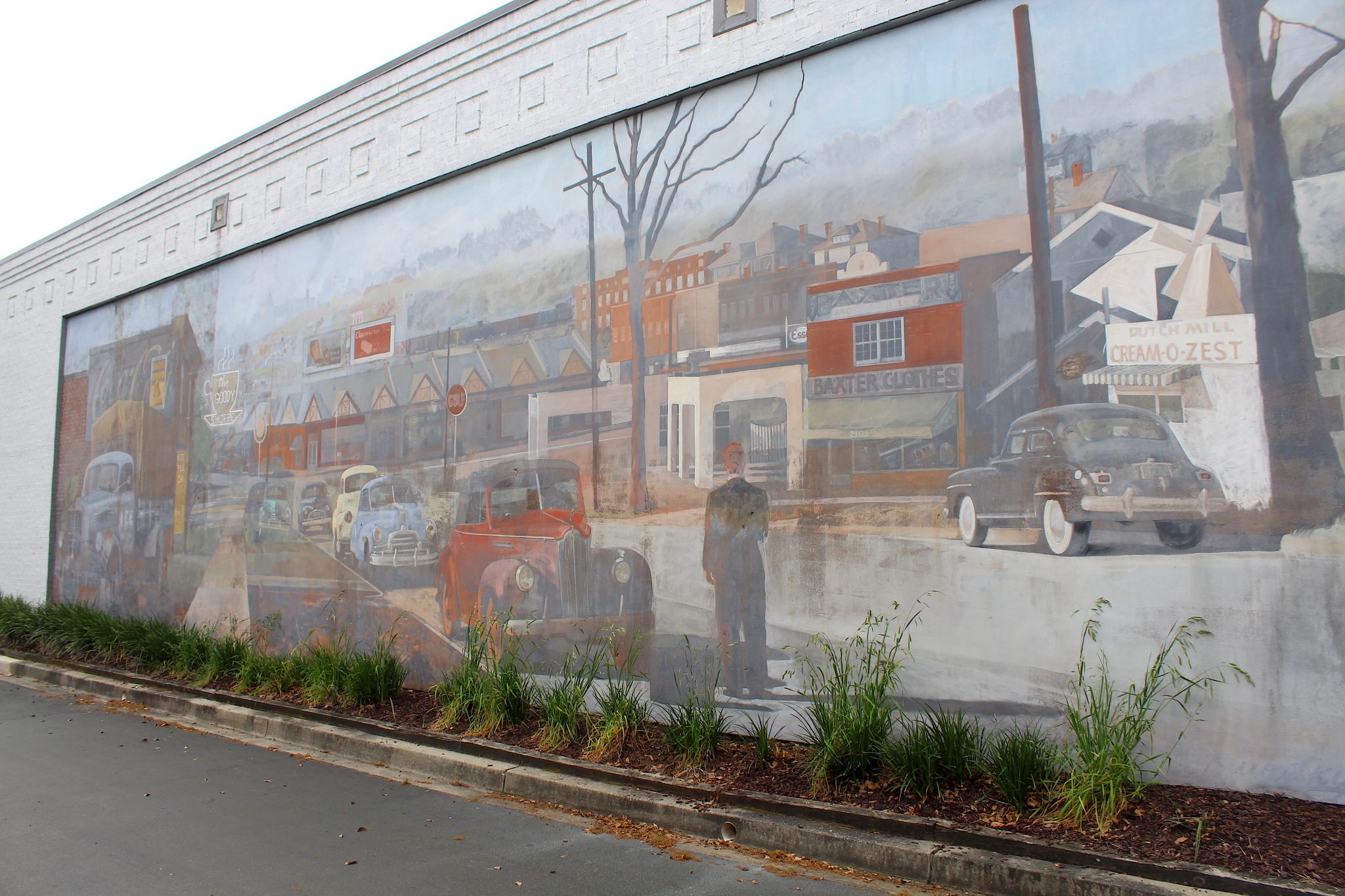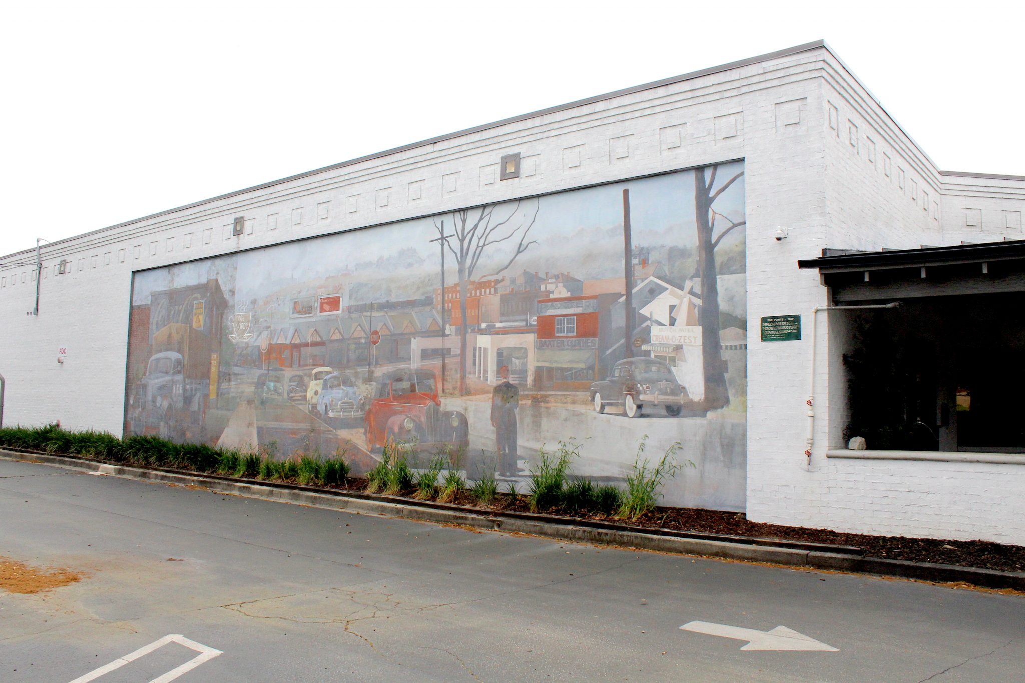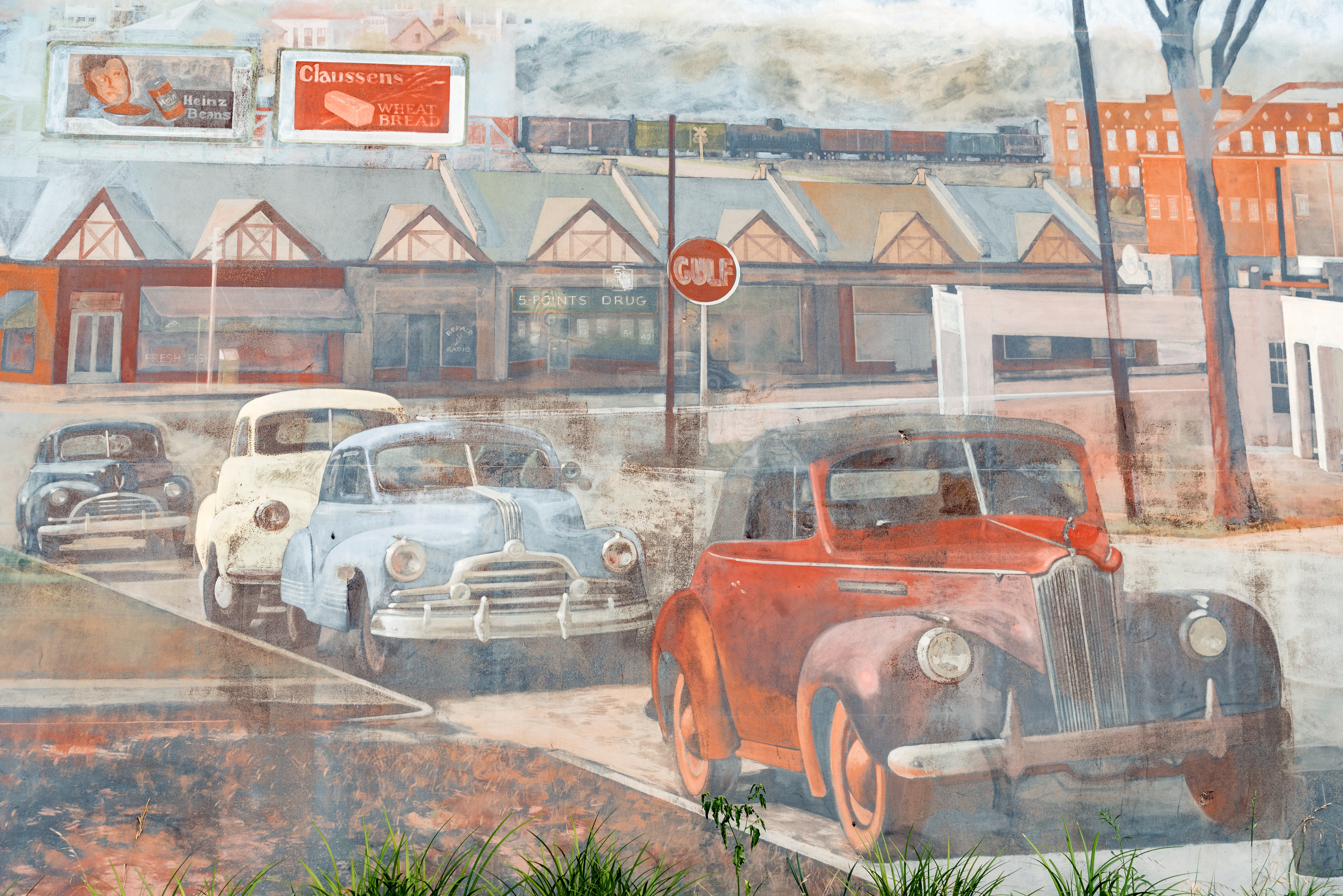 The painting depicts Five Points as it might have appeared from a vantage point halfway up Devine Street hill. The restaurant now sits where the white stucco Gulf Station was in the year 1948; known to most as the old Harper's Restaurant.