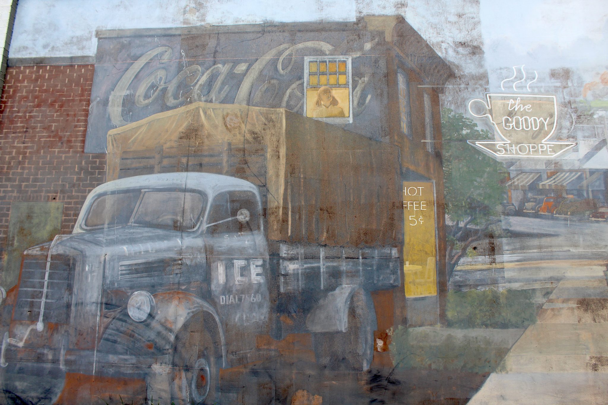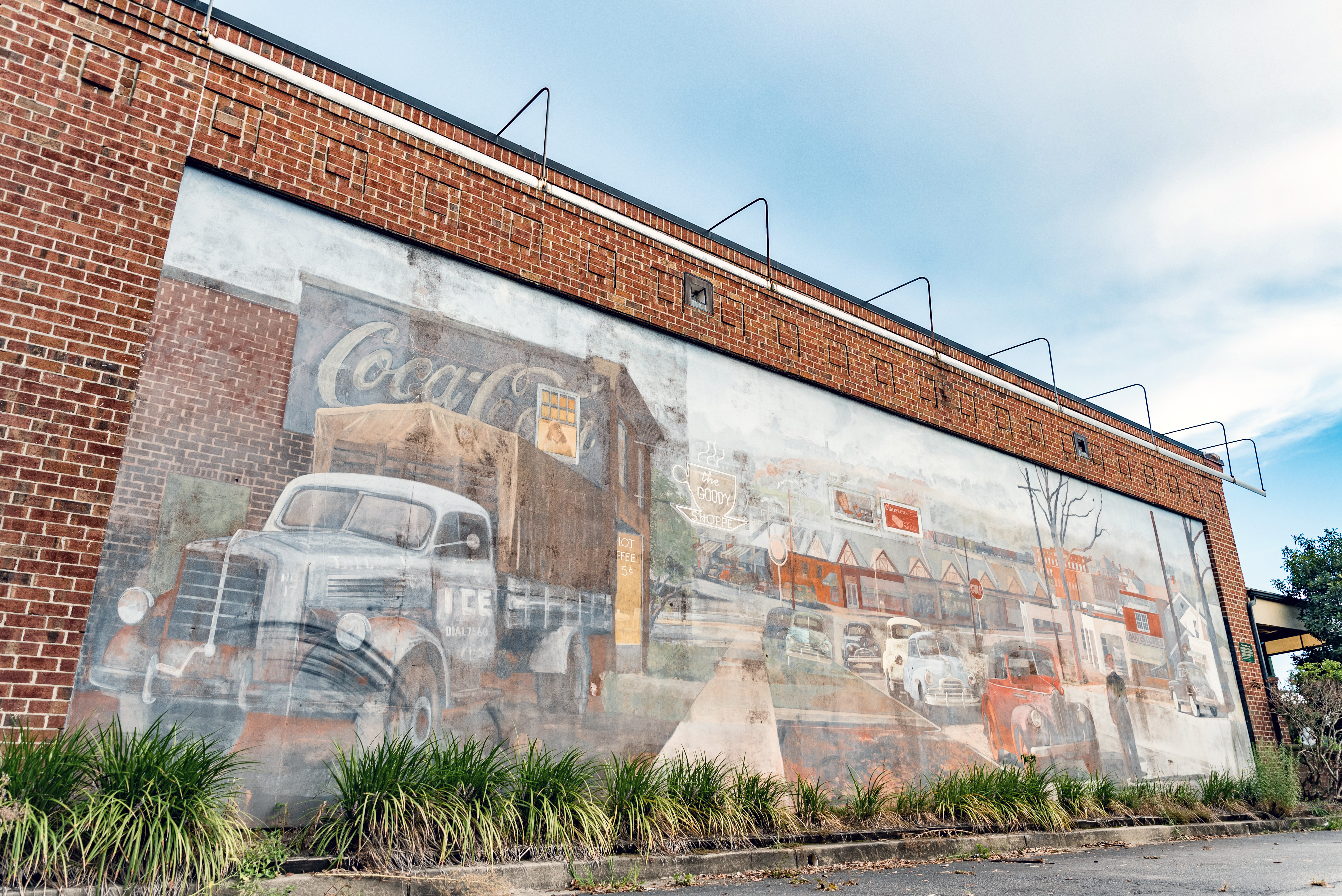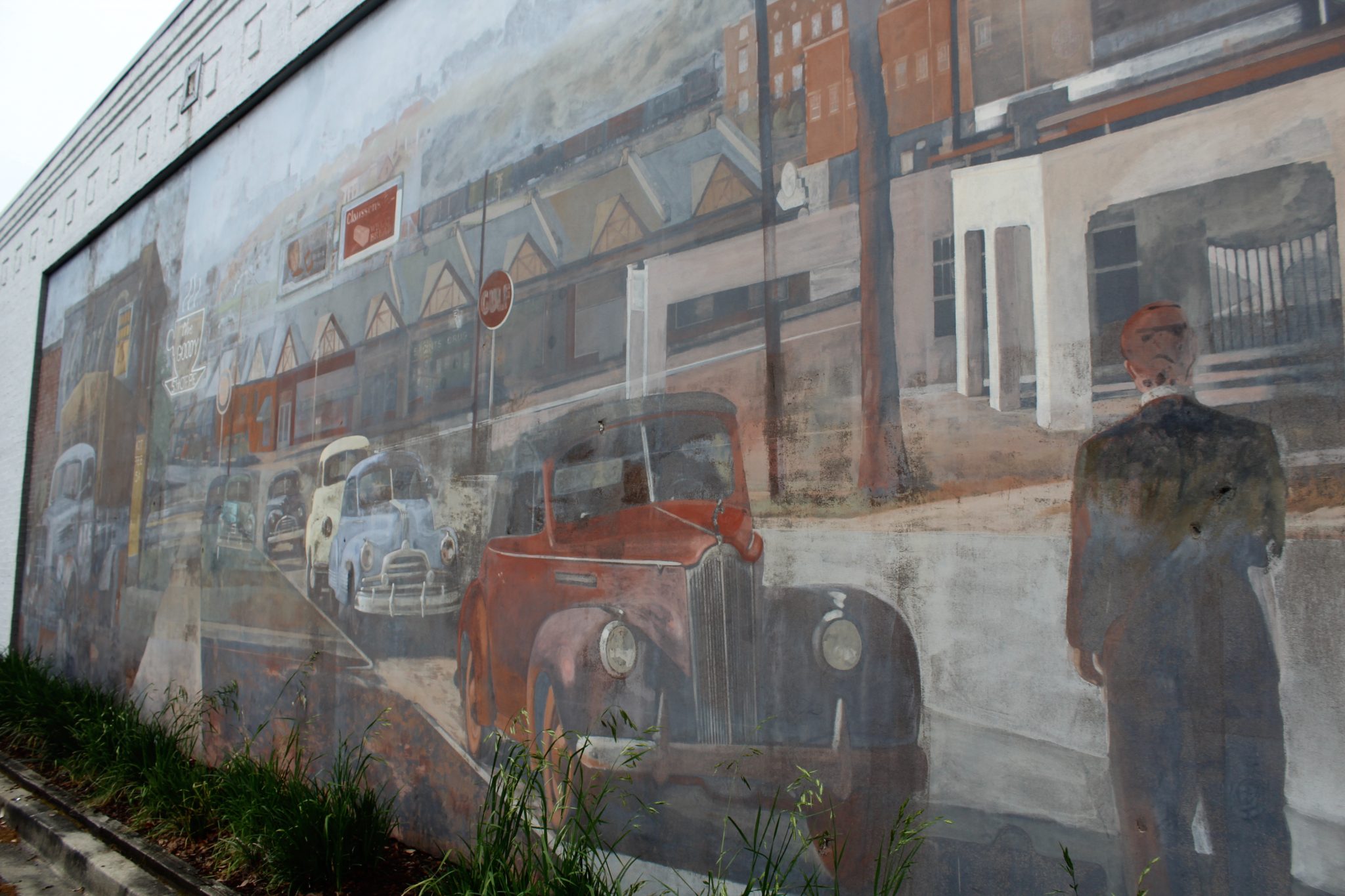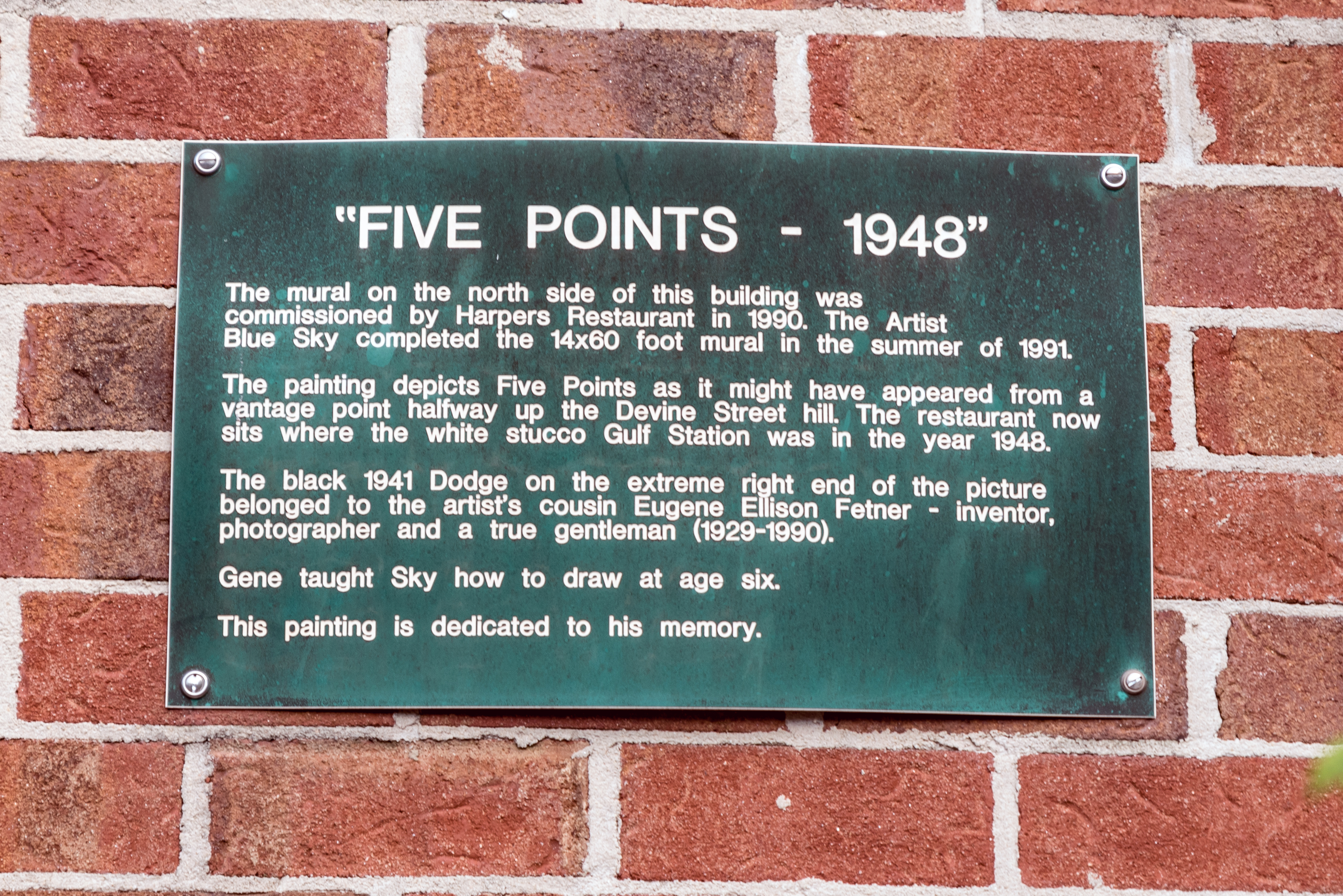 This mural is located on an exterior wall of (formally) Harper's Restaurant in Five Points. The 14' by 60' mural illustrates Five Points, circa 1948 from a vantage point halfway up the Devine Street hill. The mural was dedicated to Sky's artistic cousin, Eugene Ellison Fetner, inventor and photographer who taught Sky how to draw at the age of six.