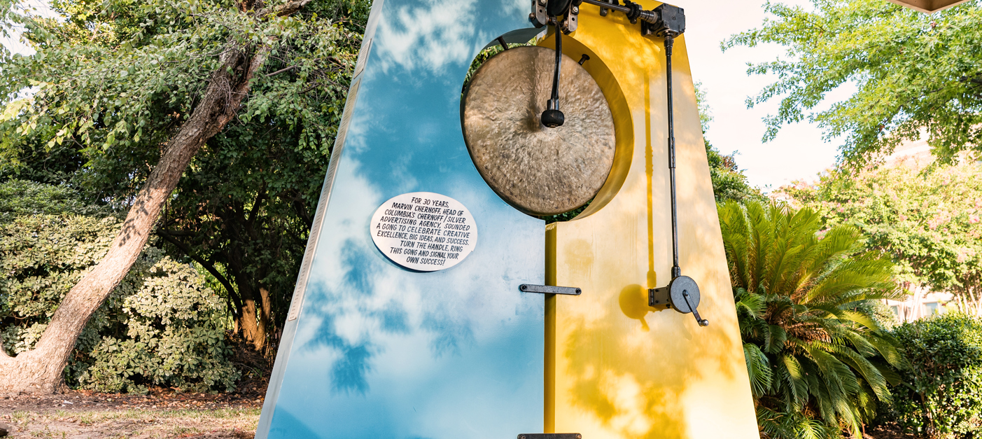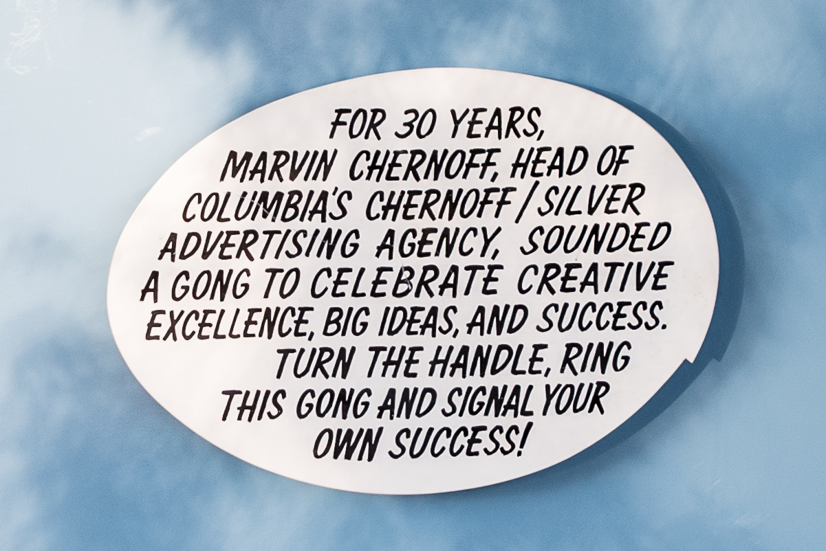 The "Gong" is a commemorative piece created to celebrate the late Marvin Chernoff, a legendary Public Relations Guru and the founder of Chernoff Newman. The sculpture consists of an 8ft by 8ft gong anchored in the ground, with a winding crank to strike the mallet to the gong. Gonging was the way Marvin symbolized a job well done, and as a way to create closure while moving forward to the next project. As former employee, longtime friend, and One Columbia board member Lee Ann Kornegay states, "When Marvin said 'Gong!' you knew it was time to take the idea and get started. It was his approval of either the right direction or a way to let you know the discussion was over. He was wonderful at recognizing when something fit and then taking action on it."