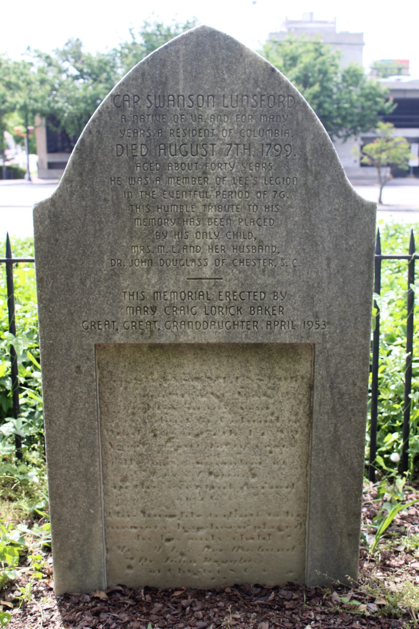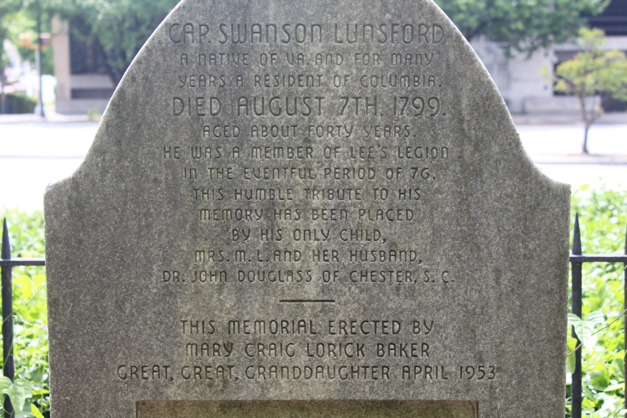 Swanson Lunsford, a Revolutionary War captain and civic leader in eighteenth-century Columbia, is the only person buried on the South Carolina State House grounds. He died of yellow fever in 1799 and was buried on what was then the southwest corner of the State House grounds. City officials were likely worried about the spread of the deadly disease and decided that this was a safer place than a public or church cemetery for Lunsford’s burial. His descendants placed the first marker at the site in 1837. In 1927, the marker attracted attention after being reported "stolen," when Lunsford's great-grandson temporarily removed the marker and had it cleaned by Bruns & Davis. His great-great-granddaughter installed the current gravestone, which encloses the original and repeats its inscription, in 1953.
