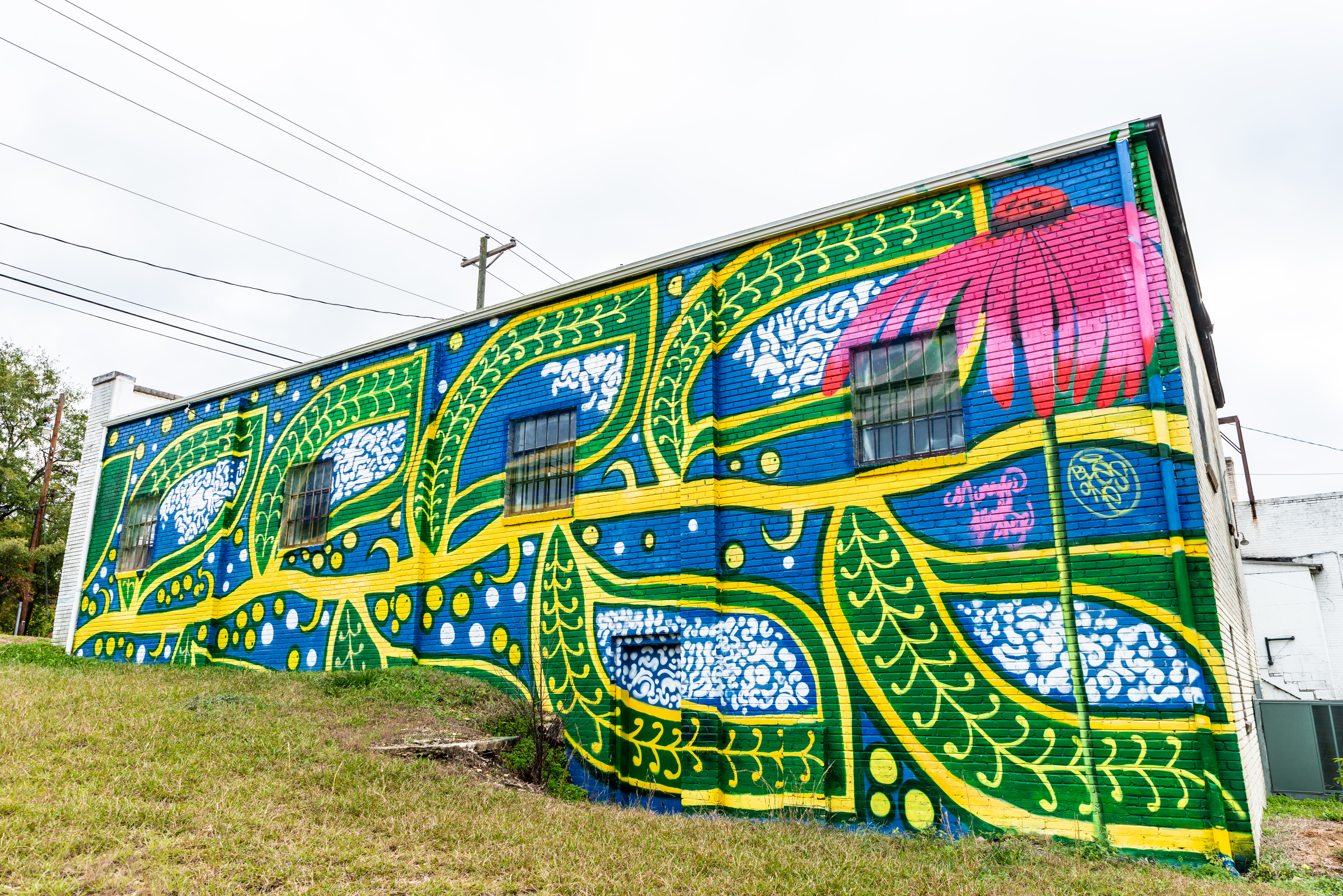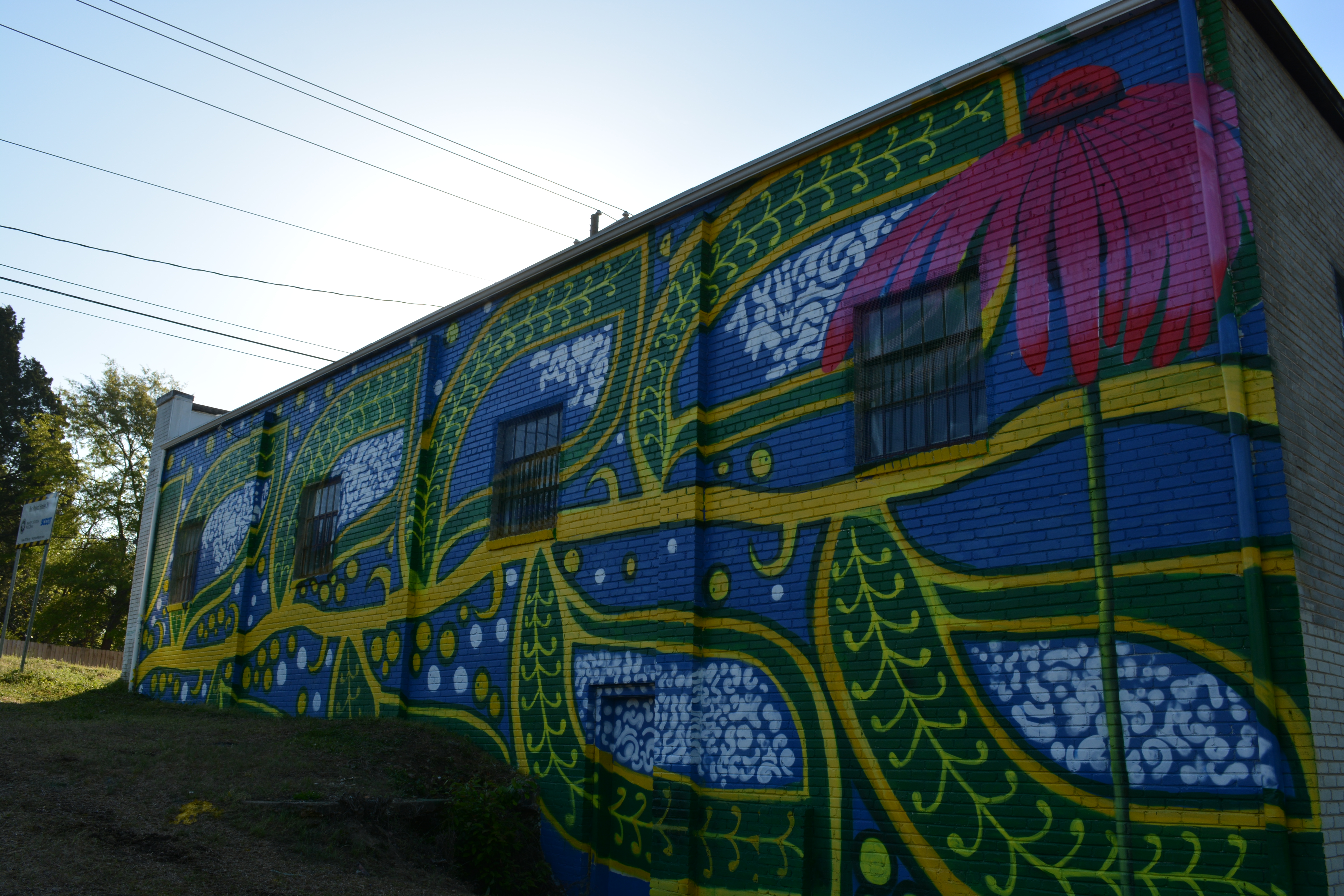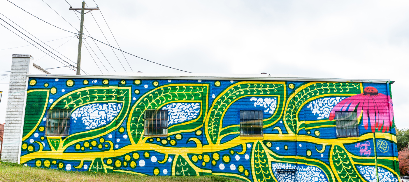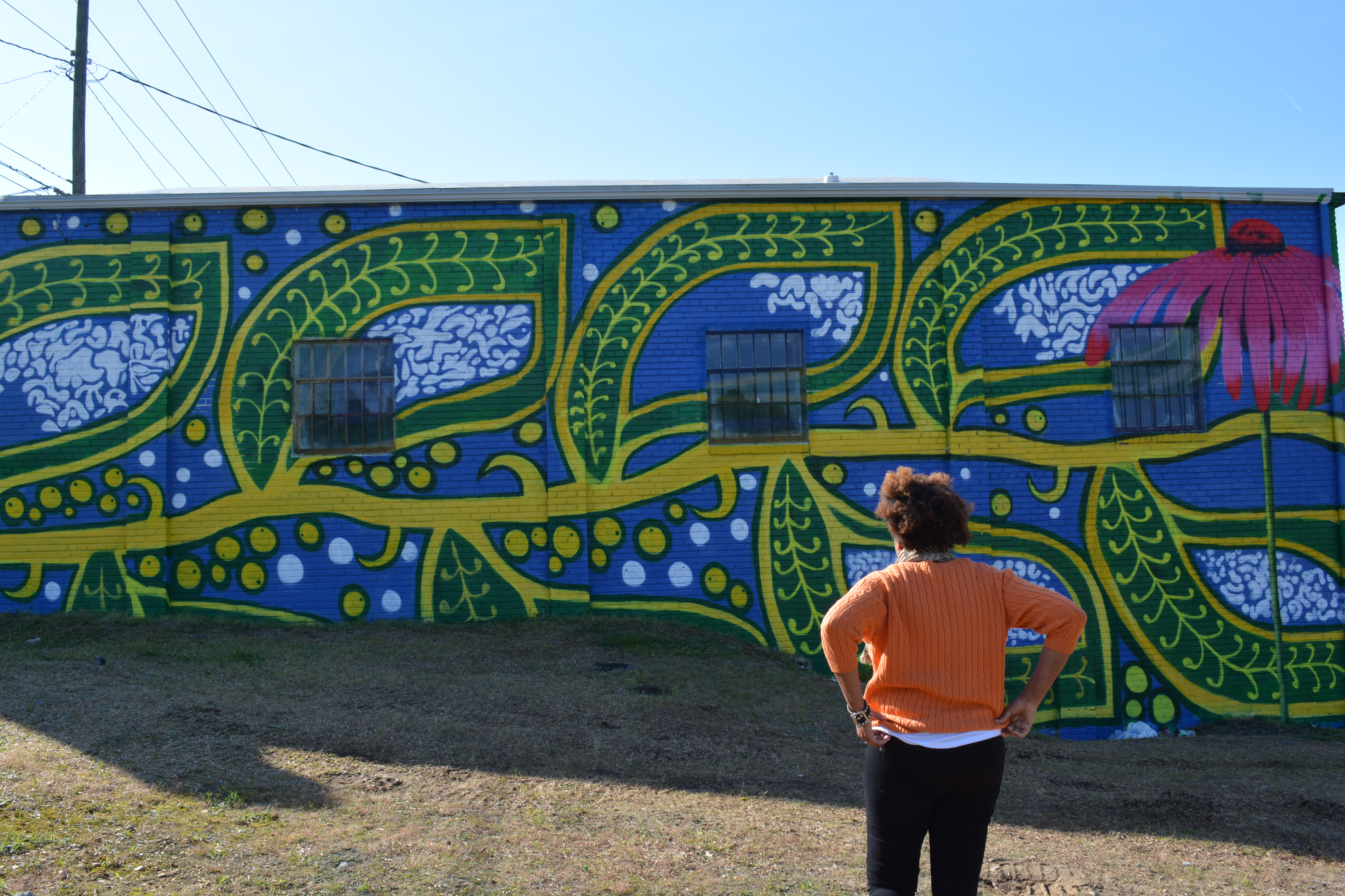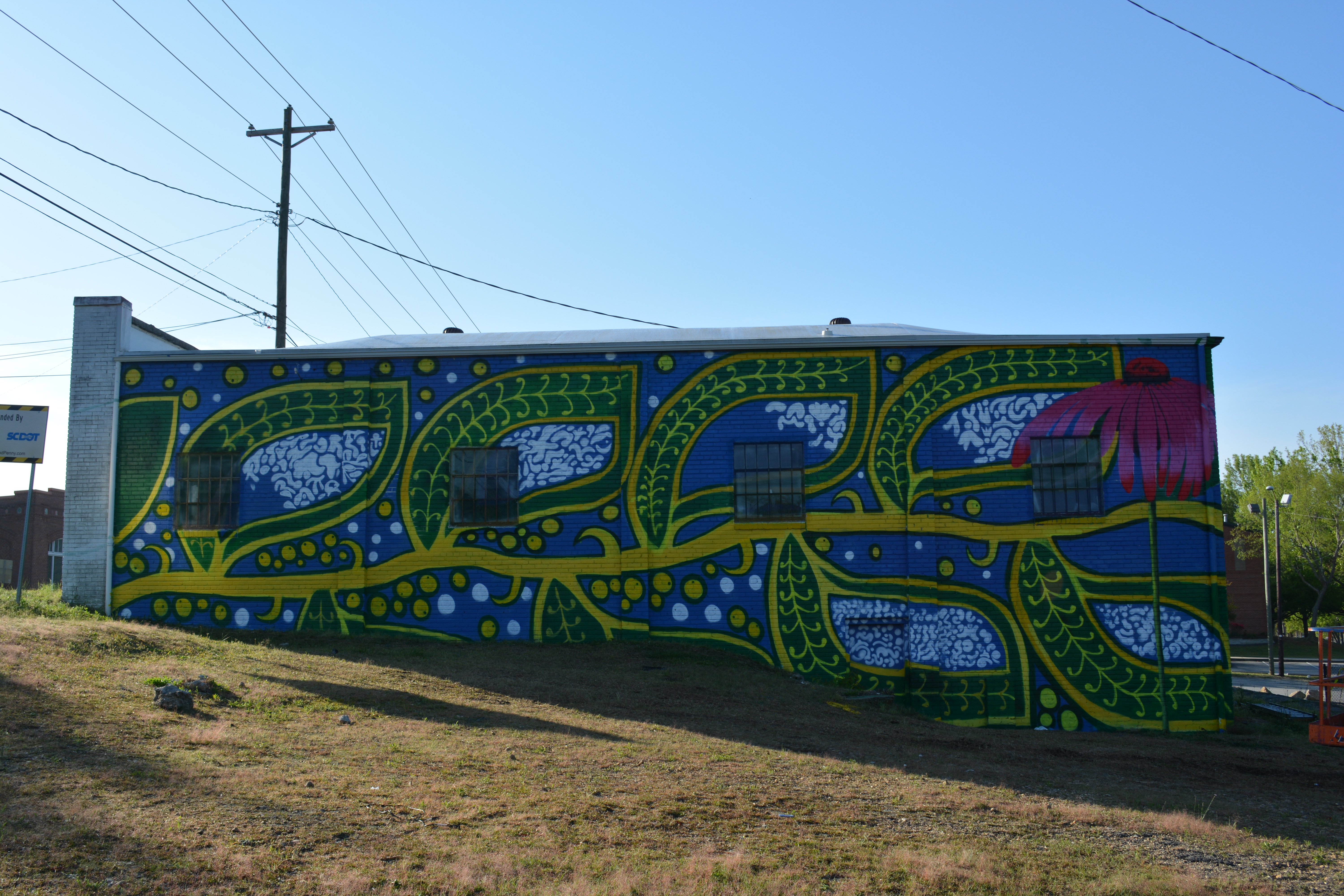 “It has been such a pleasure working with Hyatt Park civic leaders, neighbors and friends to determine the design of this monumental mural, and then within the community to create the wall itself. The resulting 40' x 100' foot image celebrates the commitment within Hyatt Park to create a diverse and inclusive community, evident in the neighborhood network, which maintains the adjacent community garden.” states Ms. Minniefield. “As an African-American artist living and working in the South, I am excited to allow my work to serves as a symbol of pride and commitment to diverse and inclusive histories and cultures living and thriving within a community. The wall features a vibrant pattern common to West African fabric, a signature element in my work. The pattern chosen for the Hyatt Park wall depicts a growing vine rich in color and hopefulness. The mural literally appears to grow out of the Hyatt Park community garden below. It also features a giant Echinacea flower, which actually blooms in the garden. The flower symbolizes healing as it extends into the air as if it too is a product of the collective investment made by the neighbors in the area. I am really honored to know that my work will forever highlight the beauty which is Hyatt Park.”