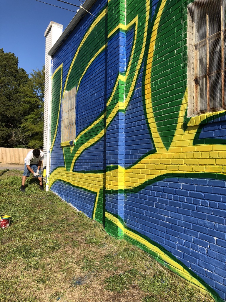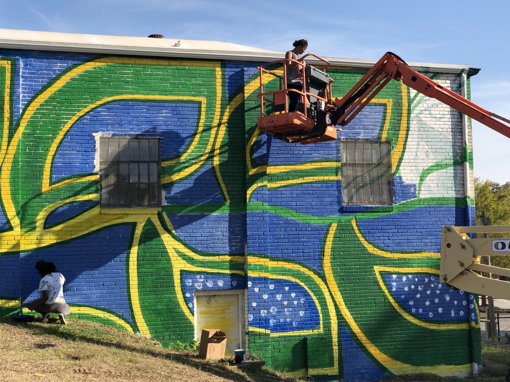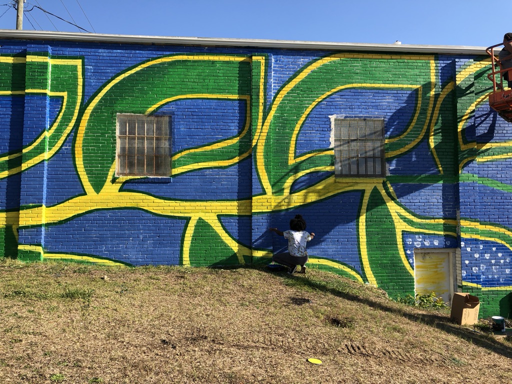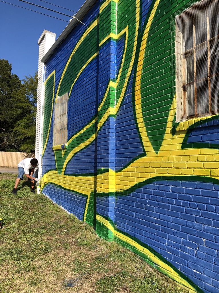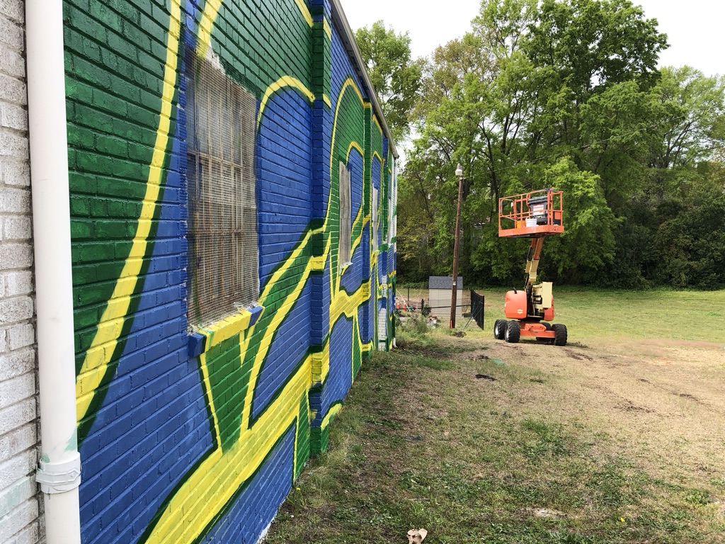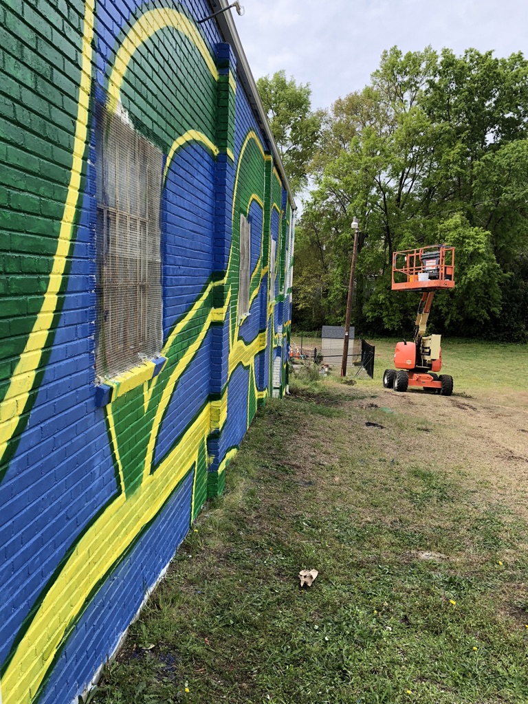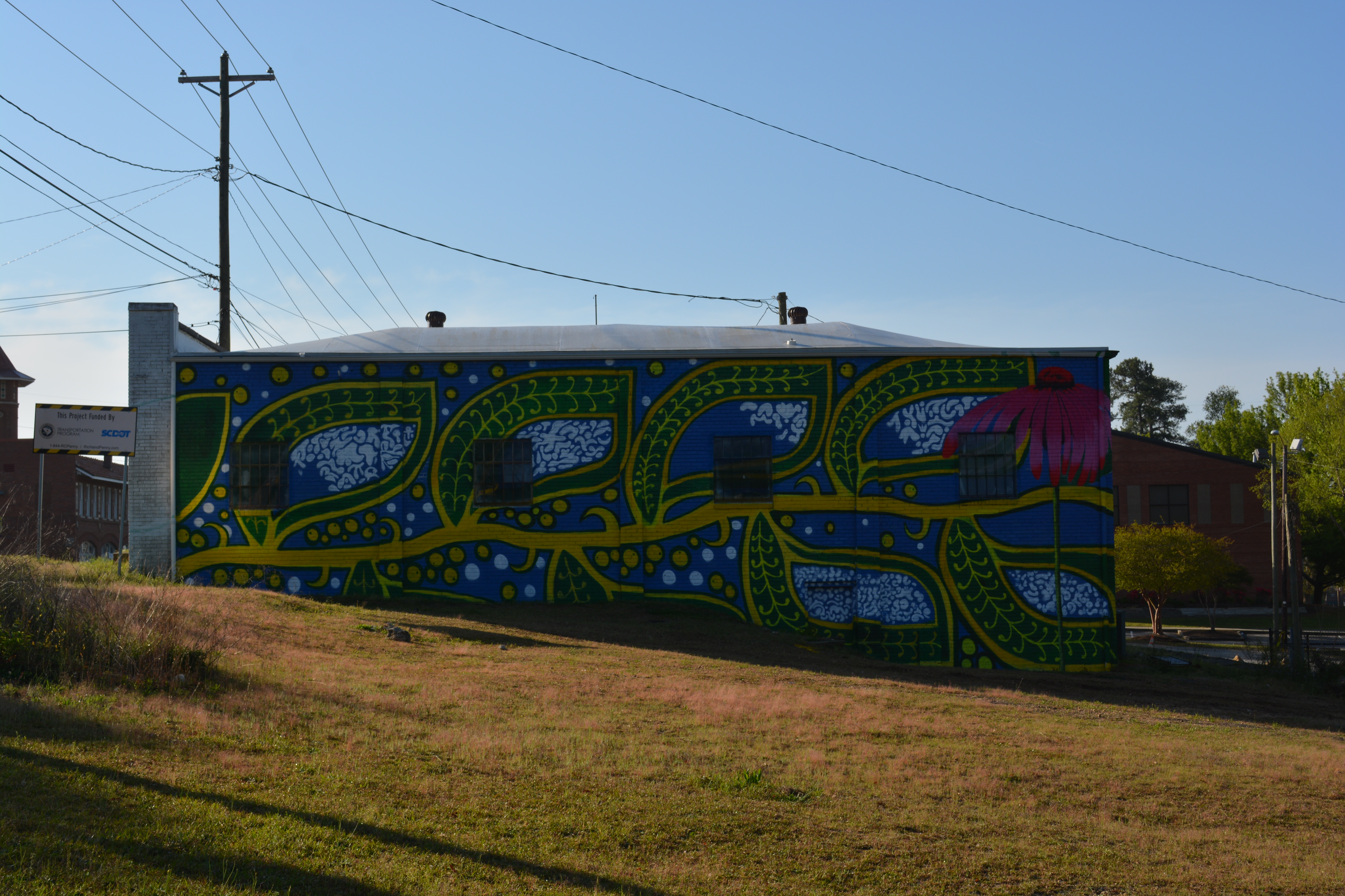 Designed by artist Charmaine Minniefield, the vibrant colors and flowing movement provide a distinct backdrop to the community and the elements reference African fabric and flora related to the adjacent Hyatt Park Community Garden. Ms. Minniefield installed the mural along with artists Sean Irving and Keenan High School student Zoe Jackson.