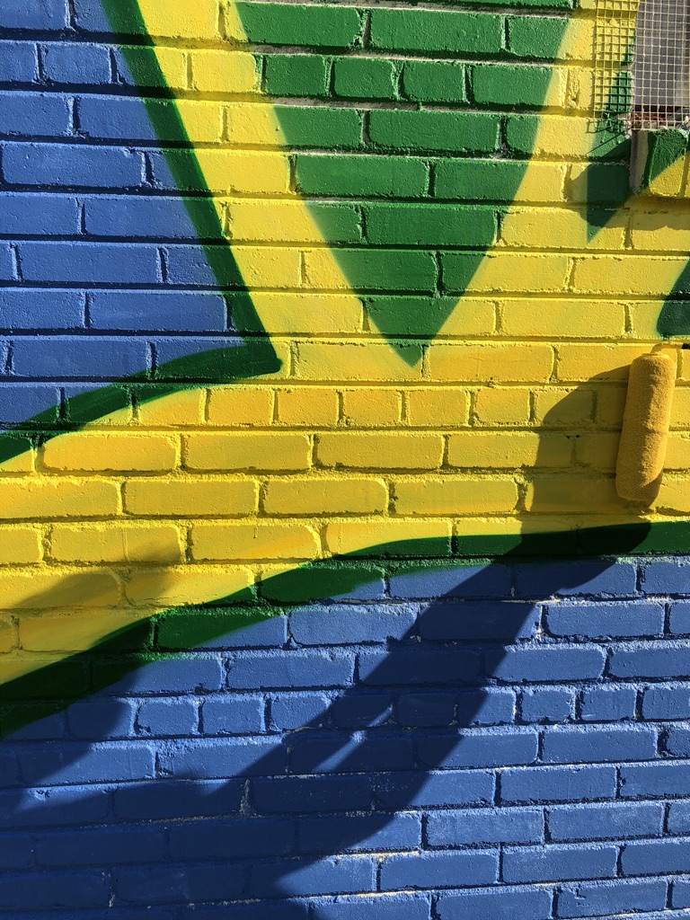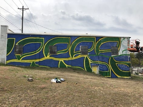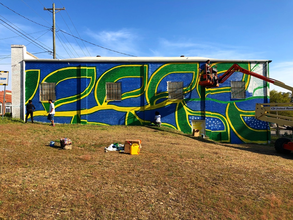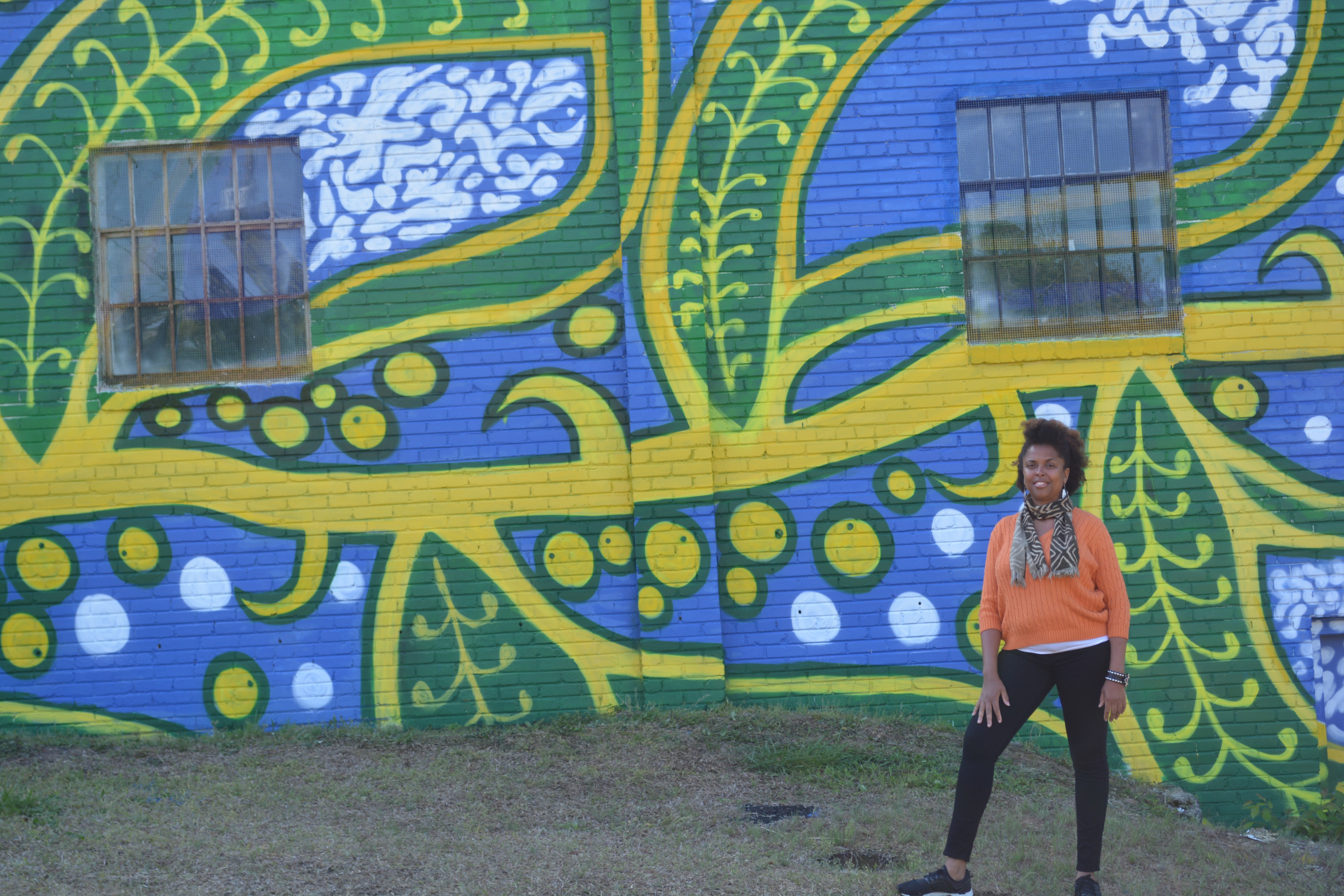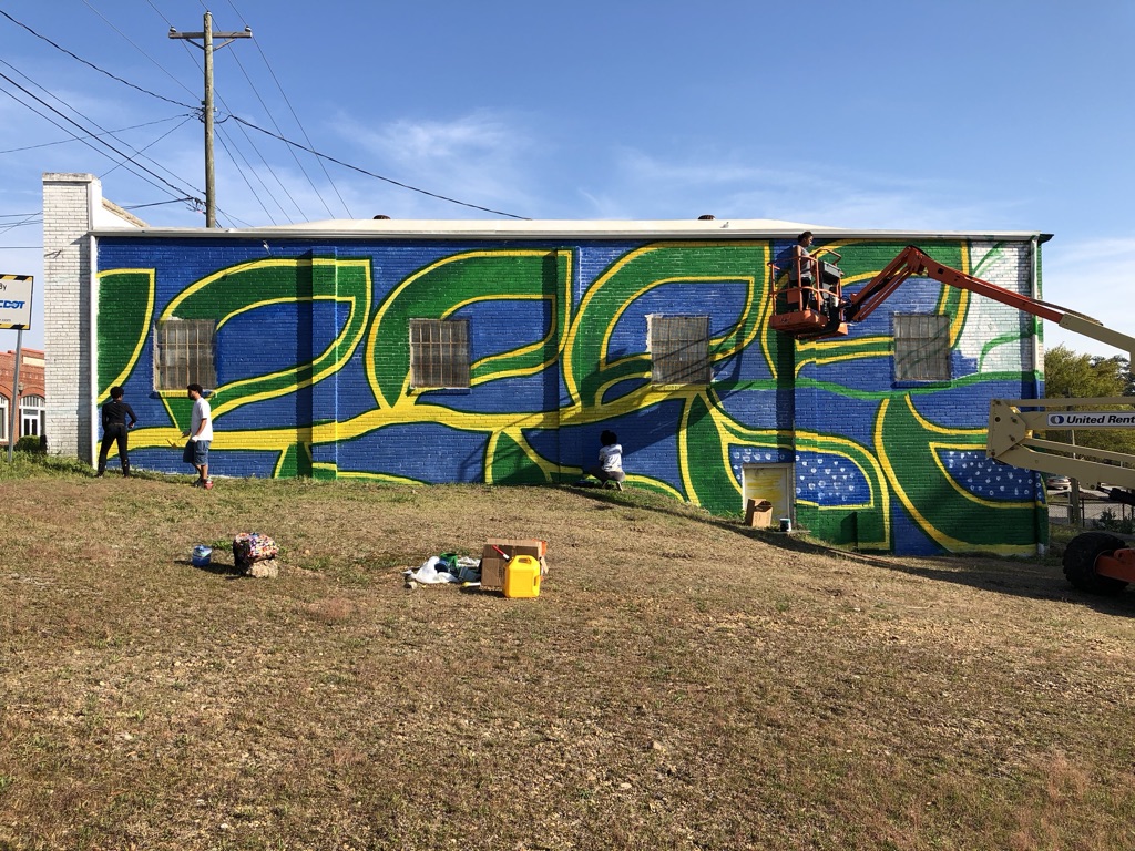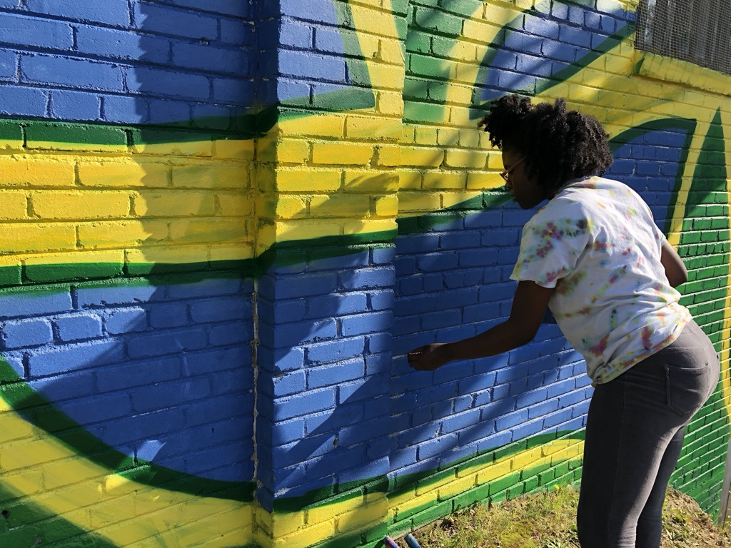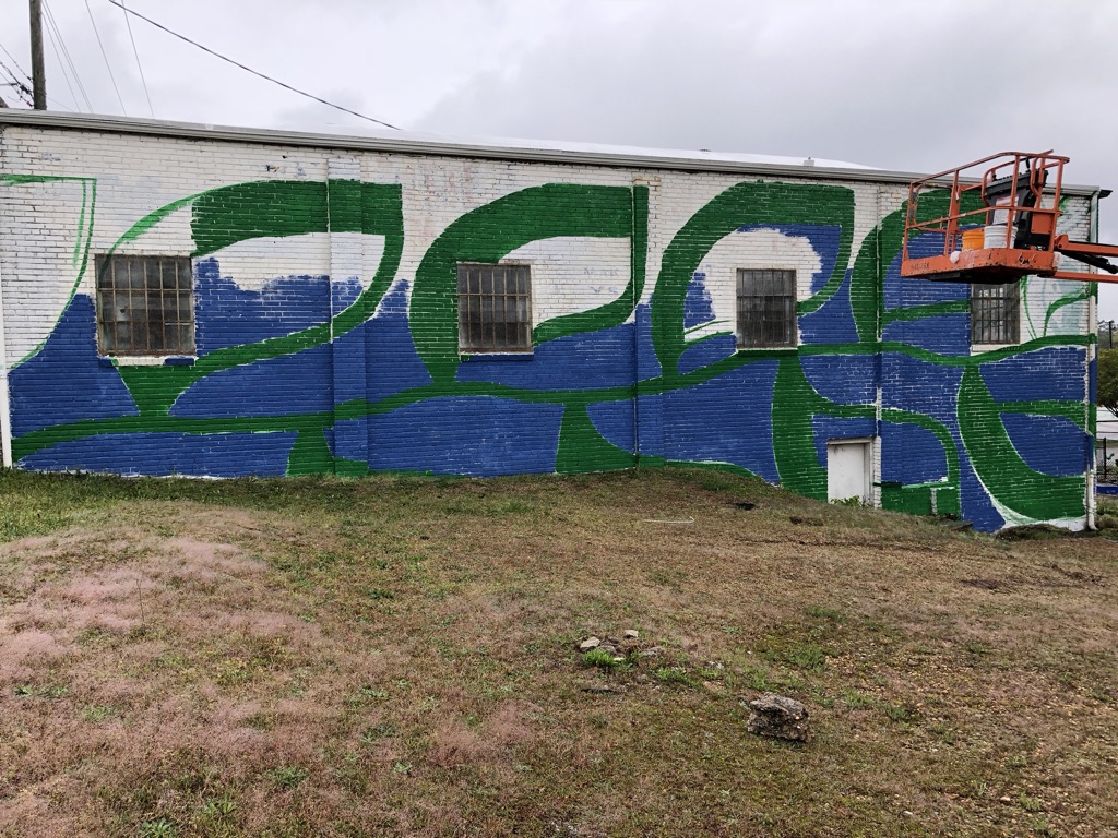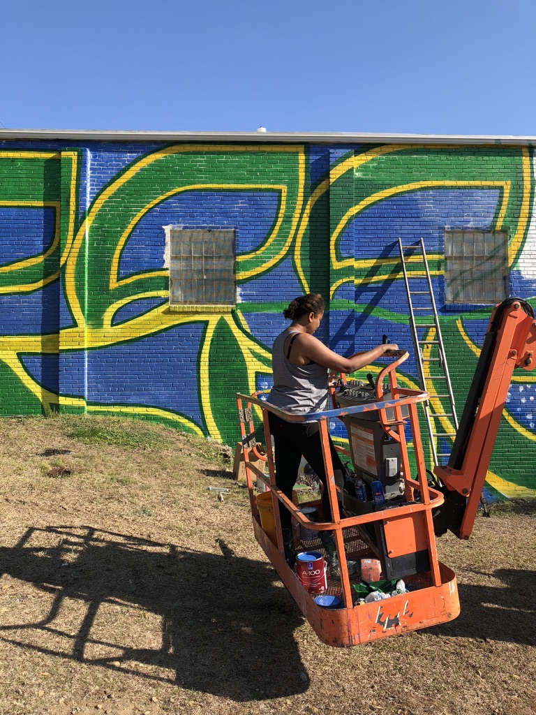 Designed by artist Charmaine Minniefield, the vibrant colors and flowing movement provide a distinct backdrop to the community and the elements reference African fabric and flora related to the adjacent Hyatt Park Community Garden. Ms. Minniefield installed the mural along with artists Sean Irving and Keenan High School student Zoe Jackson.