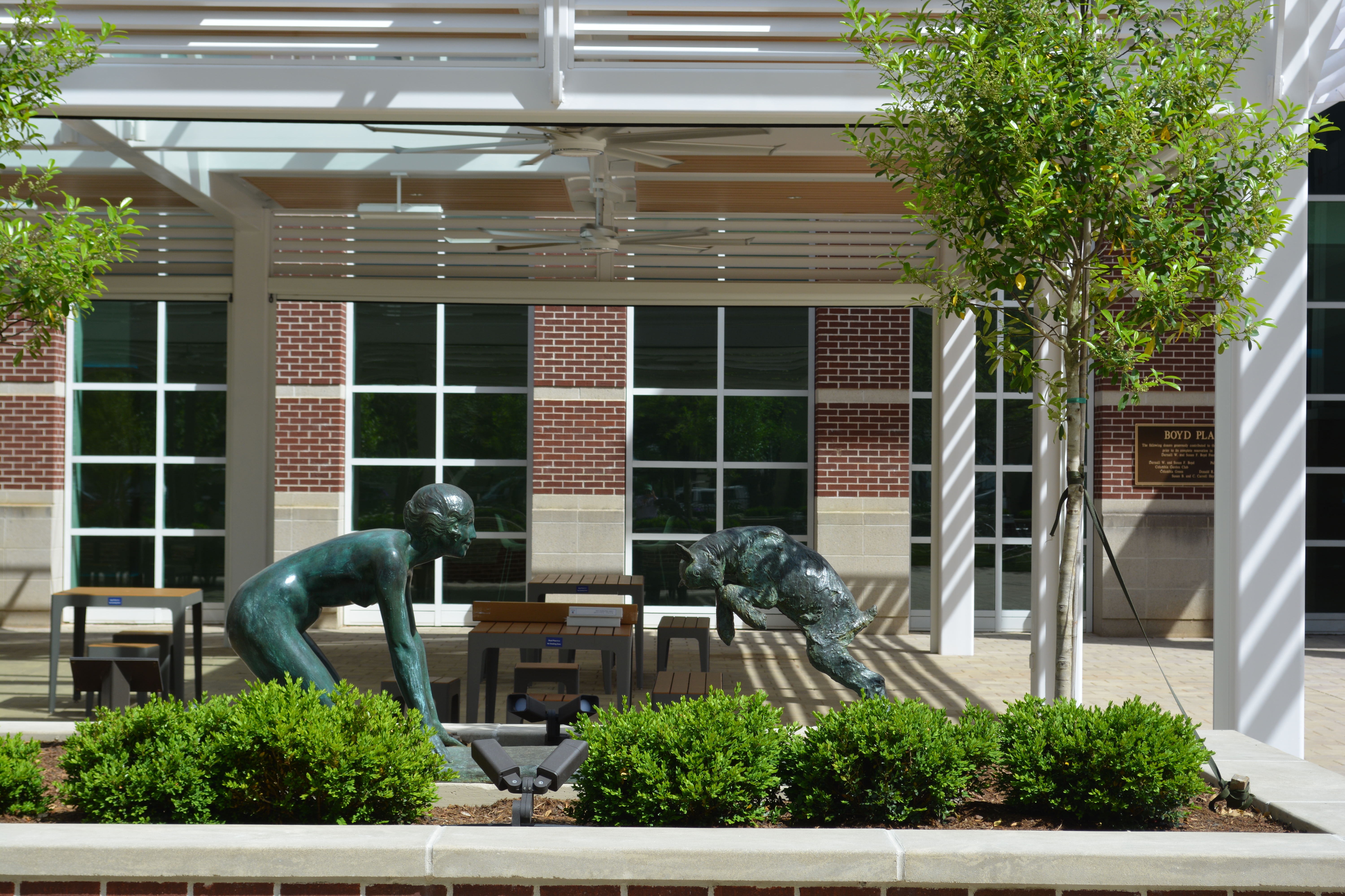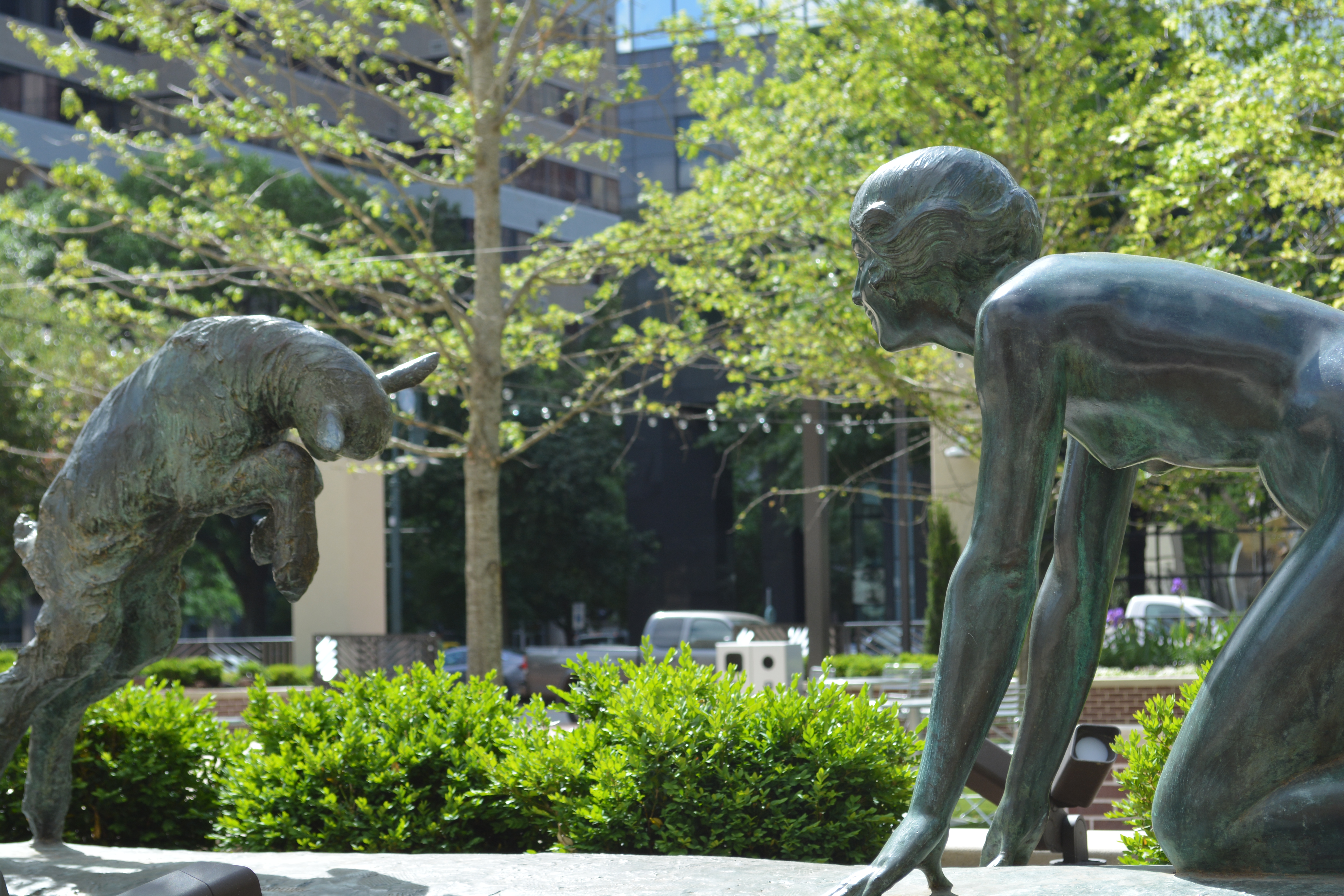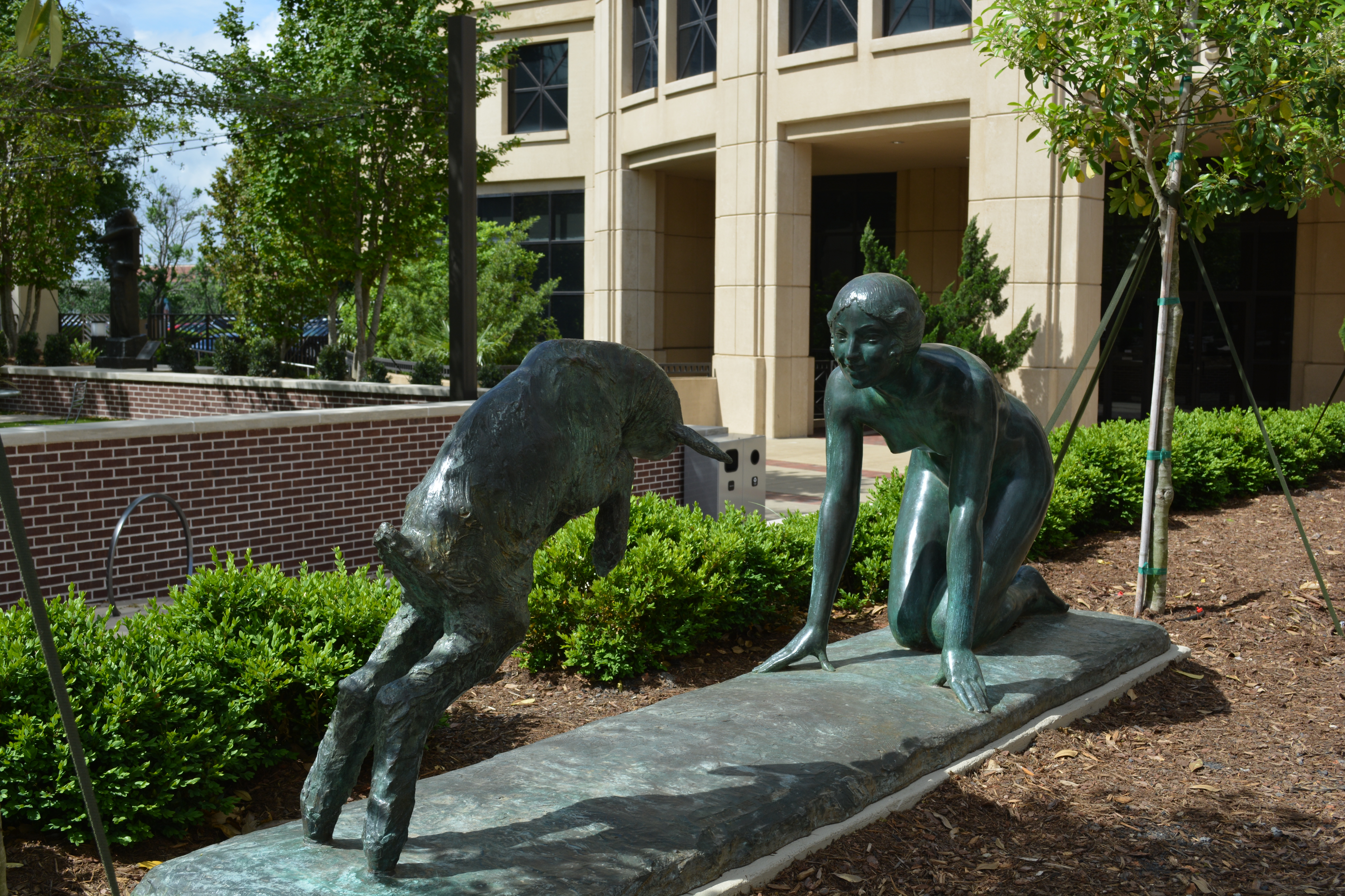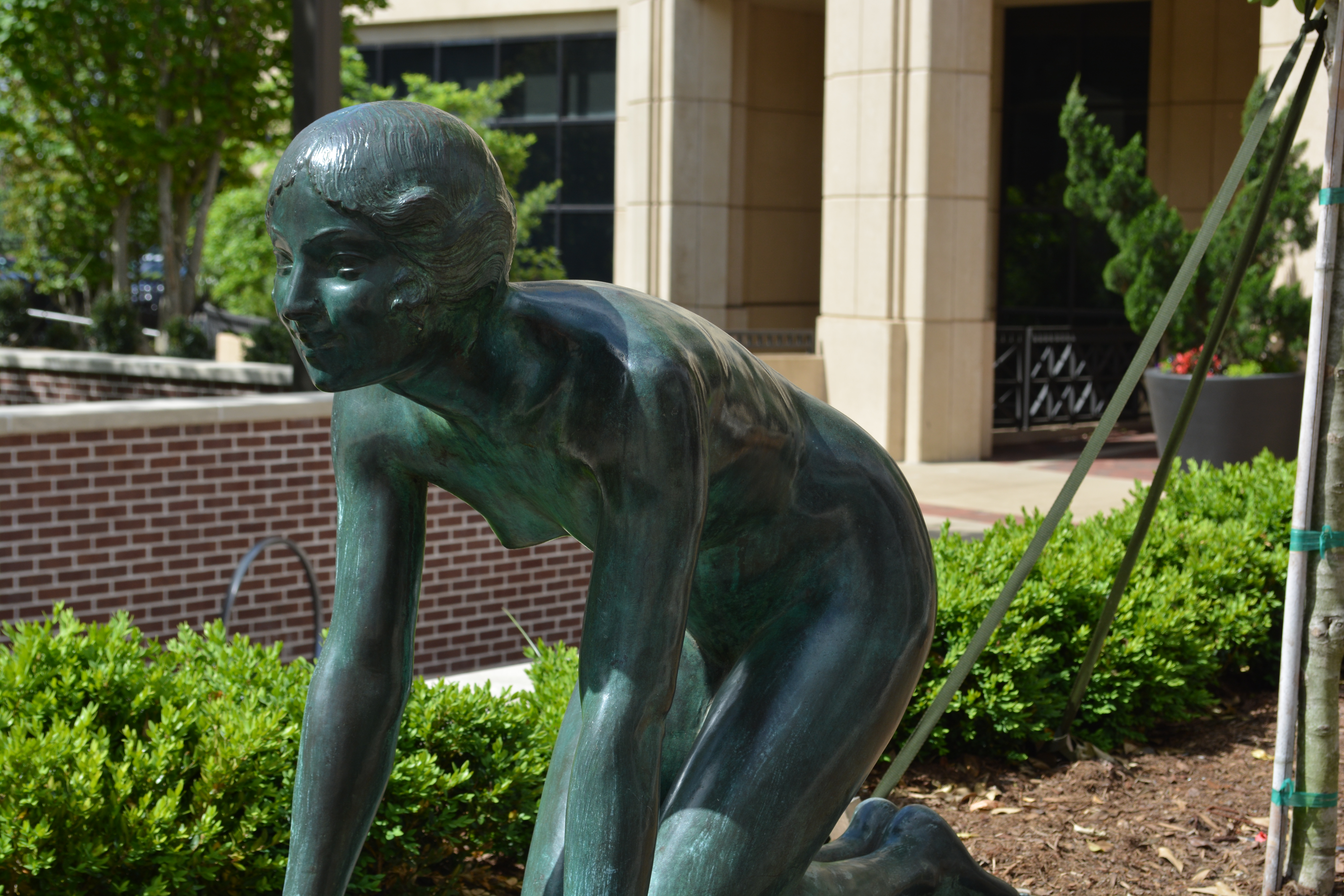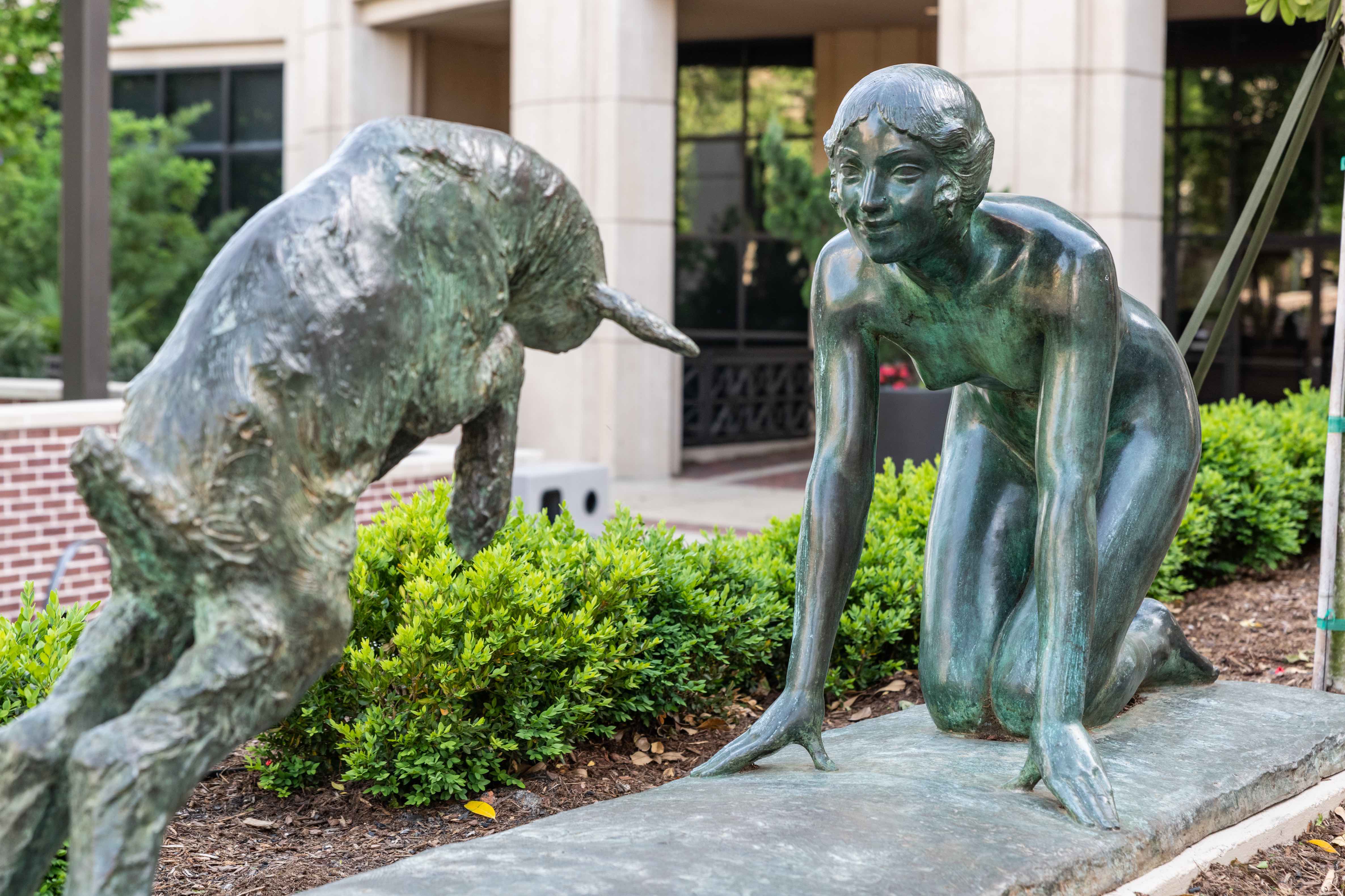 A bronze sculpture featuring a young woman playing with a lamb by artist Paul Silvestre, a French sculptor who died in 1976 at the age of 92.