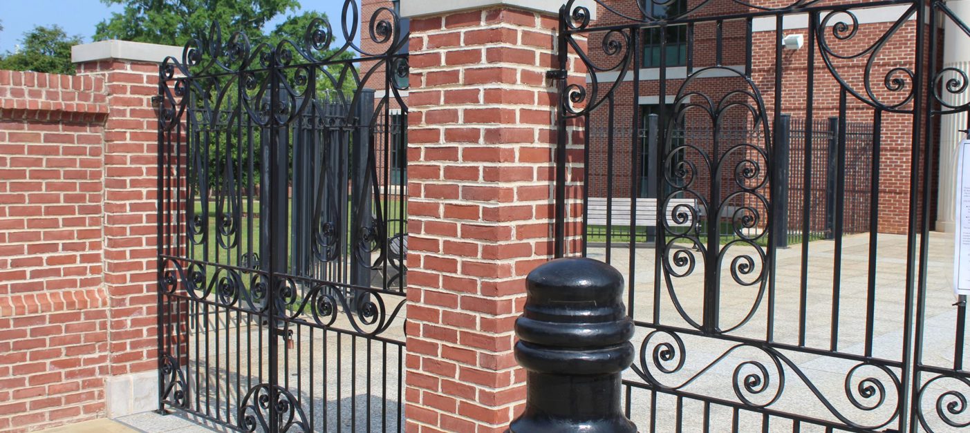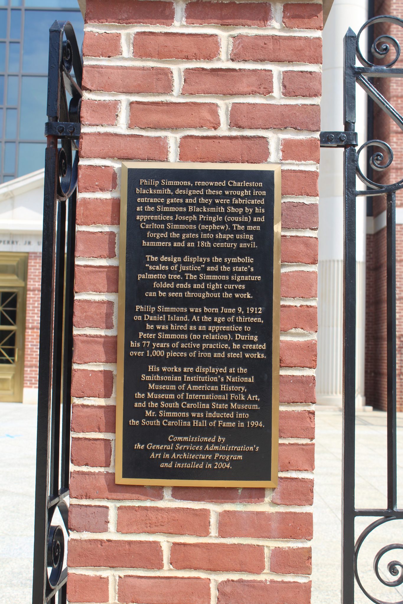 The entry gate was made by African American blacksmith Phillip Simmons from Charleston. Simmons is known for elevating the practice of blacksmithing from utilitarian items such as nails, horseshoes and hinges to decorative pieces including gates and archways featuring native plants and animals.