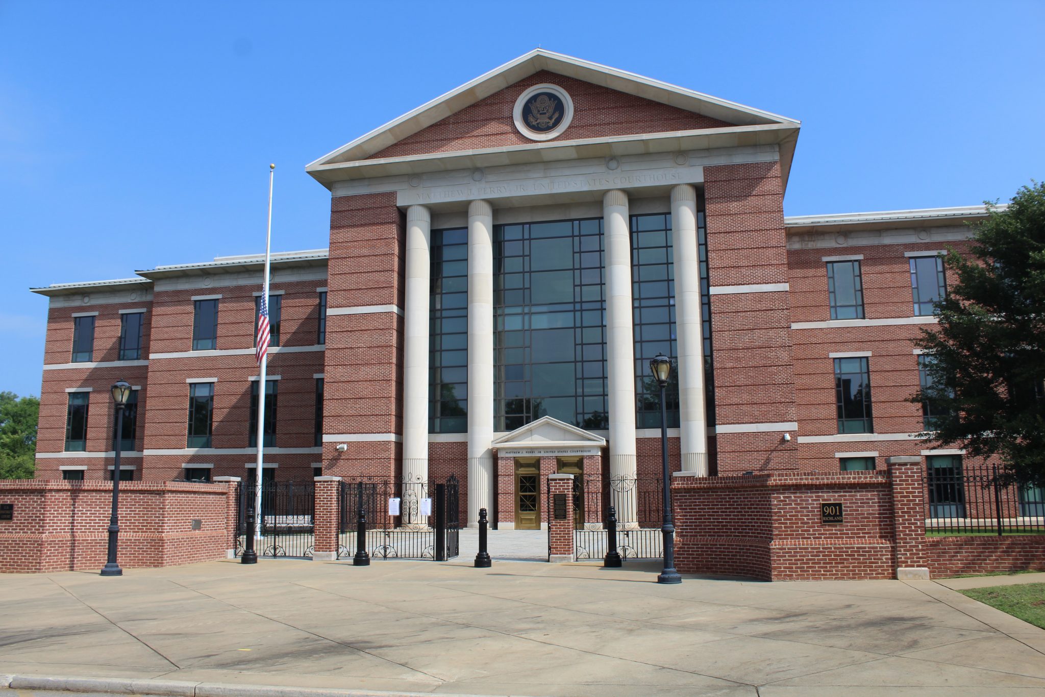 The design displays symbolic "scales of justice" and the state's palmetto tree. The Simmons signature folded ends and tight curves can be seen throughout the work.