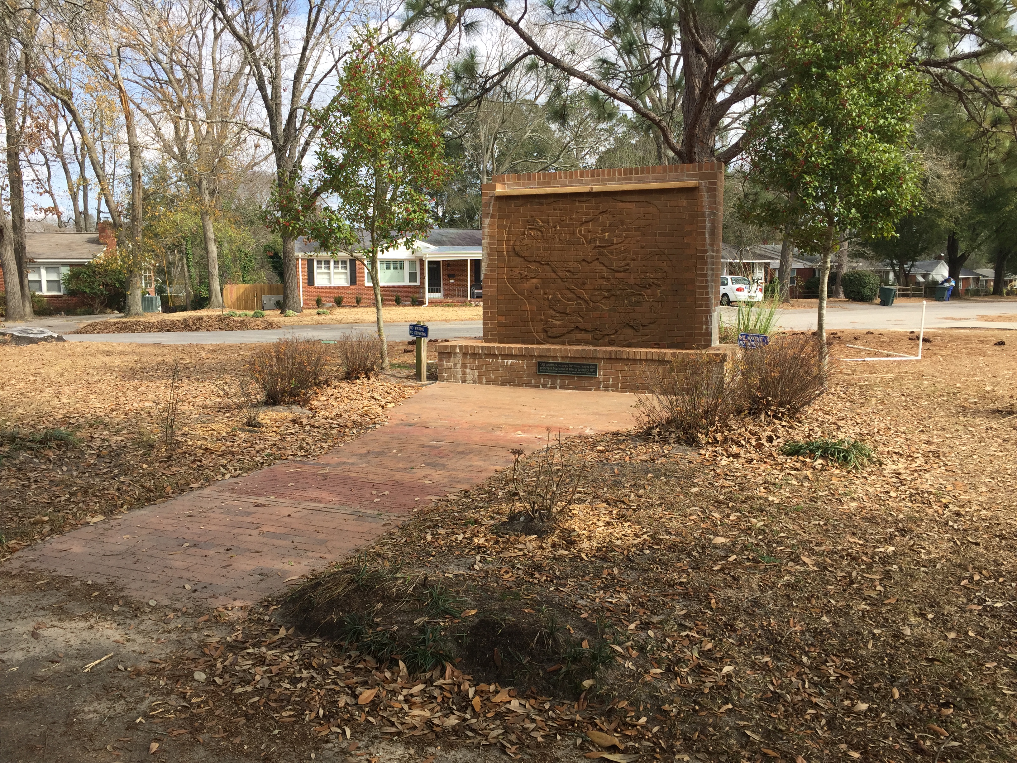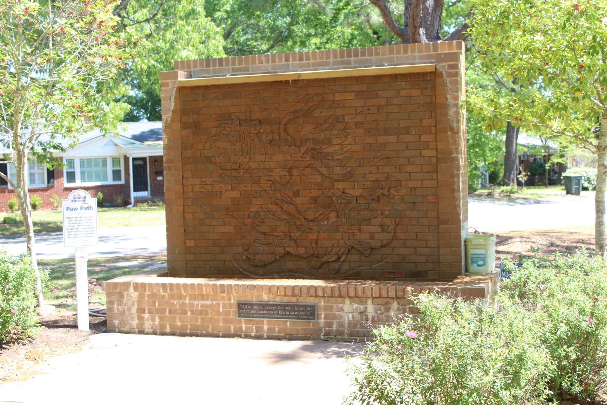 The Paw Path in Rosewood Park. A fountain, which includes a carved brick sculpture by Columbia artist Mike Bise, rests at the end of The Paw Path, a growing sidewalk of engraved bricks purchased from The Animal Mission to honor and memorialize beloved pets and friends of pets. The Paw Path project is a collaborative effort of The Animal Mission, The City of Columbia, Rosewood Community Council, and Carolina Ceramics Brick Company.