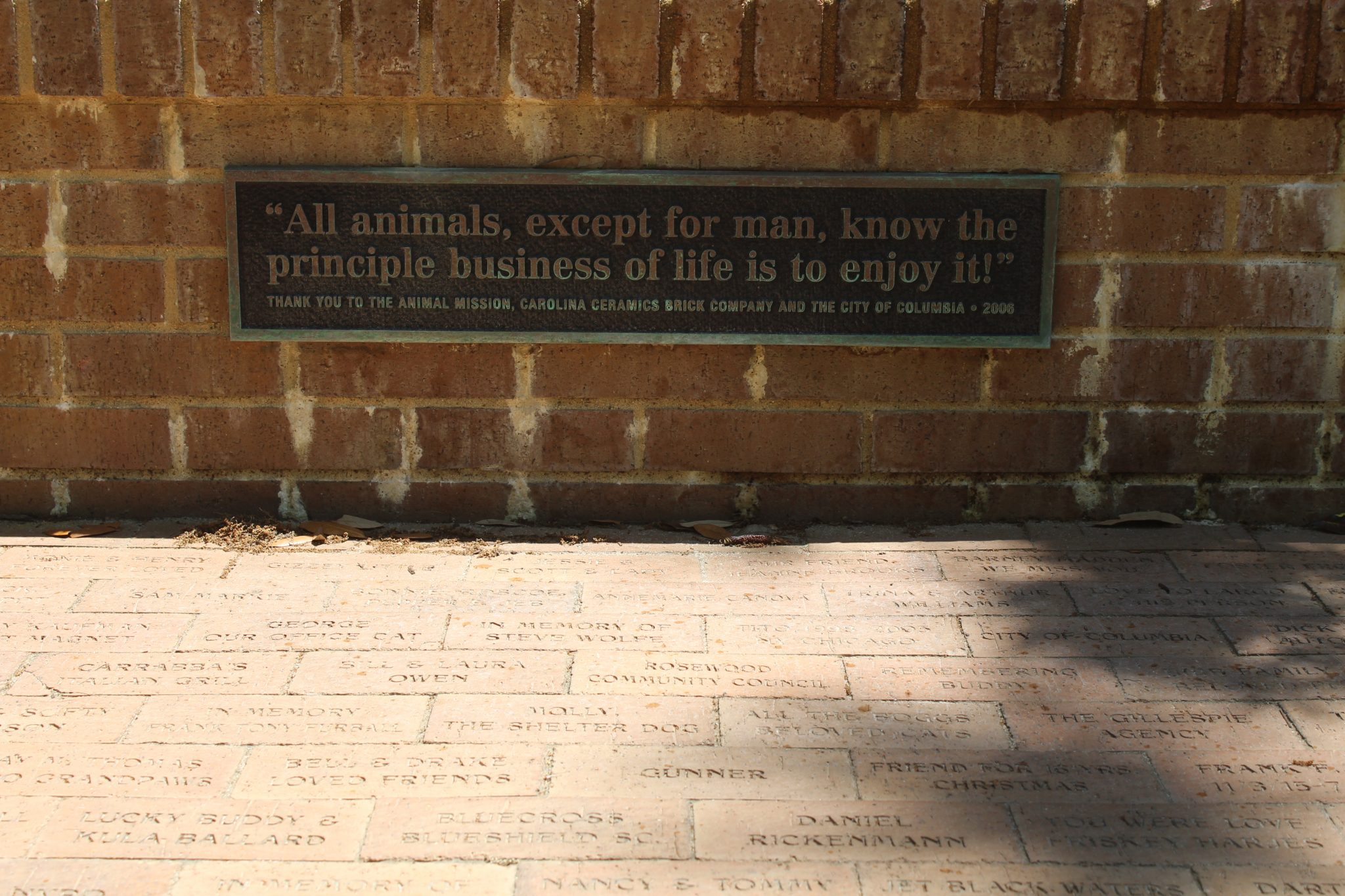 Dedicated in 2006, the Paw Path fountain located at Rosewood Park (901 S. Holly Street, Columbia SC 29205) is a collaborative effort between the City of Columbia Parks and Recreation Department and the Animal Mission. Paved with tributes, memorials, and remembrances of pets and pet lovers alike, this installation features a carved brick sculpture by artist Mike Bise. Each brick costs $50 and all proceeds benefit the Animal Mission’s spay and neuter program, in an effort to achieve No-Kill status for the Midlands shelters.