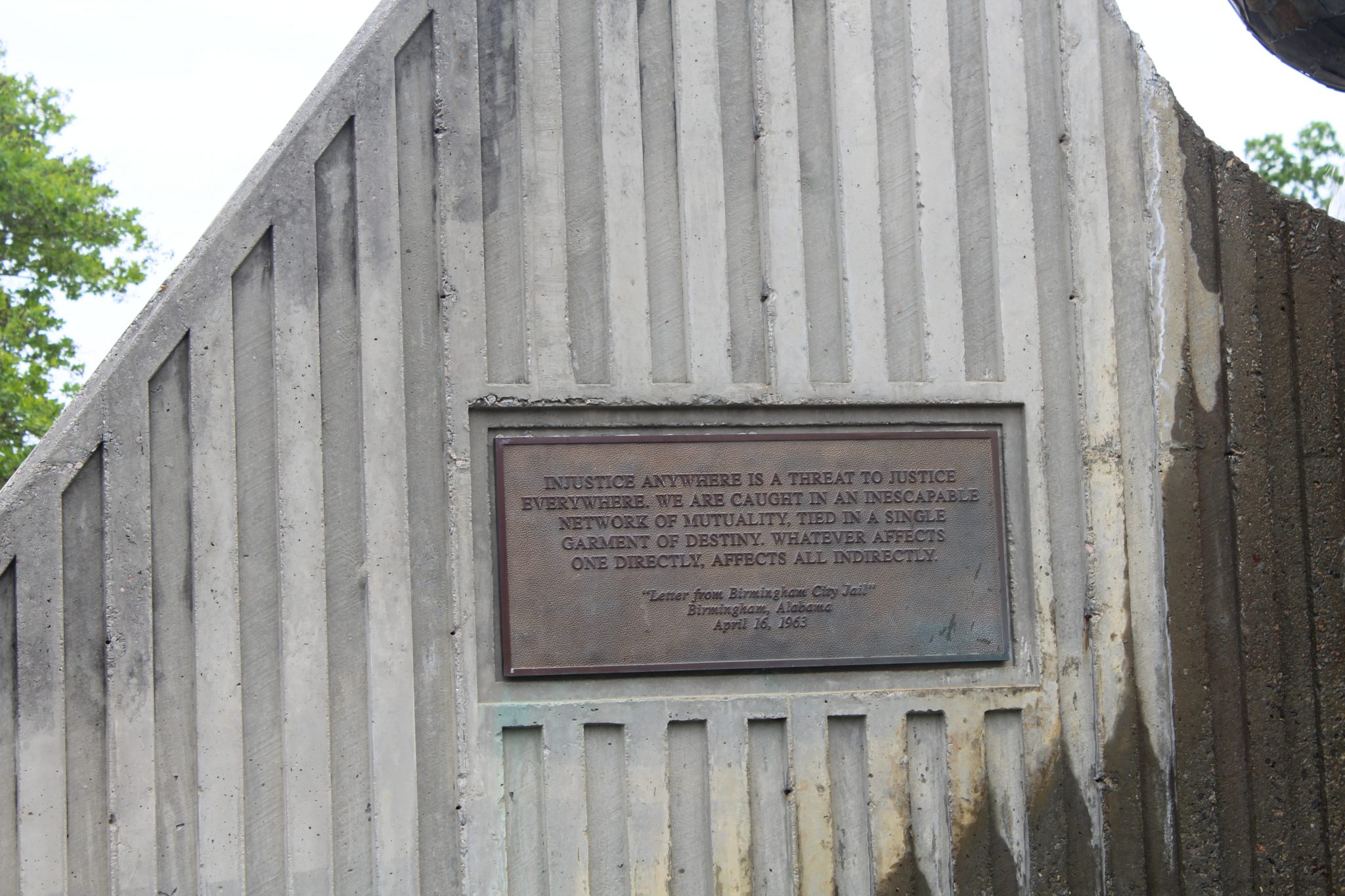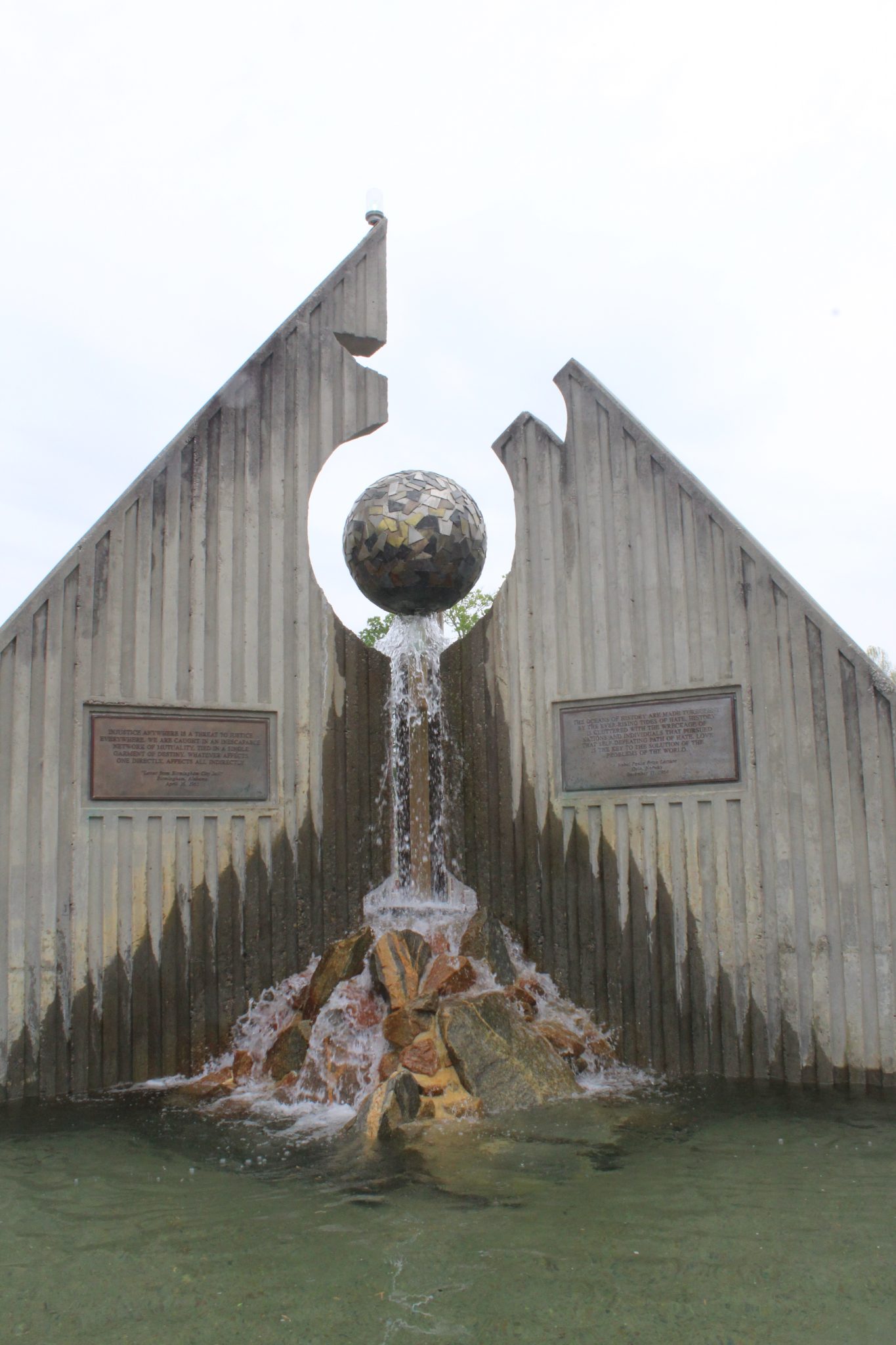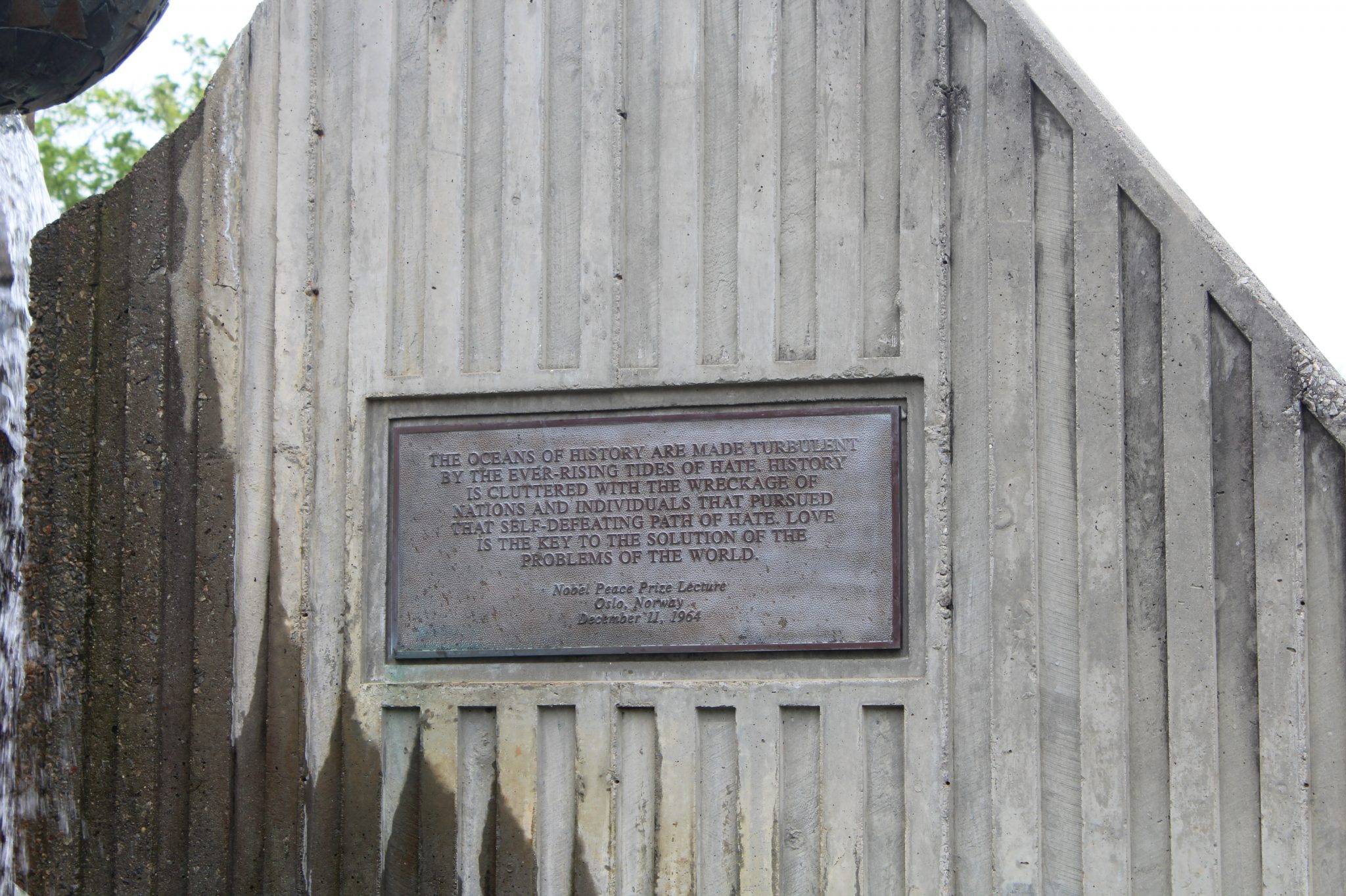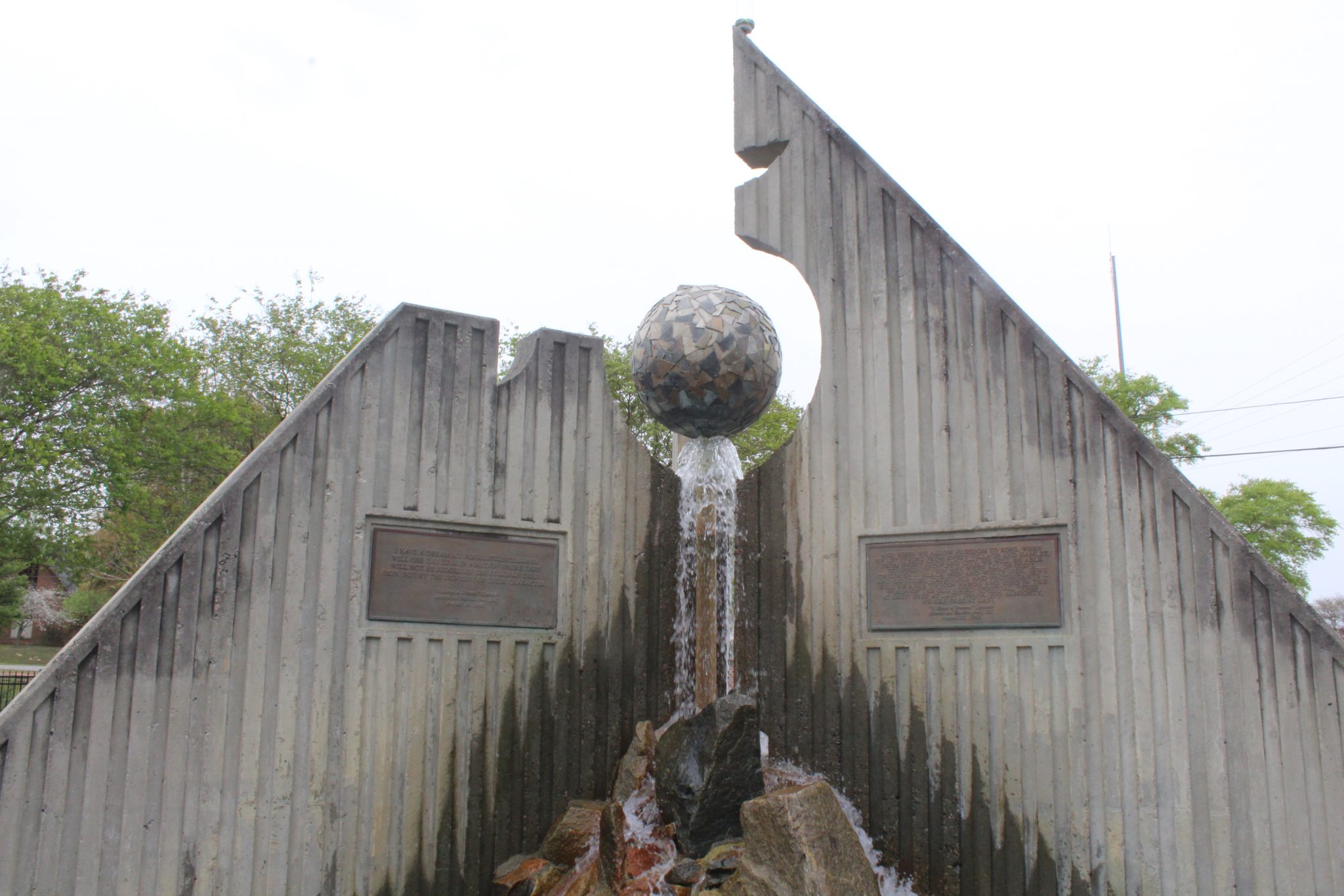 A stone carved with part of 'I have a dream' sits near a fountain with other famous MLK quotes in a plaza dedicated to the famous civil rights leader. A historic plaque is found a few blocks away.