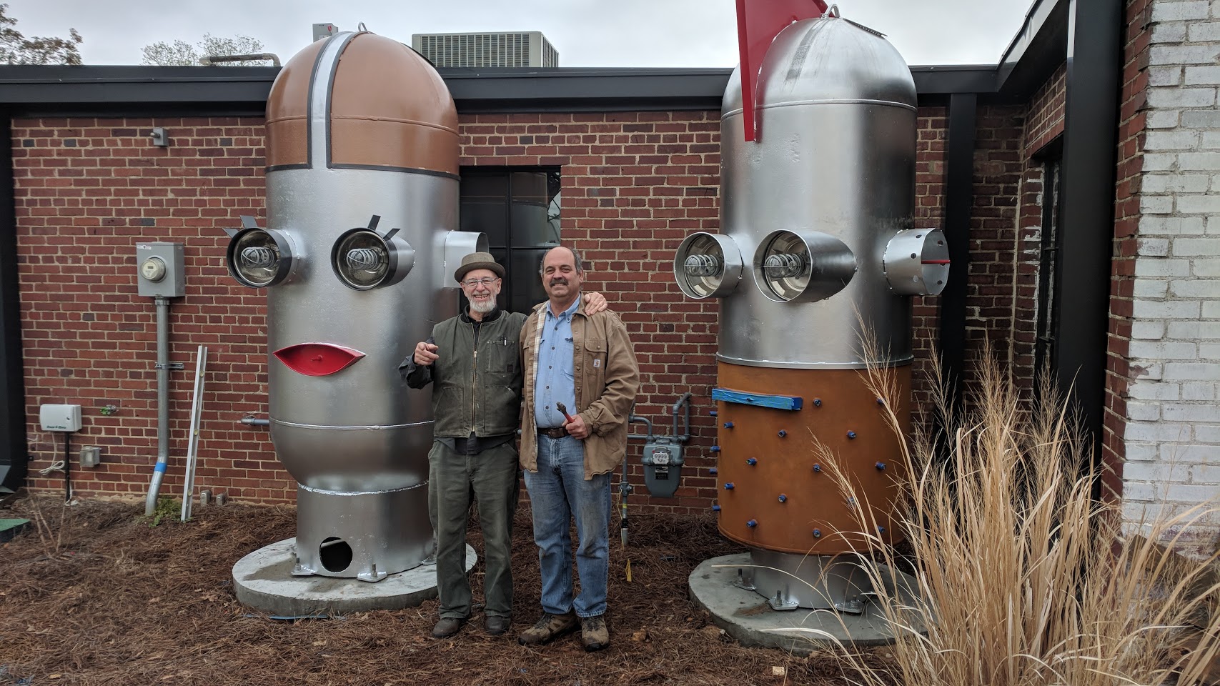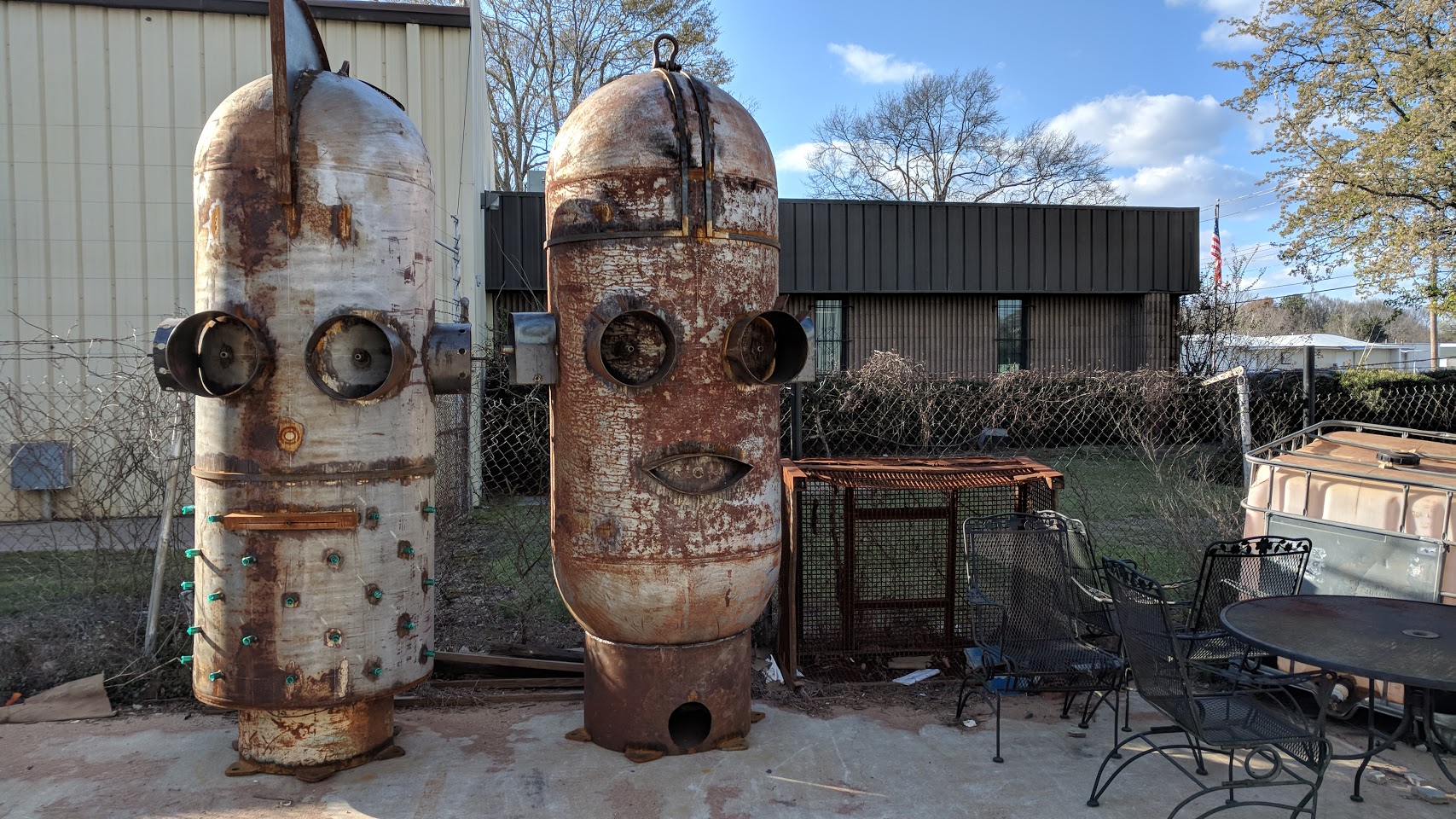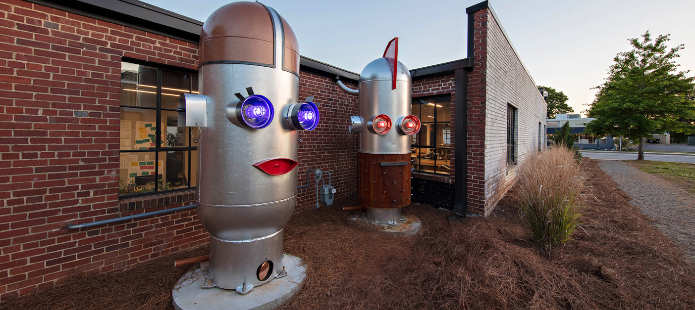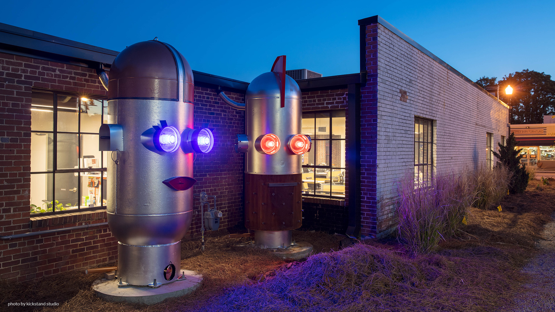 After experiencing two rounds of storm-induced flood damage in one year, Studio 2LR Architecture + Interiors needed to do something both functional and creative to protect their offices from future flood damage. Studio 2LR opted to partner with local companies to design and build a custom solution rather than purchase anything off the shelf. In collaboration with Clark Ellefson (Lewis + Clark) and Chris Stuyck (Stuyck Company), two decommissioned propane tanks were transformed into operable robot cisterns. They are designed to collect rain water from the roof gutters during rain events, then slowly disperse the water through a mouth spout and/or a release valve at the bottom of the sculpture. The robots have also become neighborhood celebrities #NOMARobots