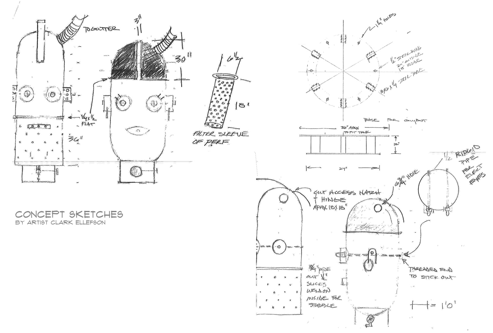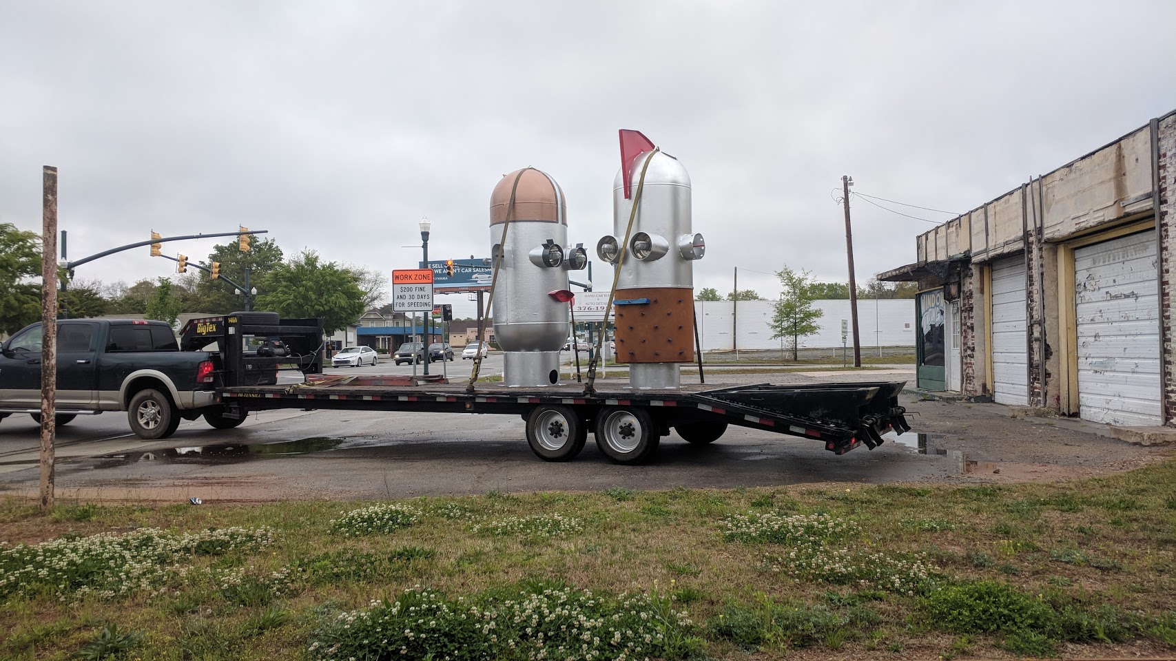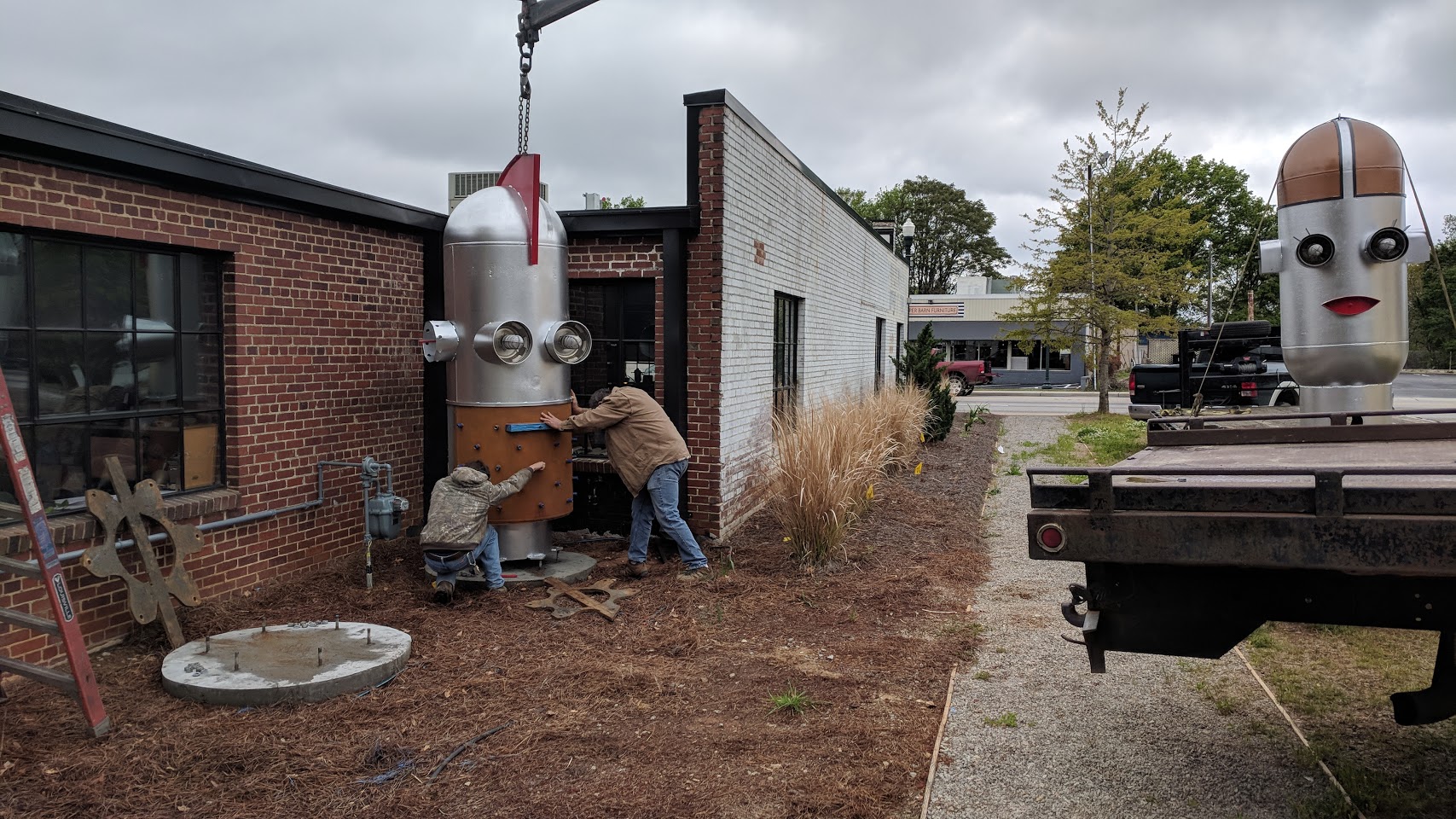After experiencing two rounds of storm-induced flood damage in one year, Studio 2LR Architecture + Interiors needed to do something both functional and creative to protect their offices from future flood damage. Studio 2LR opted to partner with local companies to design and build a custom solution rather than purchase anything off the shelf. In collaboration with Clark Ellefson (Lewis + Clark) and Chris Stuyck (Stuyck Company), two decommissioned propane tanks were transformed into operable robot cisterns. They are designed to collect rain water from the roof gutters during rain events, then slowly disperse the water through a mouth spout and/or a release valve at the bottom of the sculpture. The robots have also become neighborhood celebrities #NOMARobots