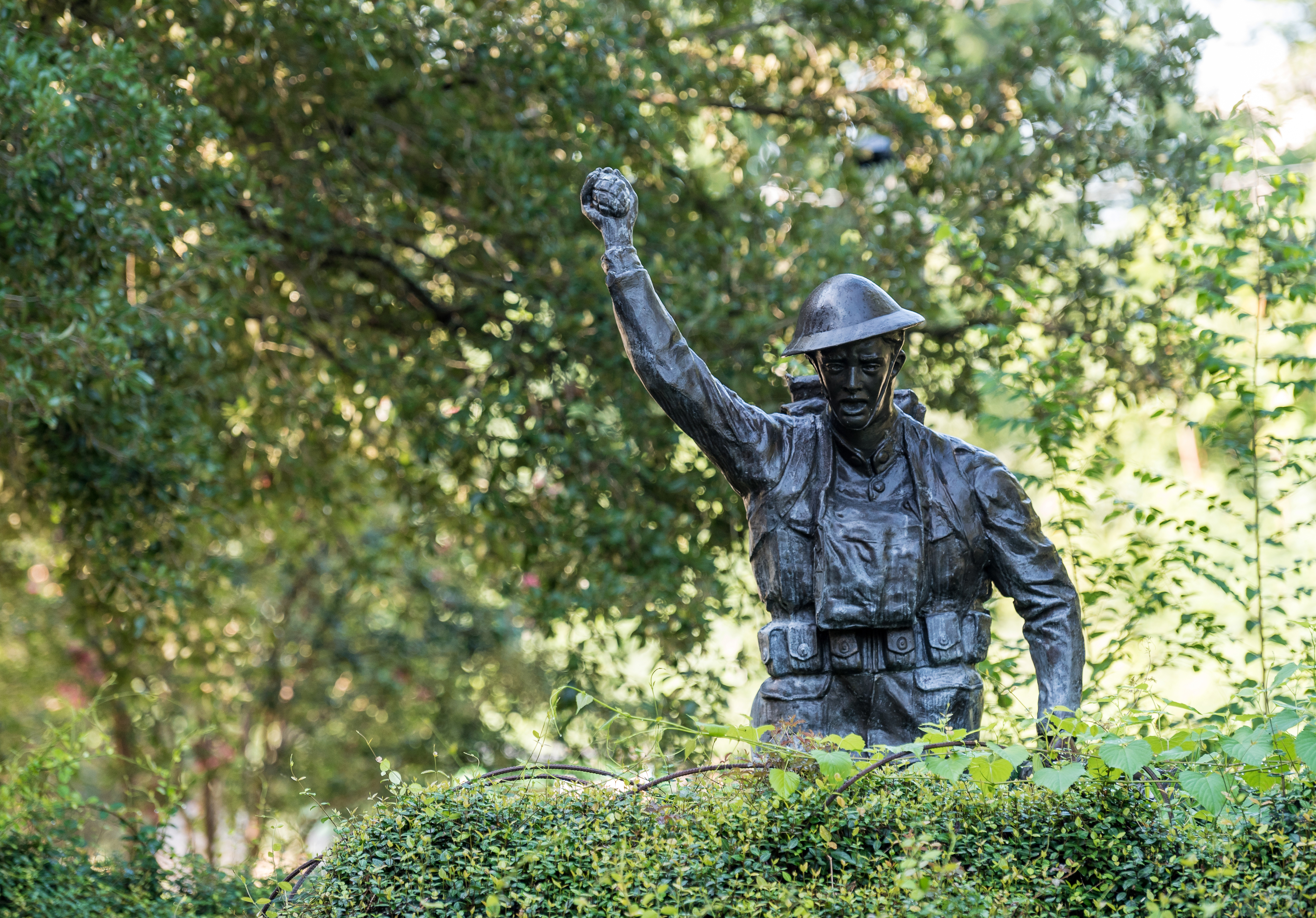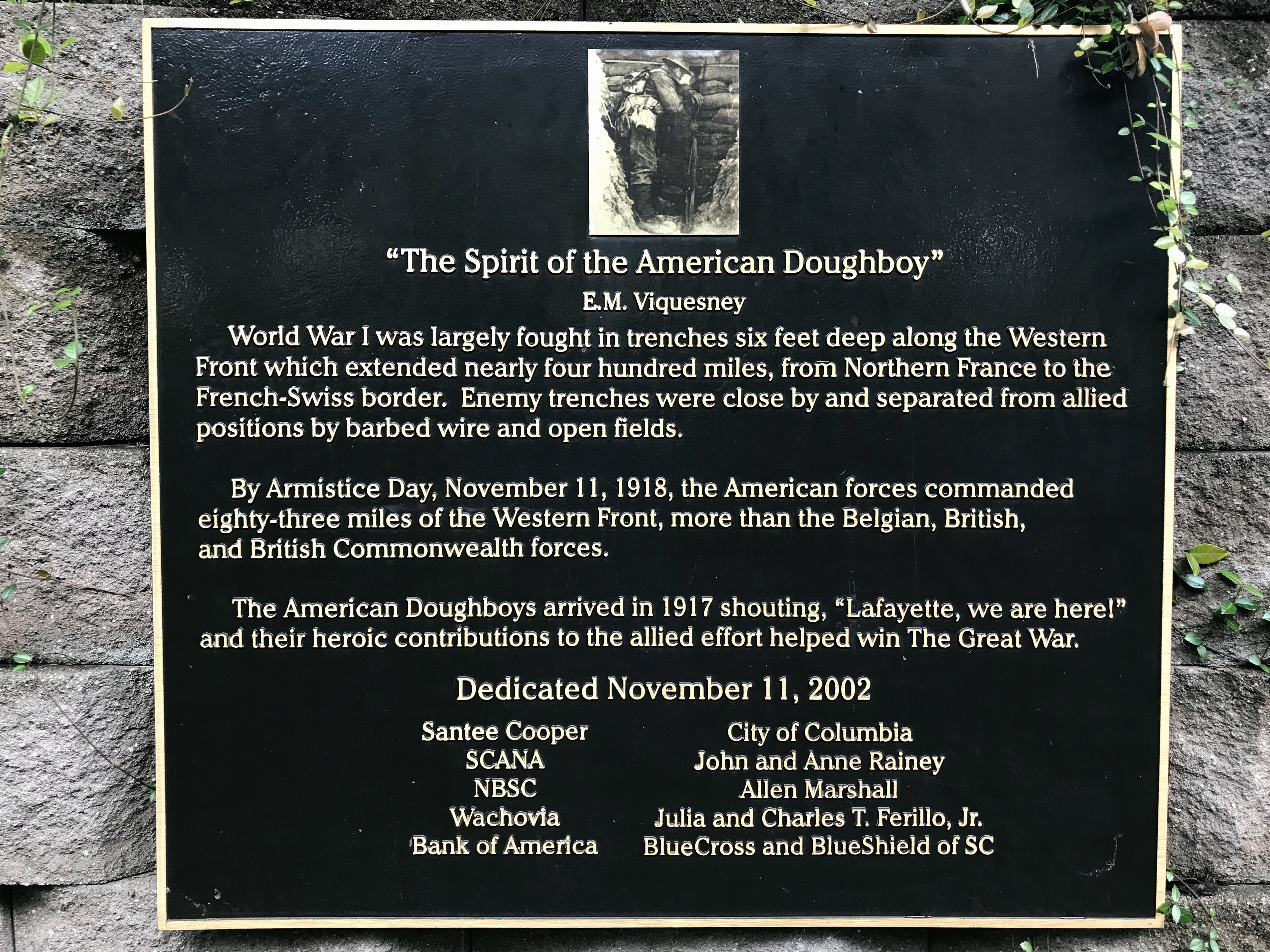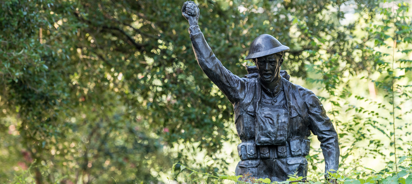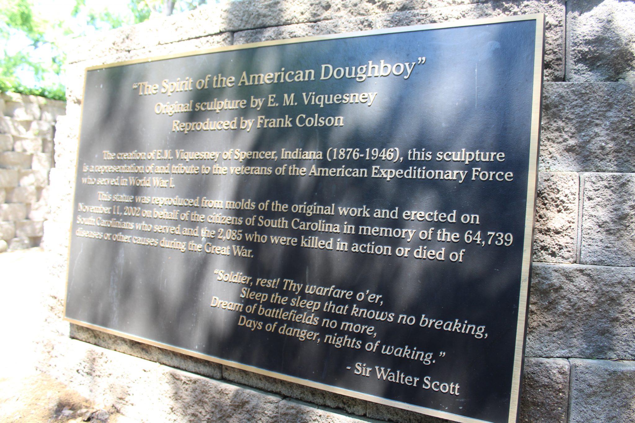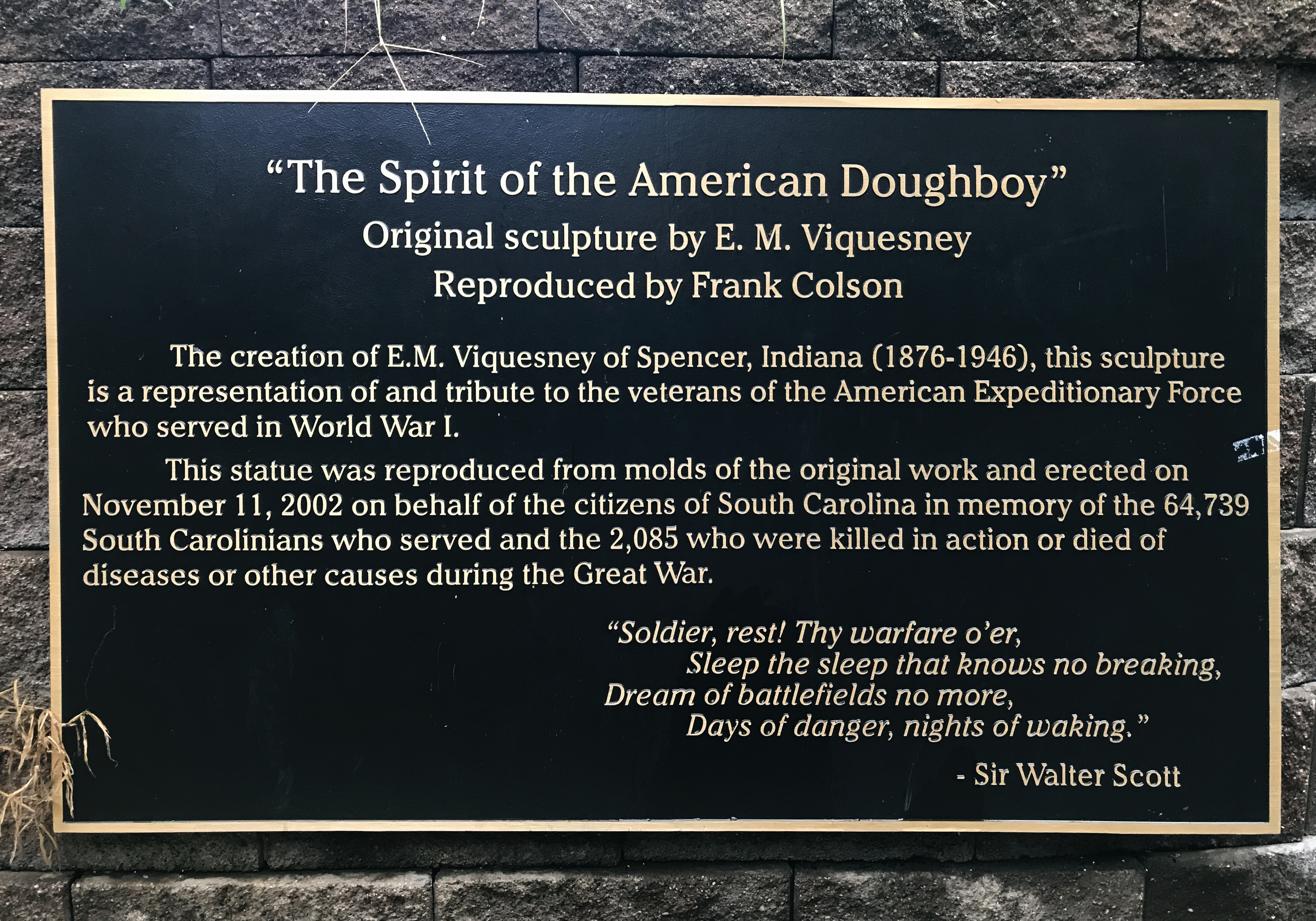 Dedicated November 11, 2002. This monument was erected on behalf of the citizens of South Carolina in memory of the South Carolinians who served during the Great War. It features the sculpture entitled "The Spirit of the American Doughboy", originally sculpted by E. M. Viquesney and reproduced here from a mold of an original; located in Clearwater, Florida; by Frank Colson. Plaques providing a brief history of the Doughboys of the Great War, the first American troops in World War I, are mounted on interior walls of the monument.