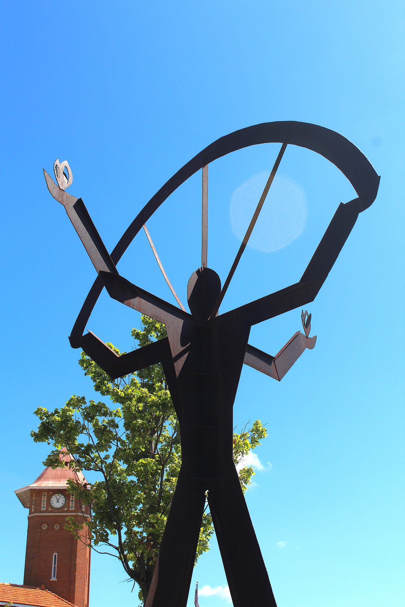 Originally, it was to go on a pedestal in front of the newly restored Eau Claire Town Hall. But some residents questioned the wisdom of putting a large piece of modern art in front of a graceful, turn-of-the-century building. So the statue was placed instead on a prominent corner at Hyatt Park, where is it visible from North Main & Monticello Rd.