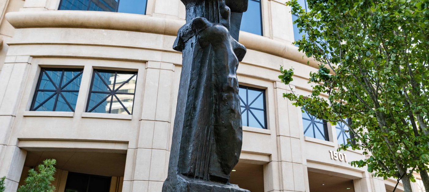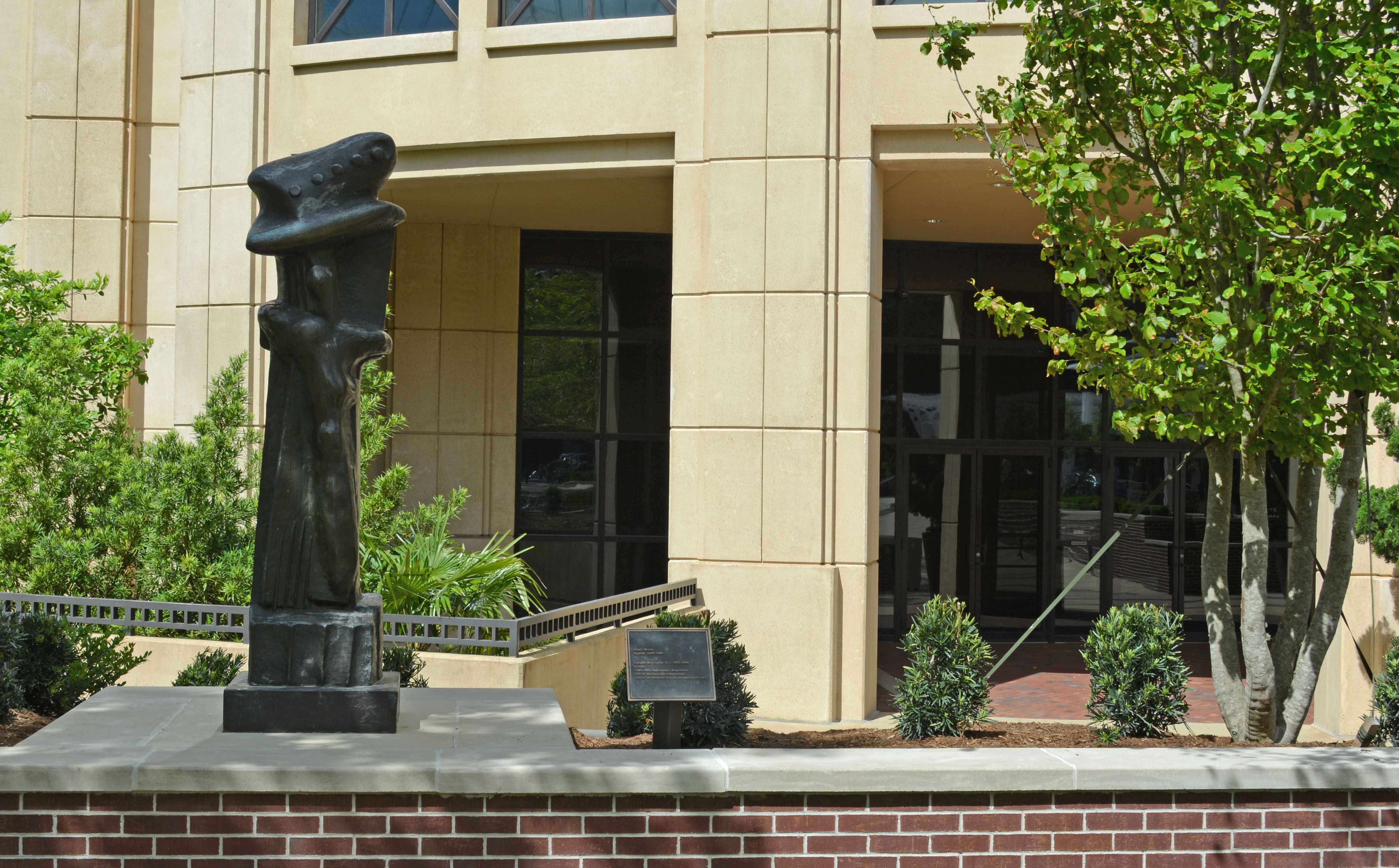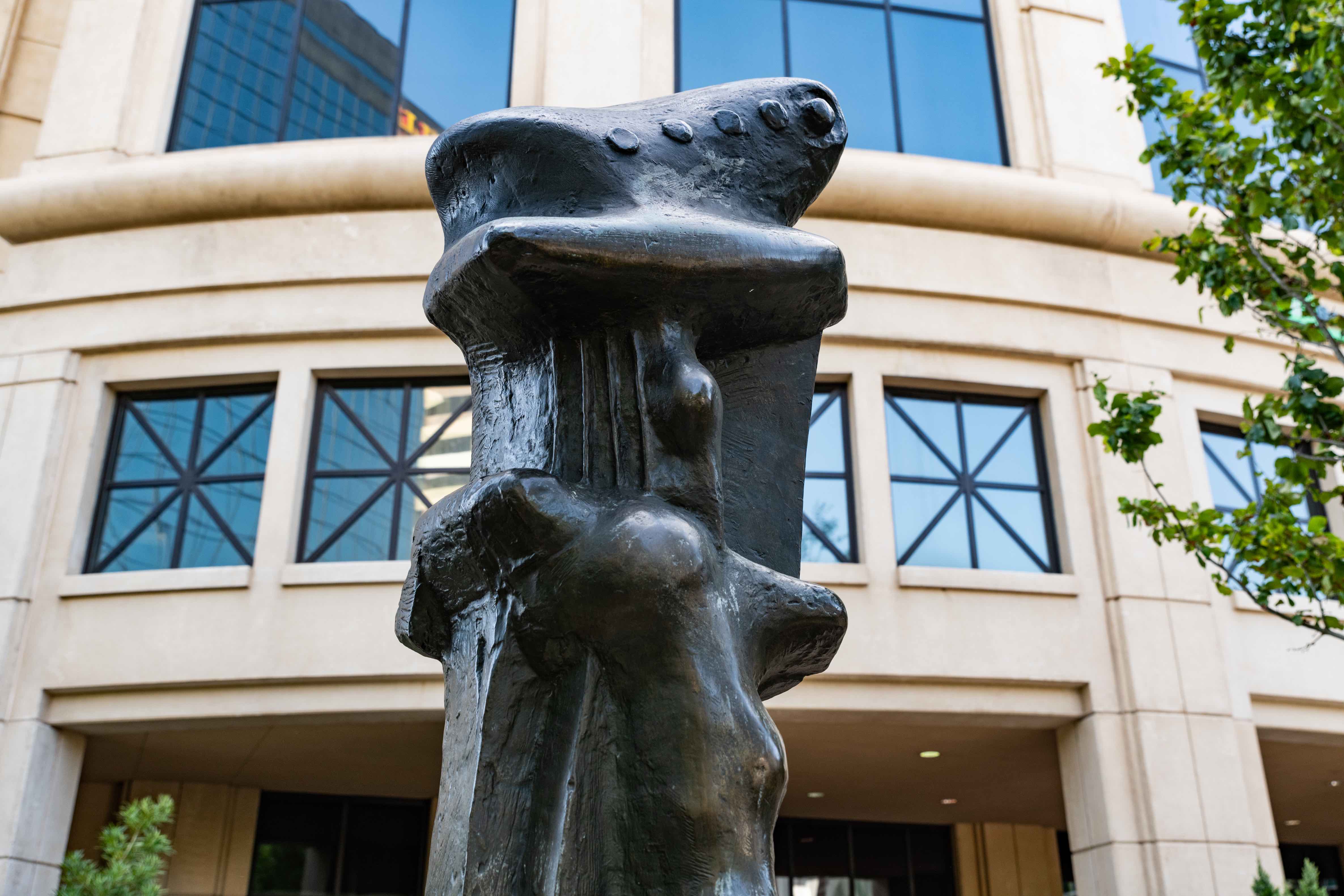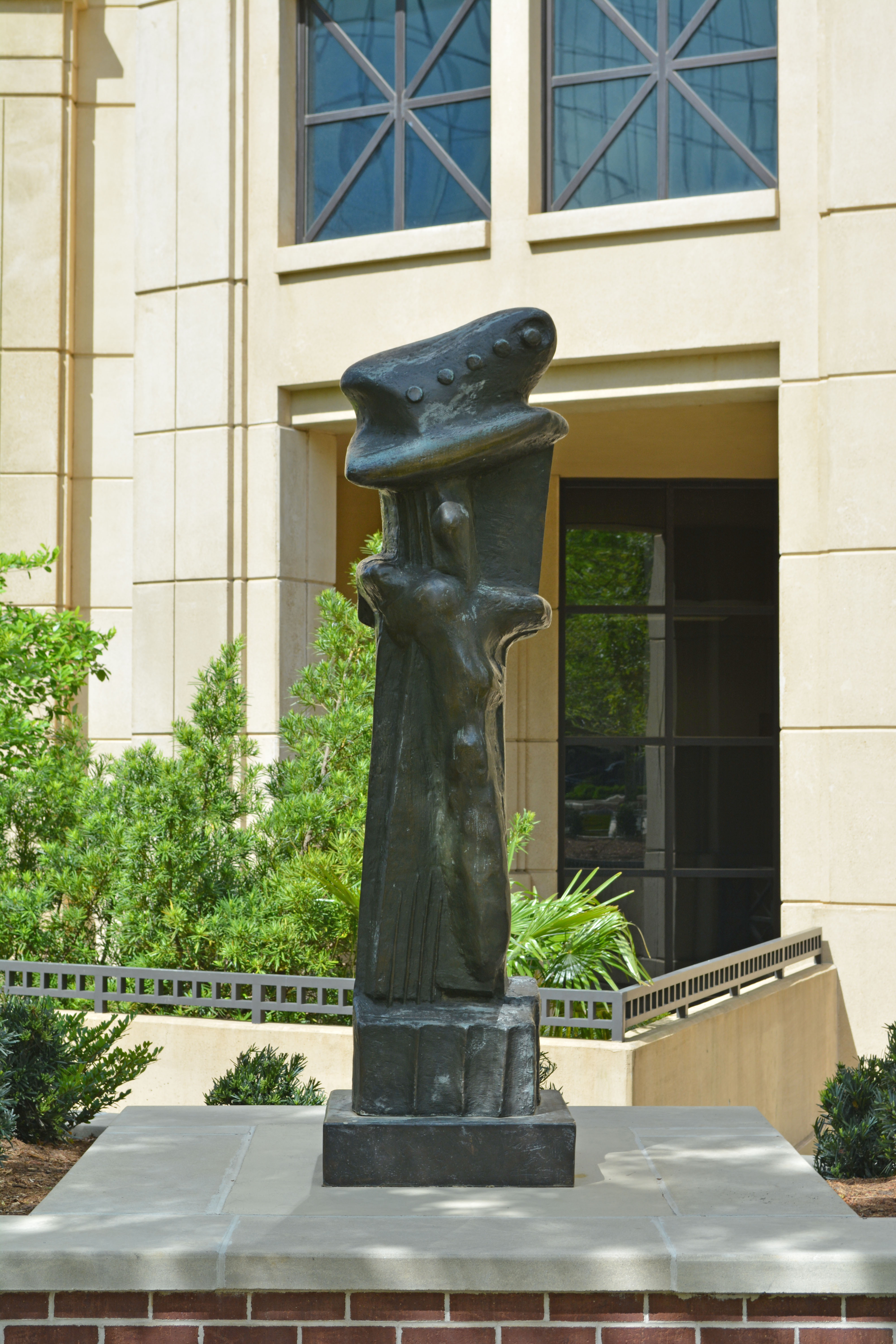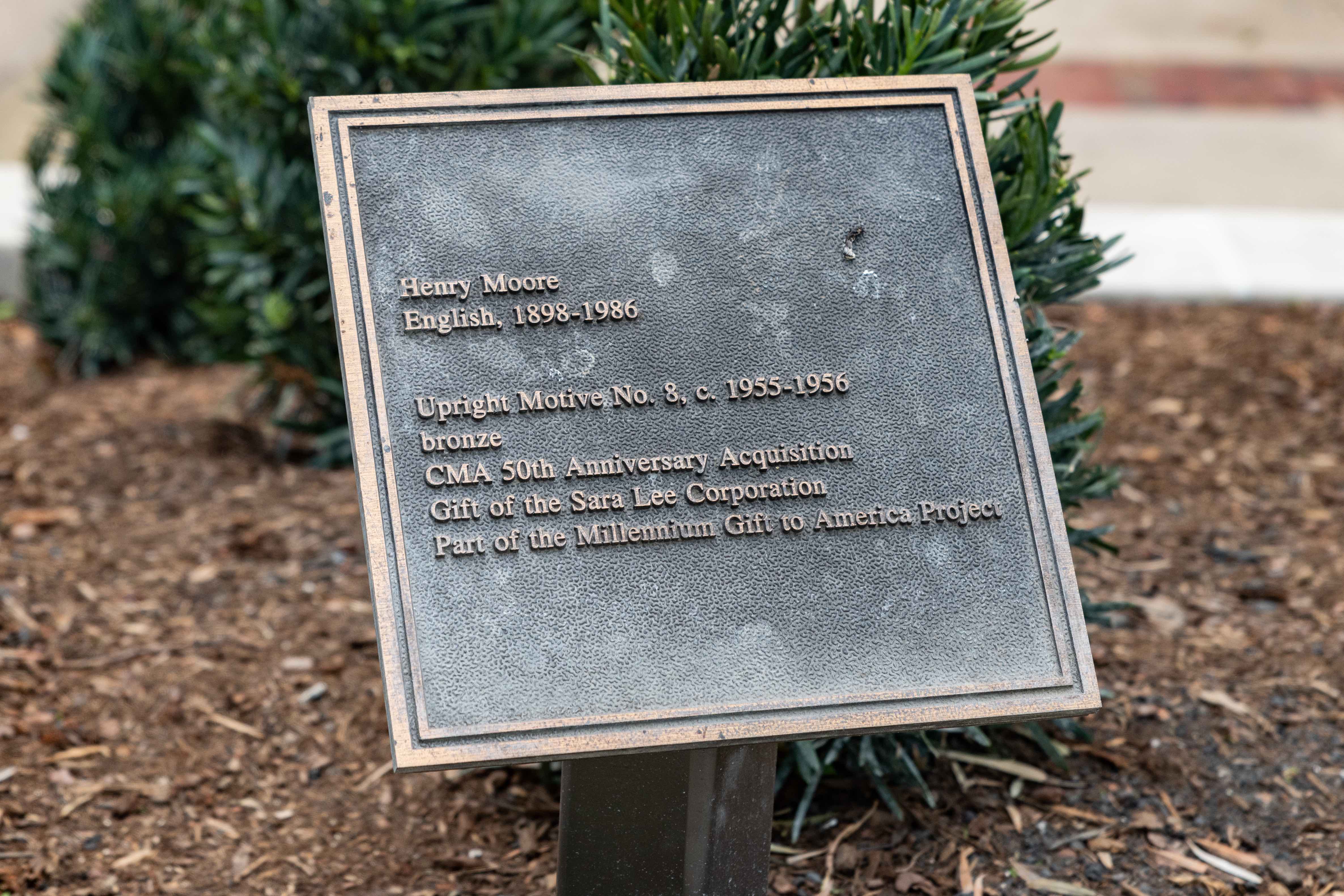 From the CMA collection notes - “Upright Motive is among a group of totemic vertical sculptures made by Henry Moore in the mid-1950s. Moore himself worked initially in small-scale wax and clay figurines, several of which he selected to be enlarged to human proportions in plaster. These plasters were then worked extensively by the artist before they were cast in bronze so as to achieve surface textures and subtleties of massing appropriate to their newly enlarged scale.